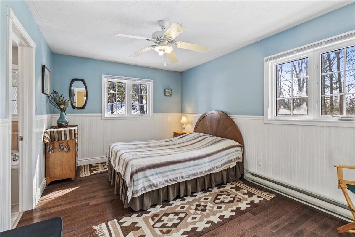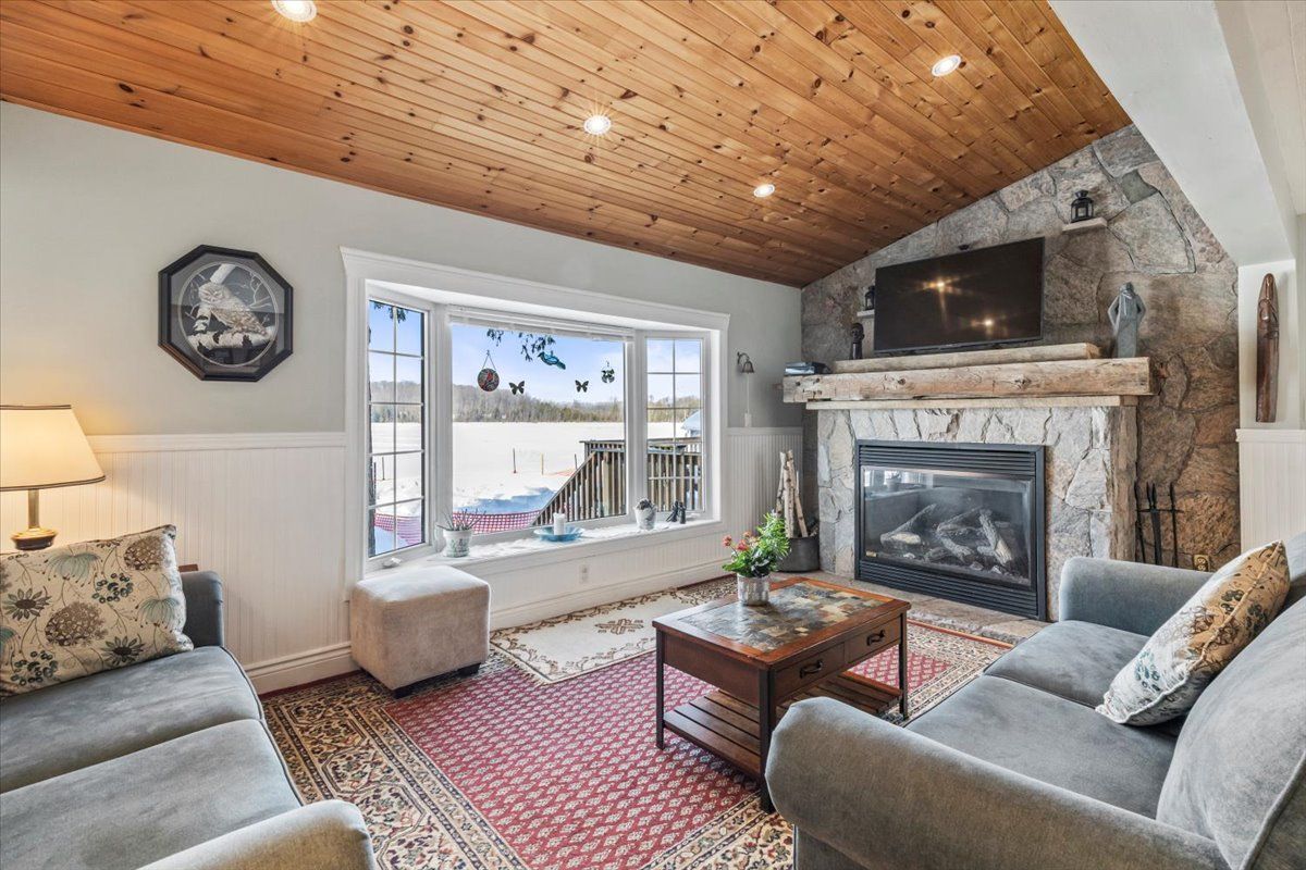 • Cozy living room with beautiful lake views and a fieldstone fireplace.