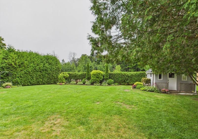 • Beautifully landscaped backyard with diverse trees and a privacy hedge.