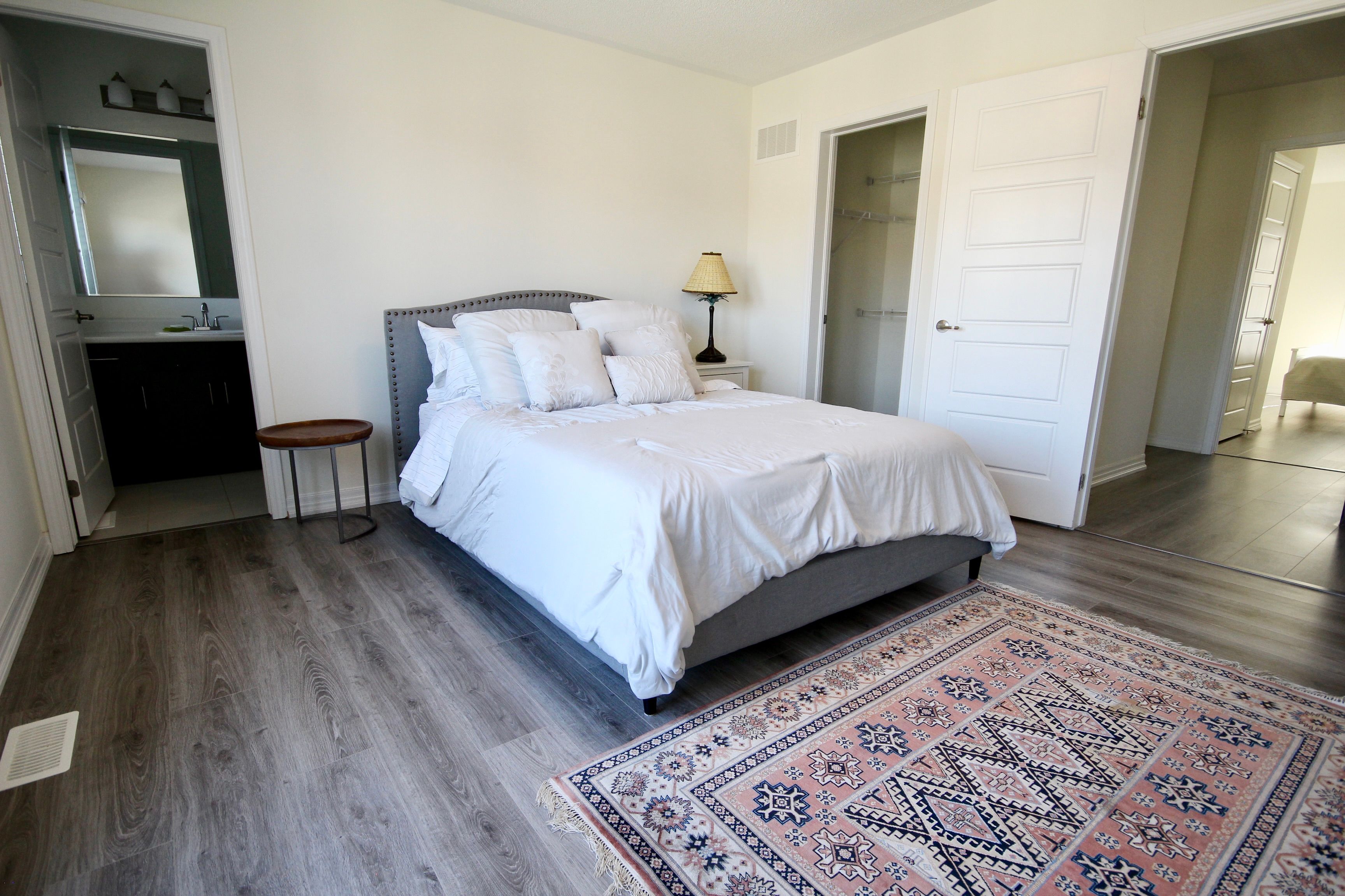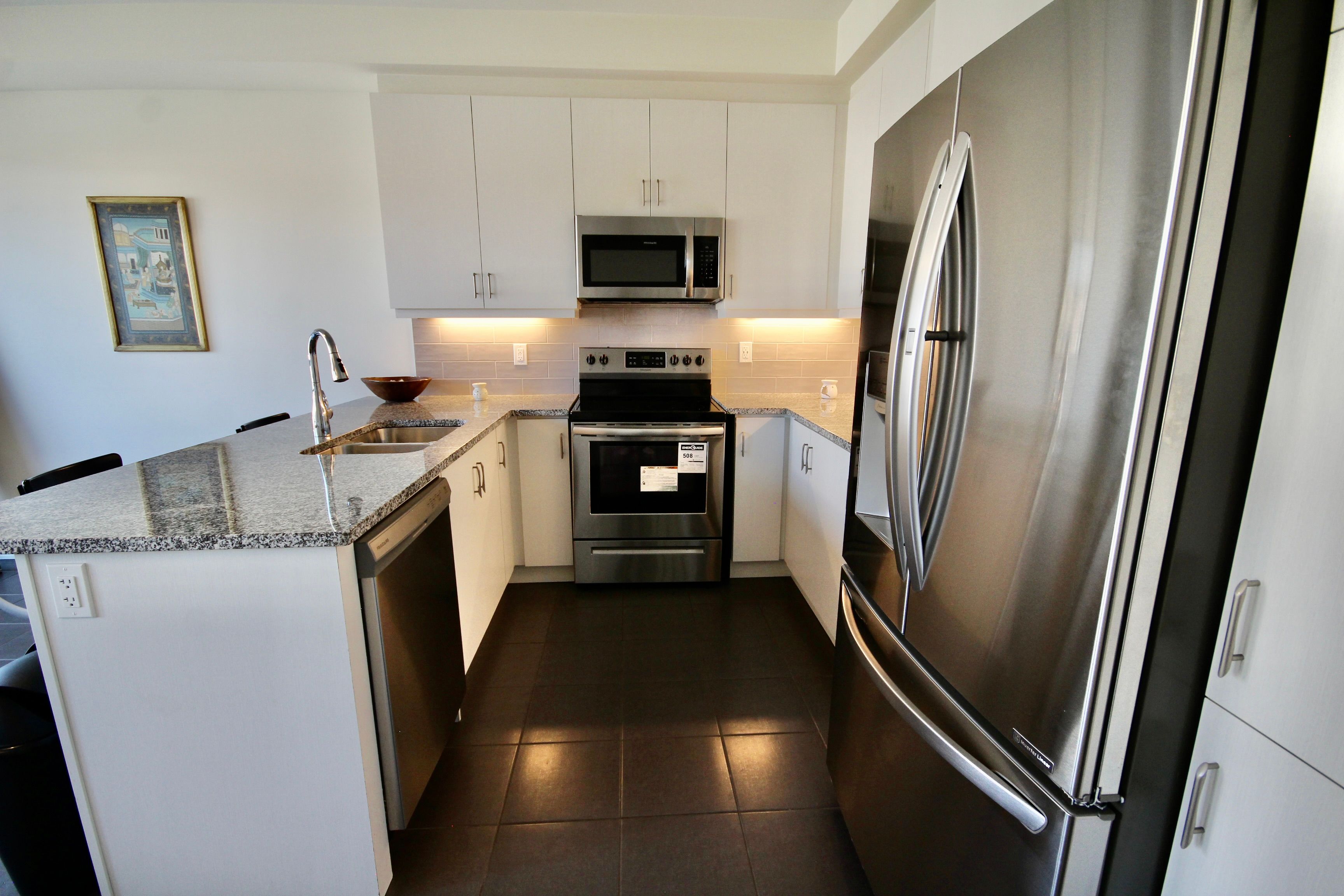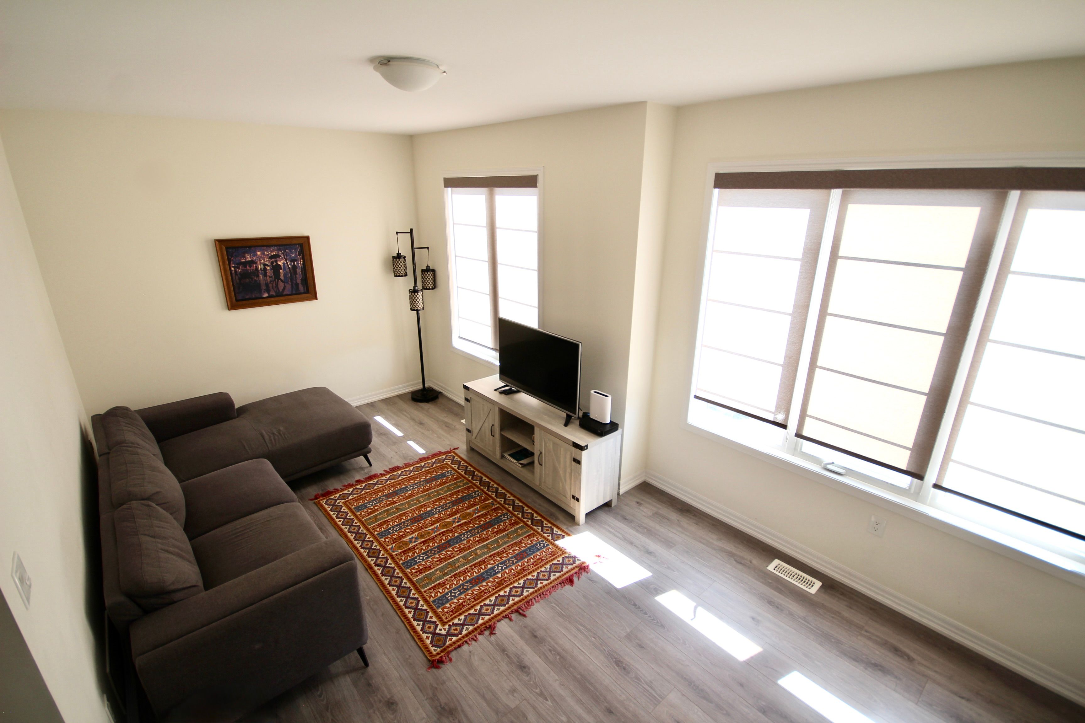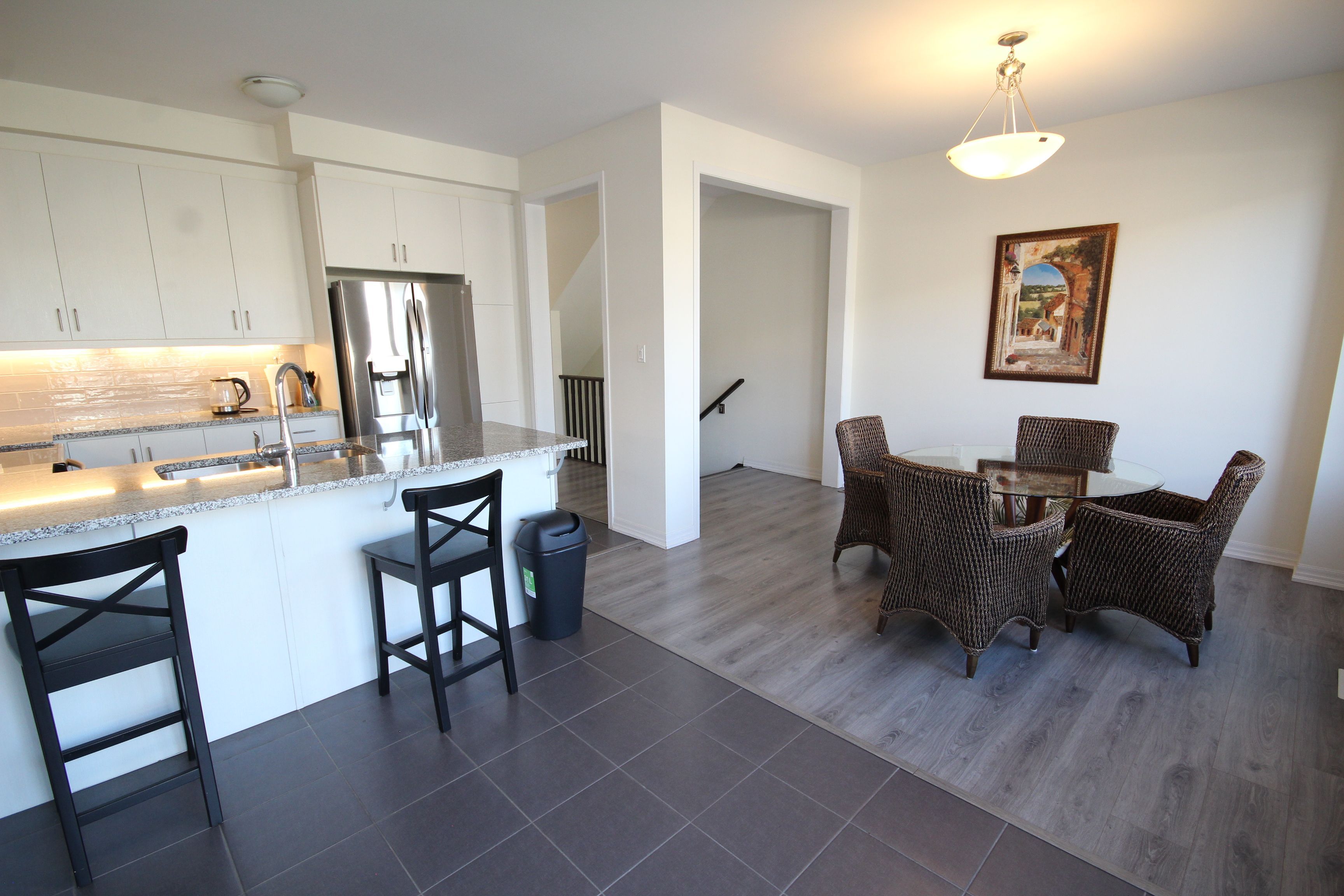 Discover modern elegance in this prestigious fully furnished 4-bedroom, 4-bathroom townhouse. Just 4 years new. Featuring 9 ceilings and wood floors throughout, this home is both stylish and functional. Spacious living: bright living room filled with lots of natural light. Gourmet kitchen: granite countertops, stainless steel appliances (french door fridge, stove, built-in microwave, and dishwasher), with a cozy breakfast area and a separate dining room, walkout to a large private terrace, perfect for relaxing or entertaining. Primary suite: master bedroom with walk-in closet and private 3-piece en-suite. Garage: wide double-car garage with ev charging outlet. Fully furnished: thoughtfully equipped with quality furniture, ideally located just minutes from major highways, grocery stores, and top shopping destinations, this home delivers the perfect blend of luxury, convenience, and modern living for individuals and families.