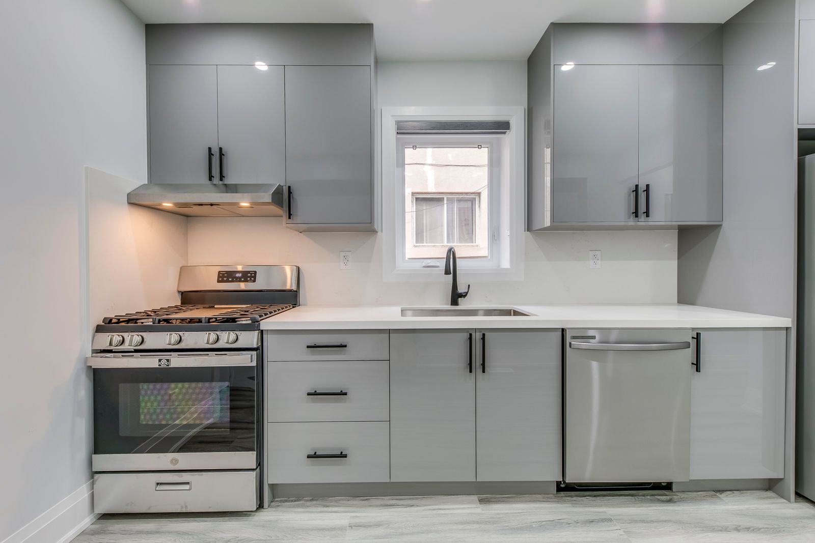 • Modern kitchen featuring quartz countertops and stainless steel appliances.