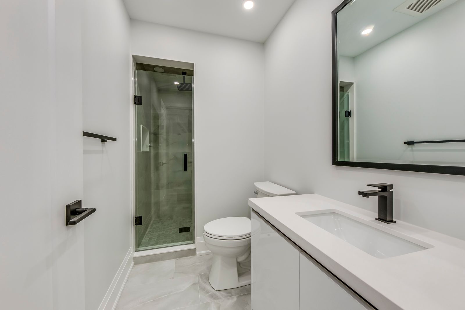 • Spa-like bathroom with a glass walk-in shower and stylish fixtures.