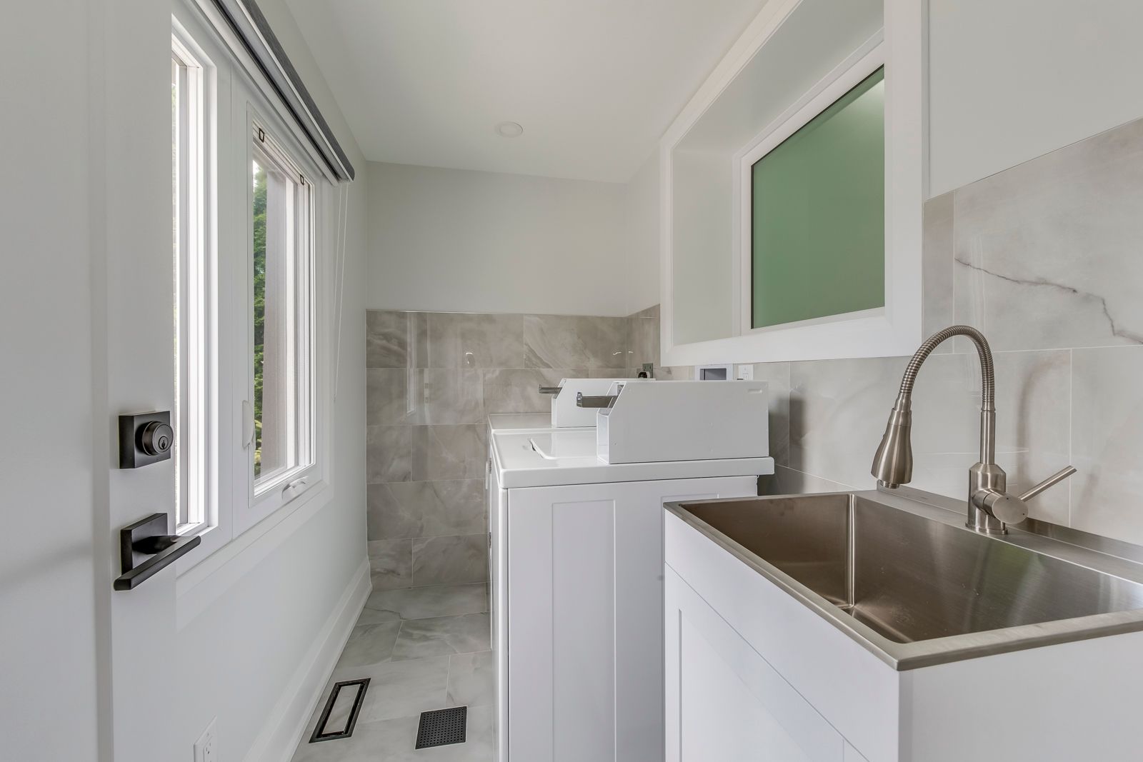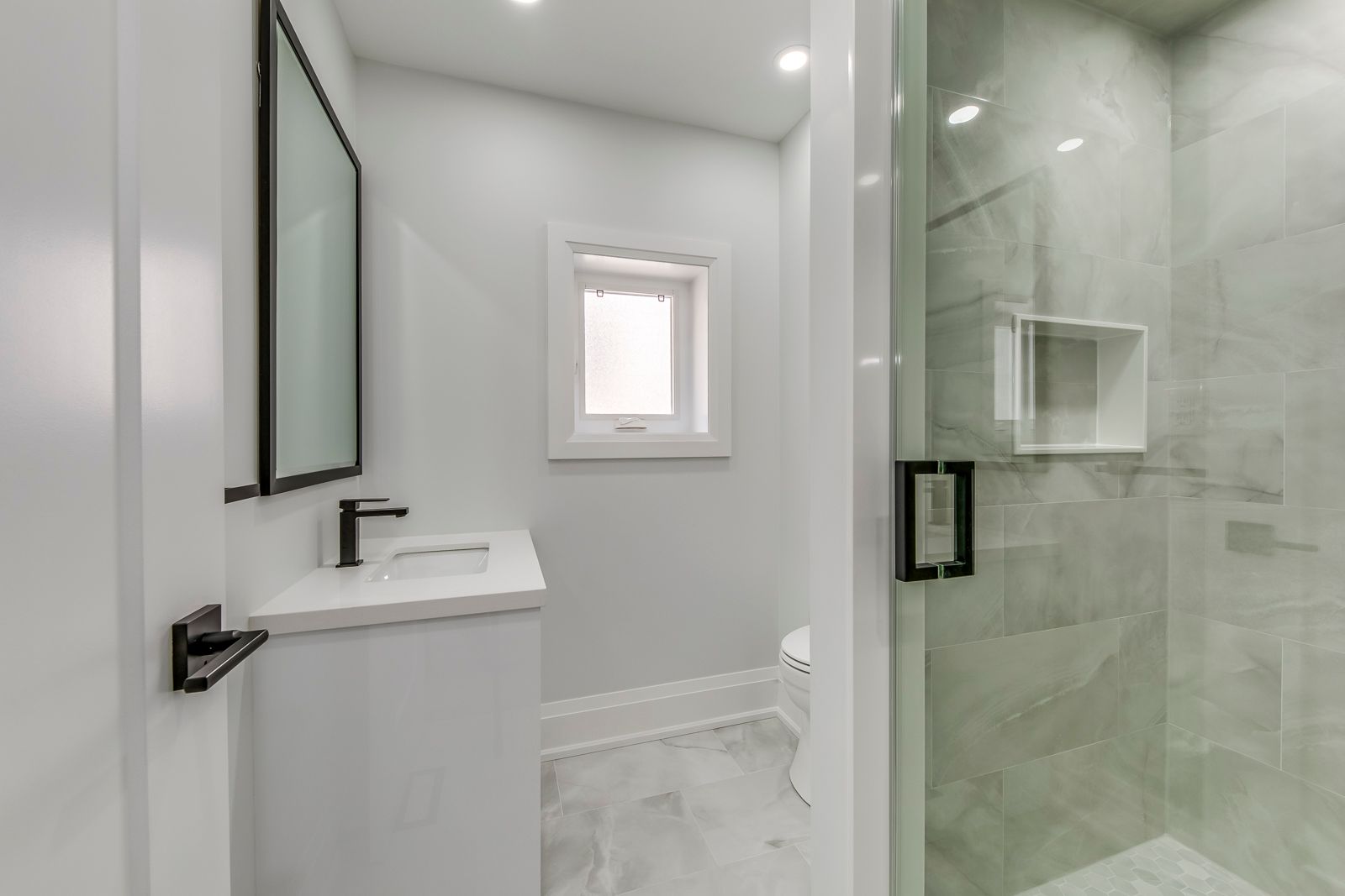 • Renovated bathroom featuring a glass-enclosed shower and contemporary tile.