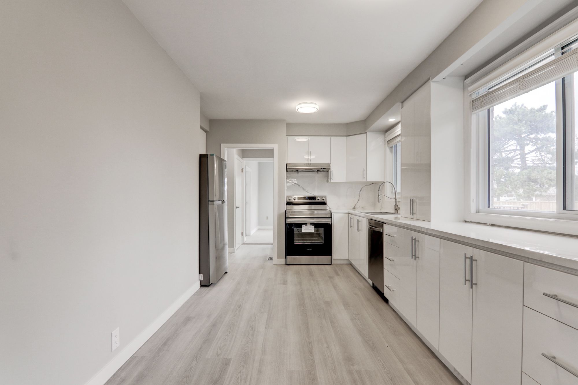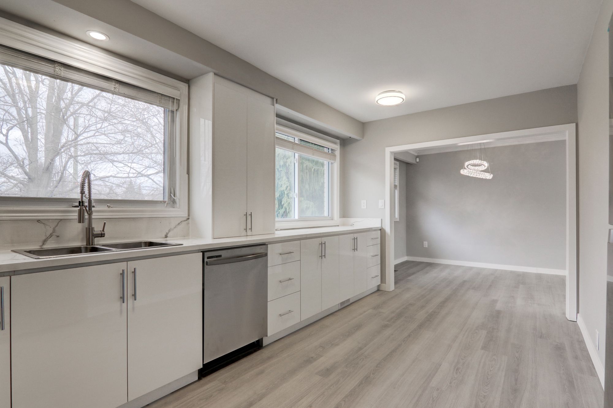 • Modern kitchen with stainless steel appliances and quartz countertops.