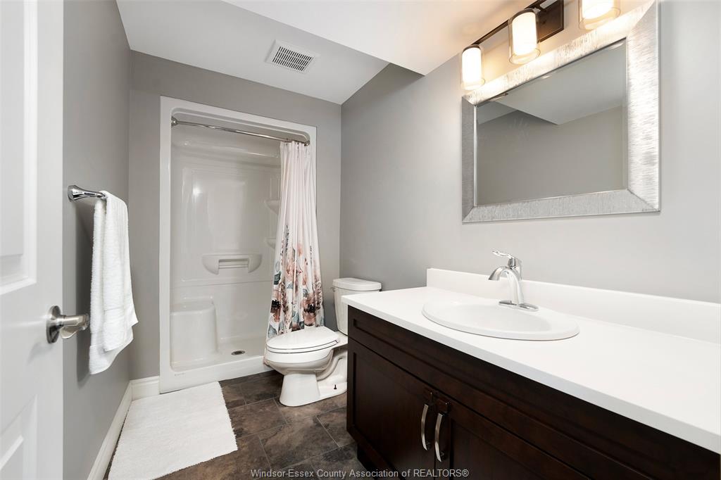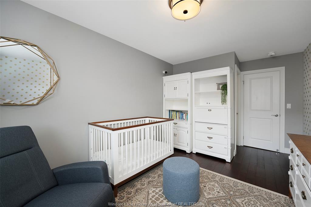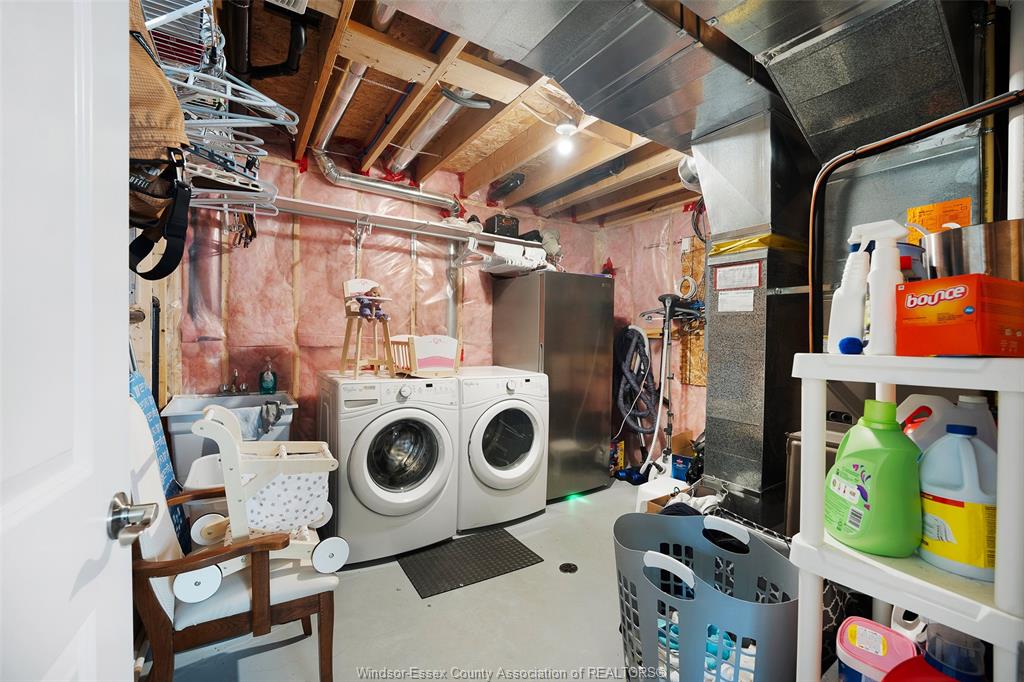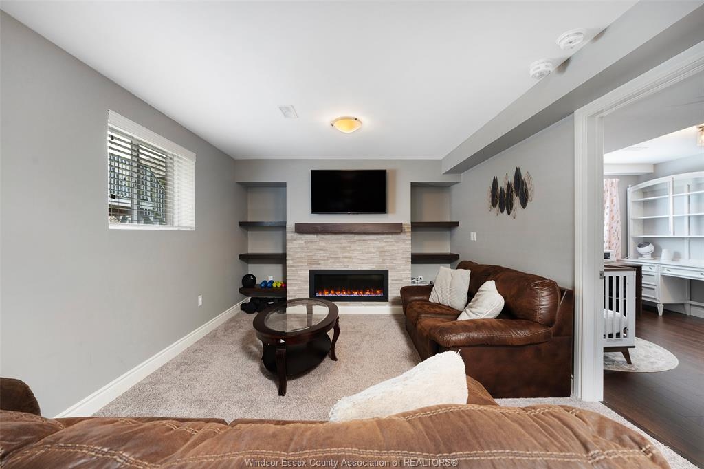 • Fully finished lower level featuring a gas fireplace and custom shelving.
