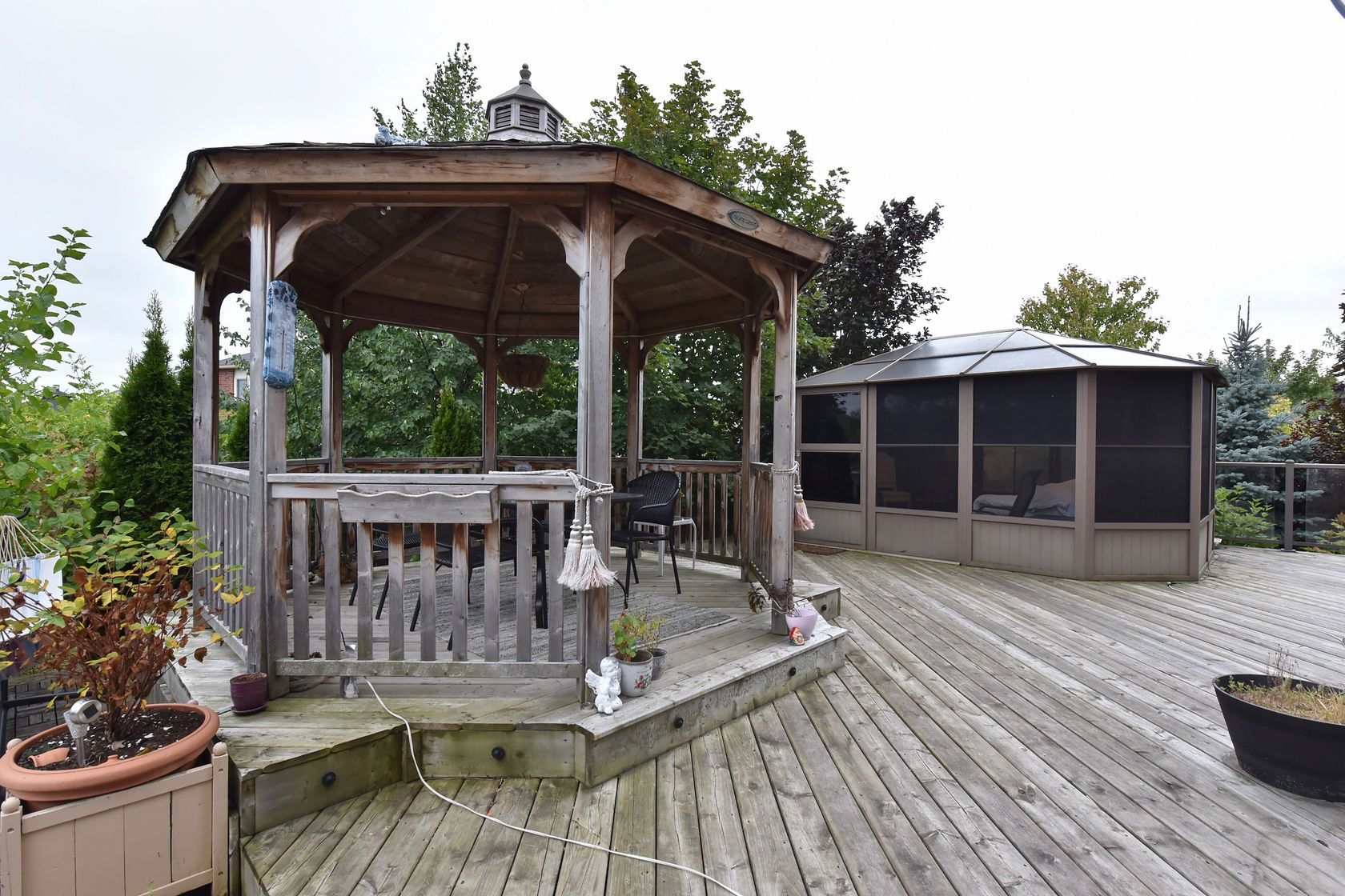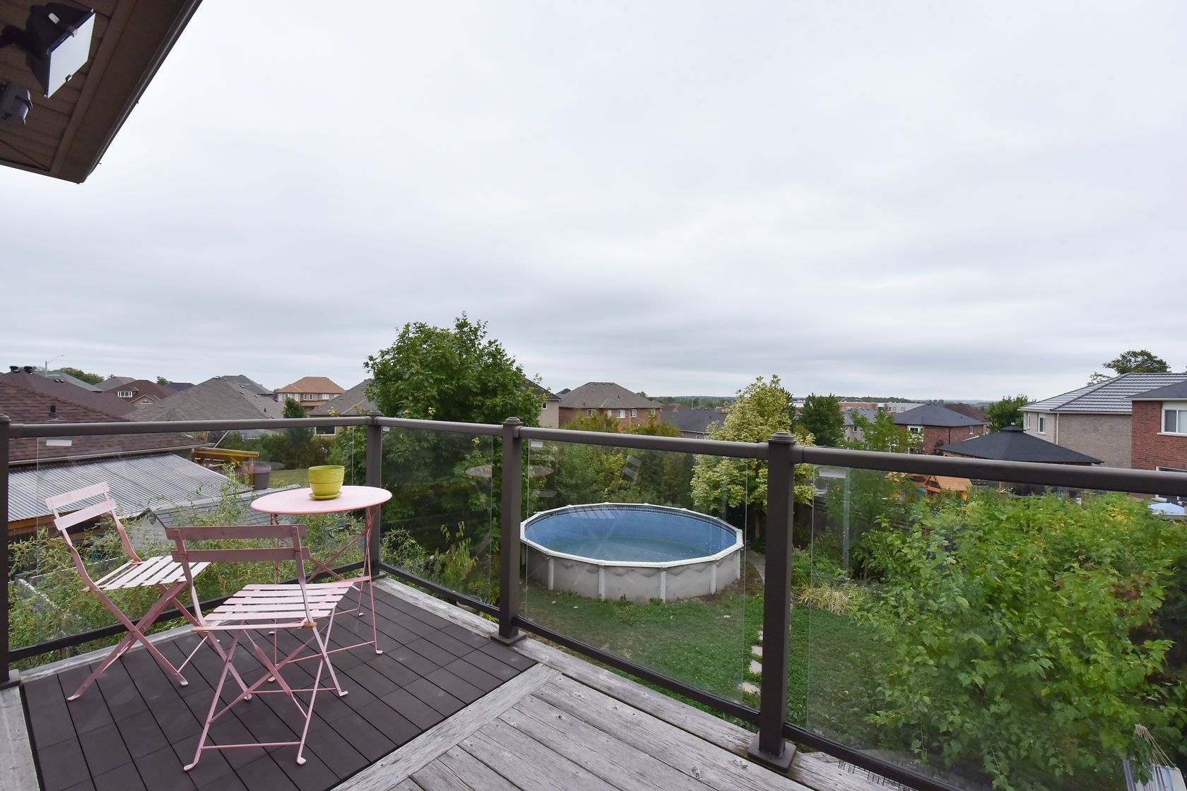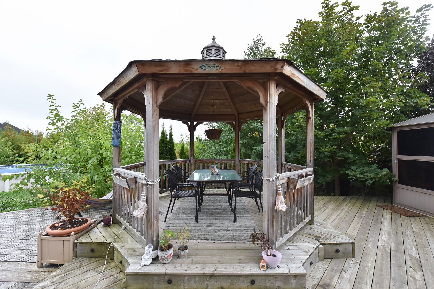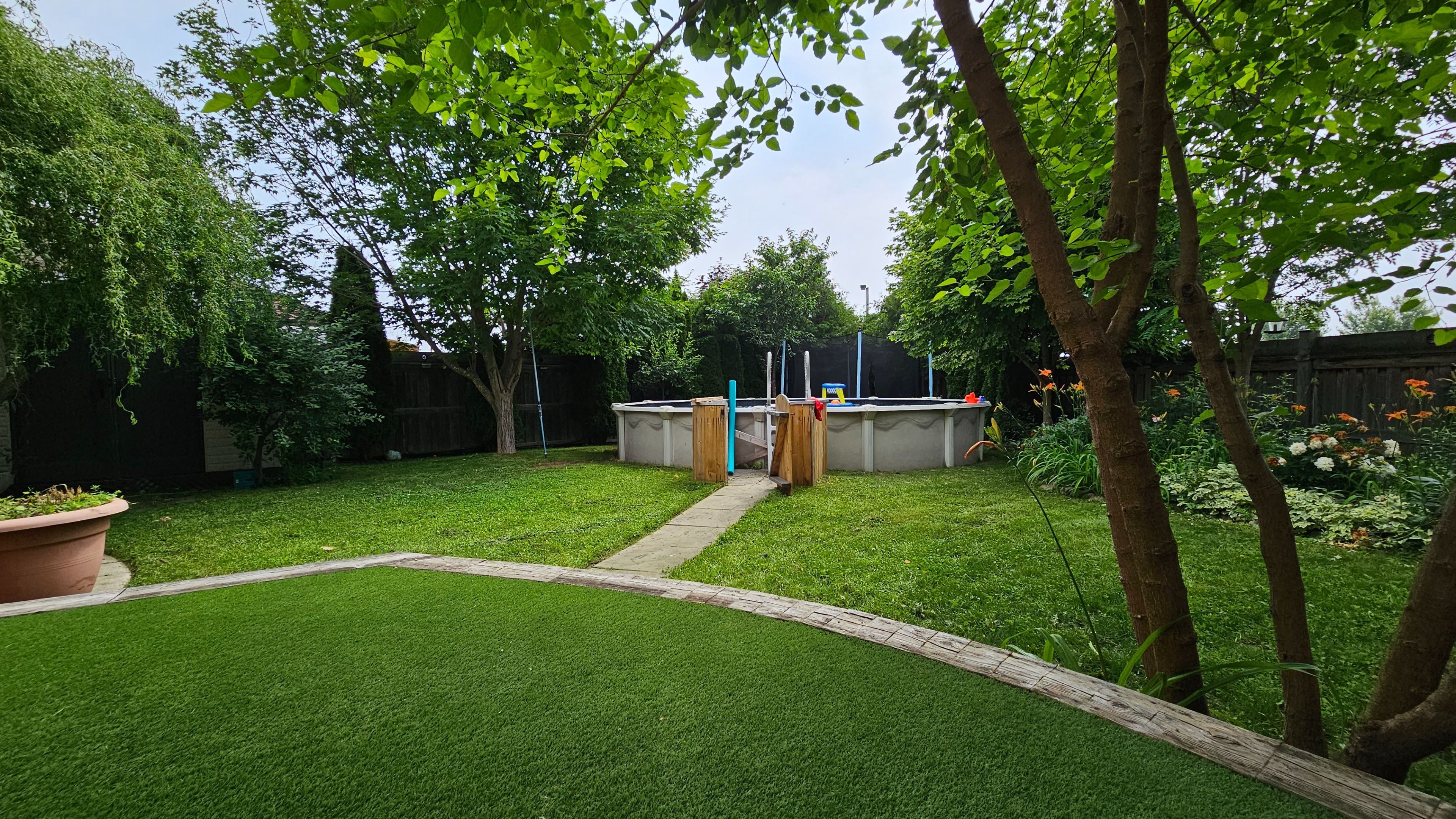 • Beautifully landscaped backyard with an above-ground pool and deck.