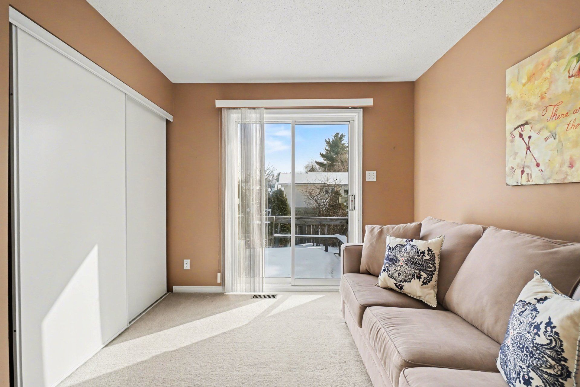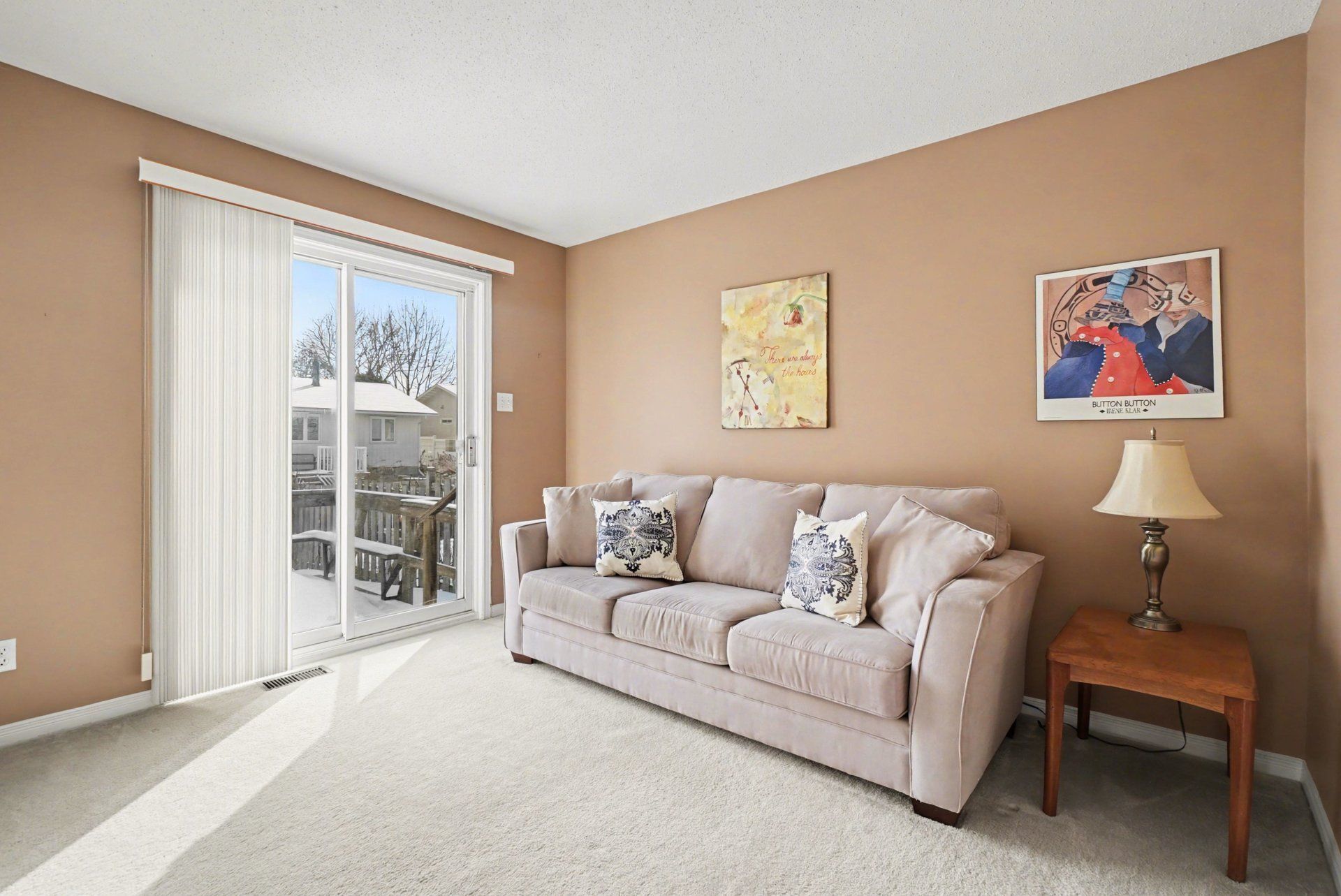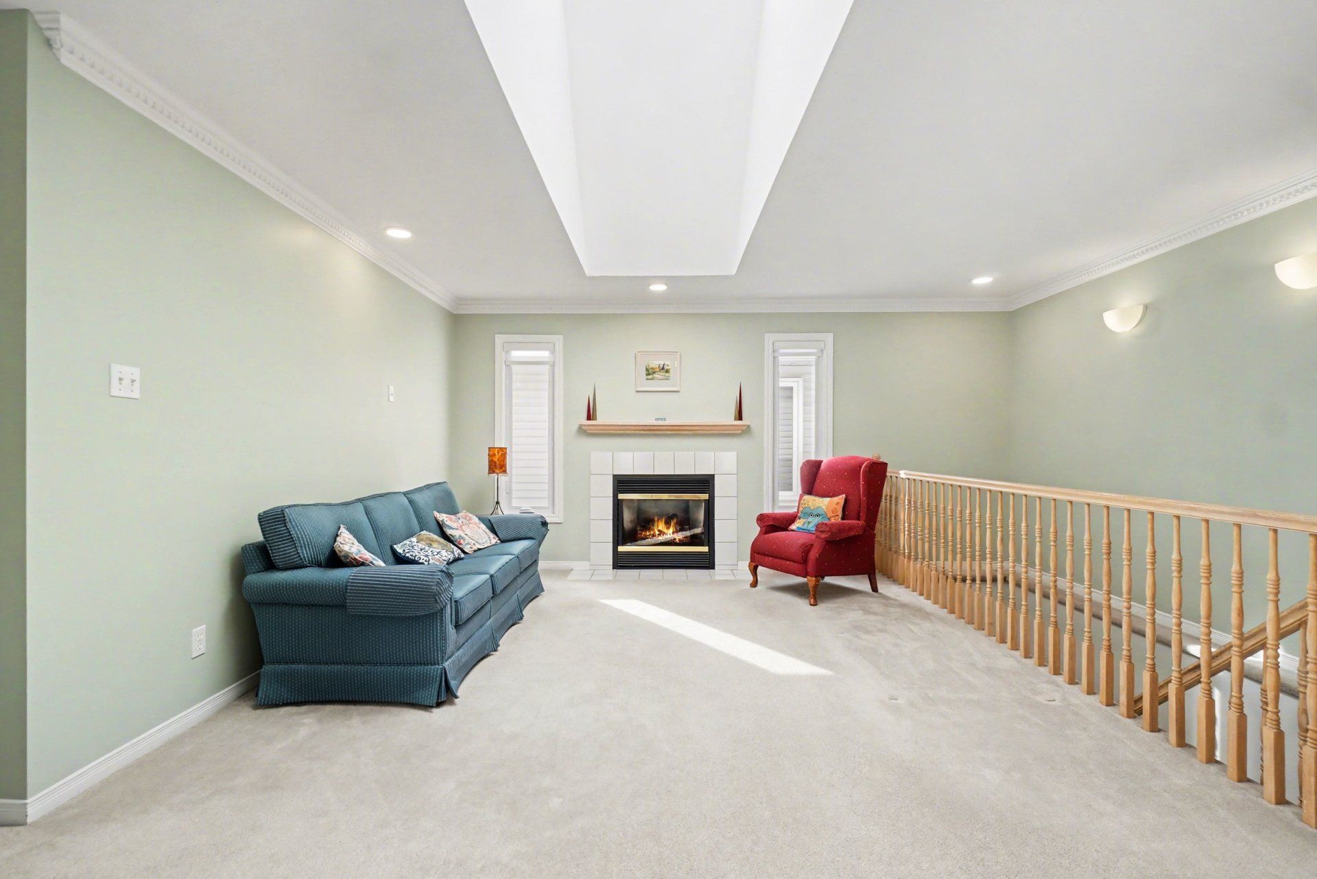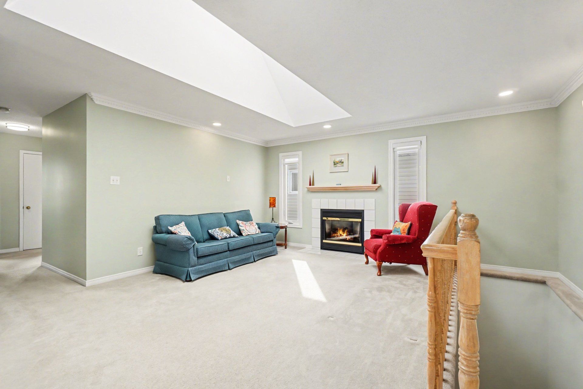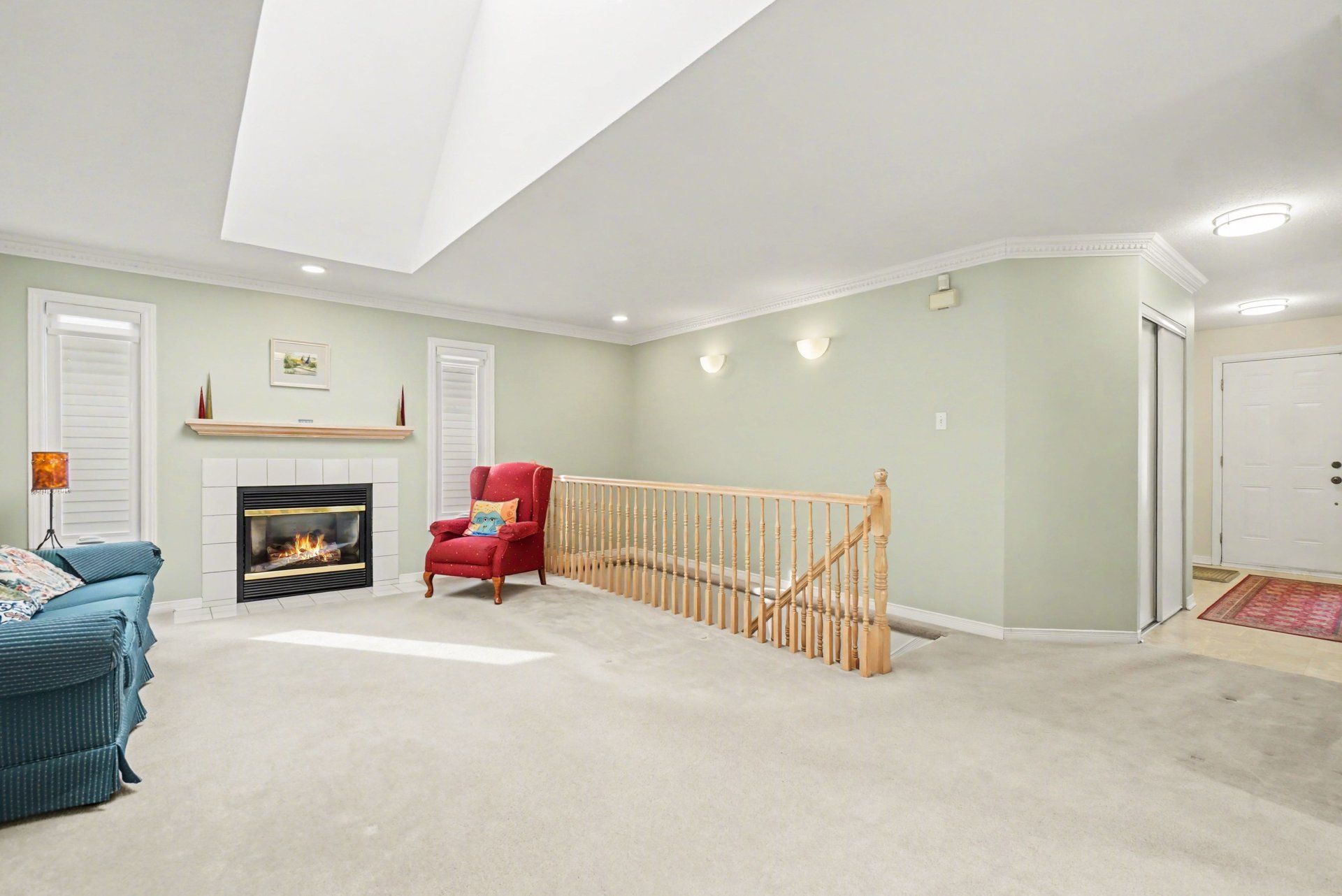 • Spacious living room with natural light and cozy fireplace.
