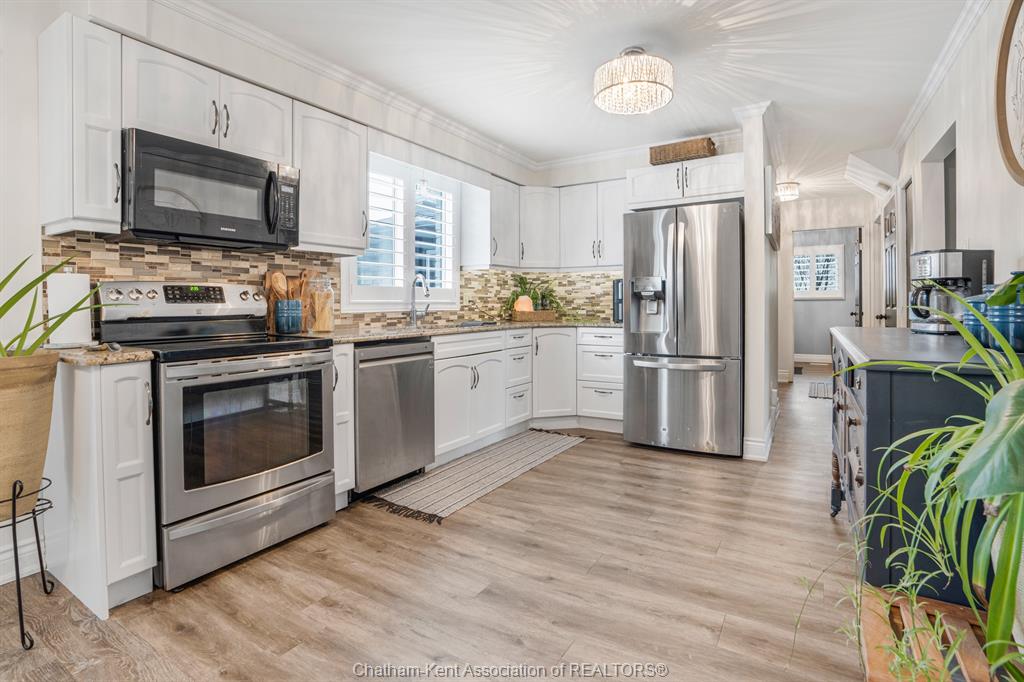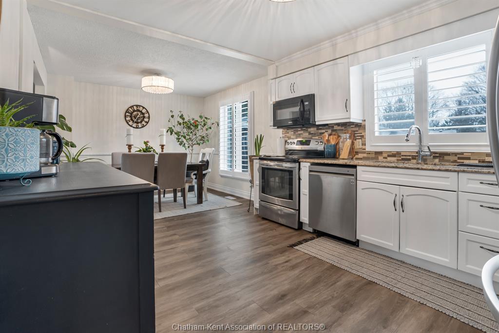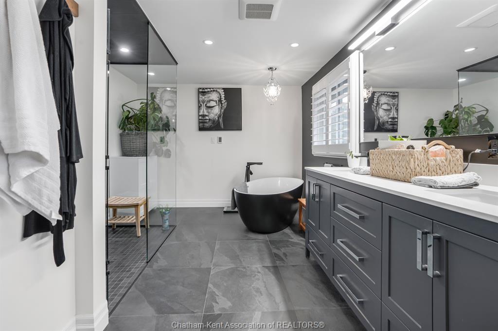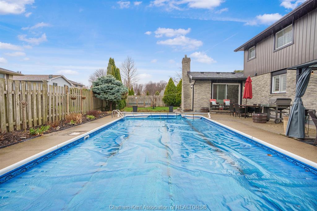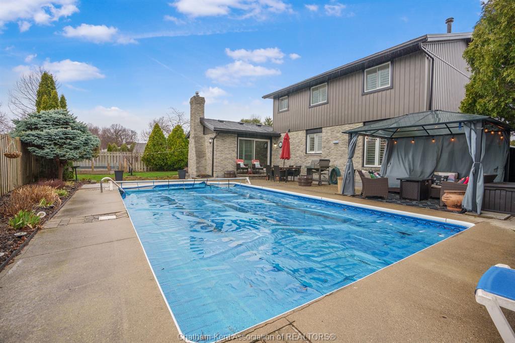 Welcome to this beautifully updated and truly turn-key two-storey home on chatham’s desirable north side—where thoughtful upgrades meet everyday comfort and backyard luxury. This inviting family home features 3 spacious bedrooms on the upper level and 2 well-appointed bathrooms, including a stunning, fully renovated main bath showcasing heated italian tile flooring, a heated custom glass shower with dual heads (including rainfall), a soaker tub, and a solid wood vanity topped with quartz and double sinks—your own private retreat. The main floor offers a warm and functional layout, highlighted by a cozy gas fireplace, updated powder room with a custom wood vanity and granite countertop, and modern finishes throughout. Recent upgrades within the past five years include a steel roof, siding, insulation, fascia, soffits, downspouts, front bay window, and garage improvements—providing peace of mind and long-term value. Downstairs, the fully finished basement expands your living space with a rec room with proper egress window, den (currently used as a home gym), additional shower, new carpet—perfect for guests or growing families. Step outside to your private backyard oasis featuring an in-ground pool with heater, updated pool systems, a charming gazebo, and a custom cedar privacy wall—ideal for entertaining or relaxing all summer long. Eavestrough covers add to the home’s low-maintenance appeal. With updated flooring throughout, solid wood interior doors, and meticulous care evident at every turn, this home blends style, comfort, and functionality in one exceptional package. A rare opportunity to own a move-in-ready home in a sought-after neighbourhood—don’t miss it.