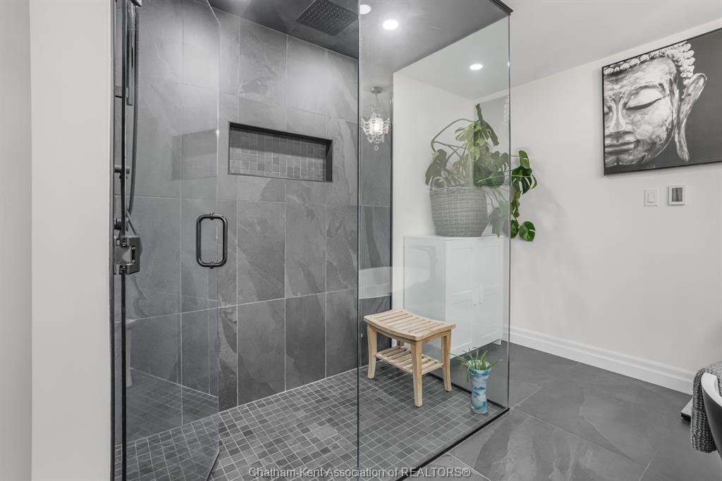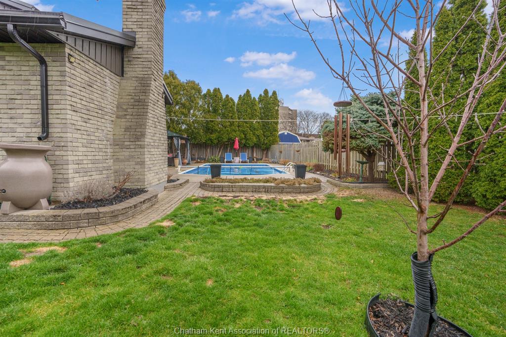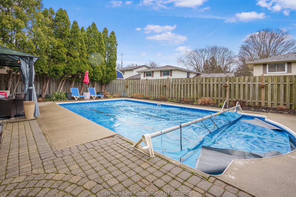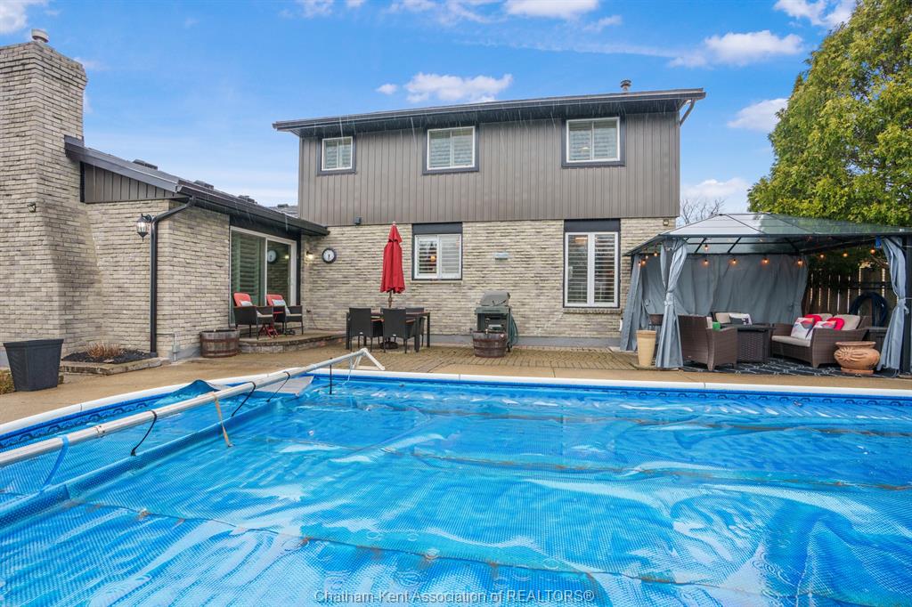 Welcome to this beautifully updated and truly turn-key two-storey home on chatham’s desirable north side—where thoughtful upgrades meet everyday comfort and backyard luxury. This inviting family home features 3 spacious bedrooms on the upper level and 2 well-appointed bathrooms, including a stunning, fully renovated main bath showcasing heated italian tile flooring, a heated custom glass shower with dual heads (including rainfall), a soaker tub, and a solid wood vanity topped with quartz and double sinks—your own private retreat. The main floor offers a warm and functional layout, highlighted by a cozy gas fireplace, updated powder room with a custom wood vanity and granite countertop, and modern finishes throughout. Recent upgrades within the past five years include a steel roof, siding, insulation, fascia, soffits, downspouts, front bay window, and garage improvements—providing peace of mind and long-term value. Downstairs, the fully finished basement expands your living space with a rec room with proper egress window, den (currently used as a home gym), additional shower, new carpet—perfect for guests or growing families. Step outside to your private backyard oasis featuring an in-ground pool with heater, updated pool systems, a charming gazebo, and a custom cedar privacy wall—ideal for entertaining or relaxing all summer long. Eavestrough covers add to the home’s low-maintenance appeal. With updated flooring throughout, solid wood interior doors, and meticulous care evident at every turn, this home blends style, comfort, and functionality in one exceptional package. A rare opportunity to own a move-in-ready home in a sought-after neighbourhood—don’t miss it.