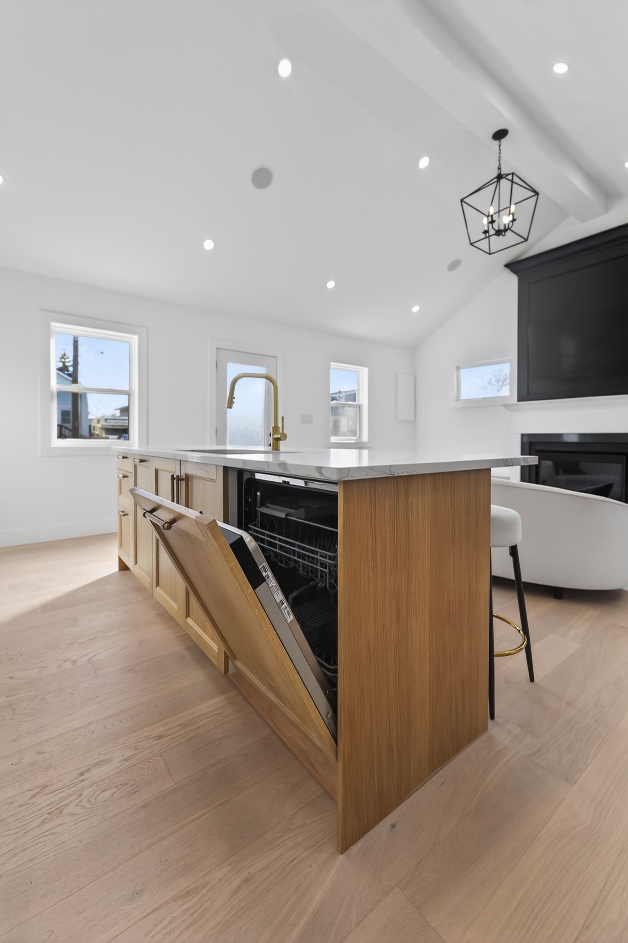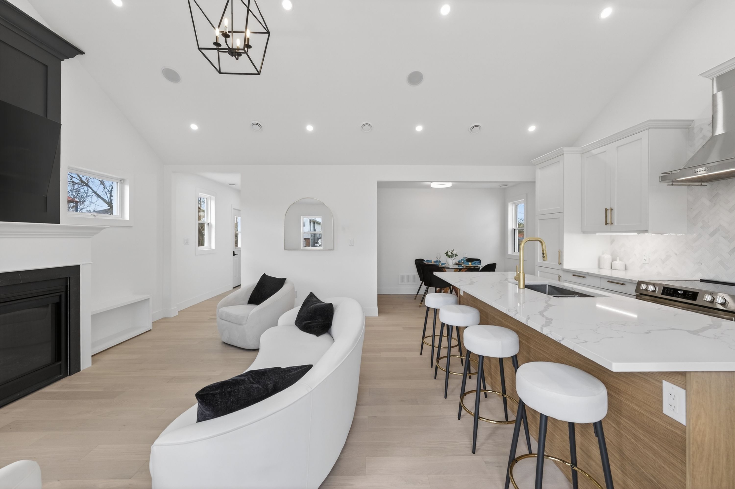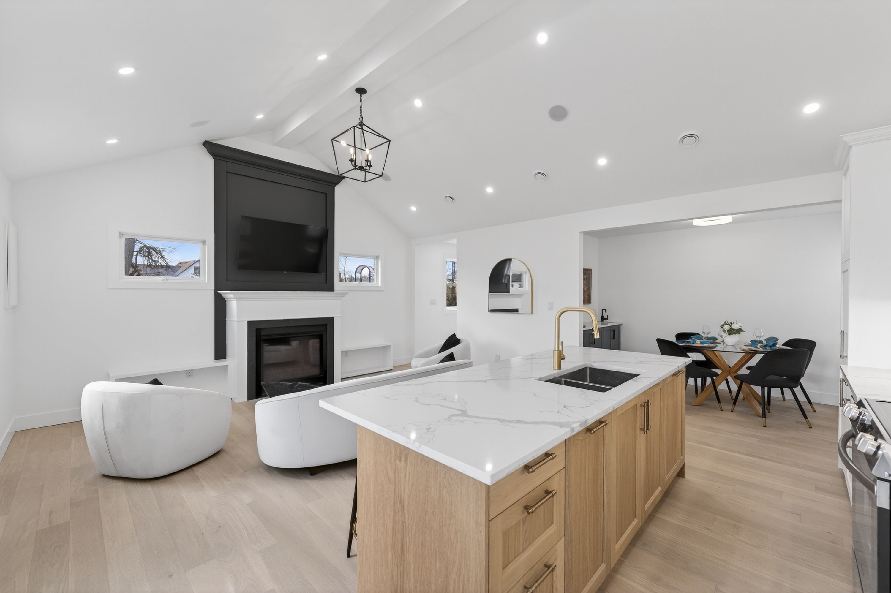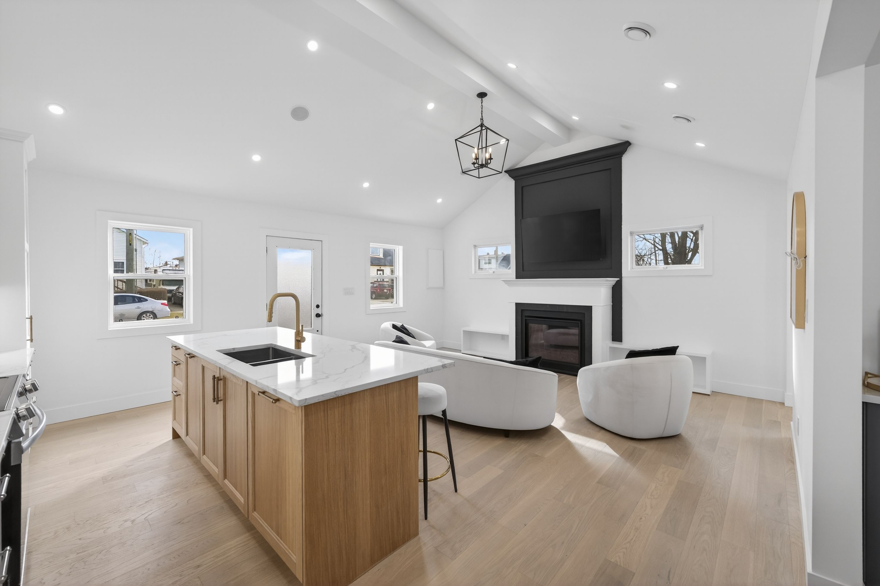 • Bright open-concept kitchen and living room with a gas fireplace.