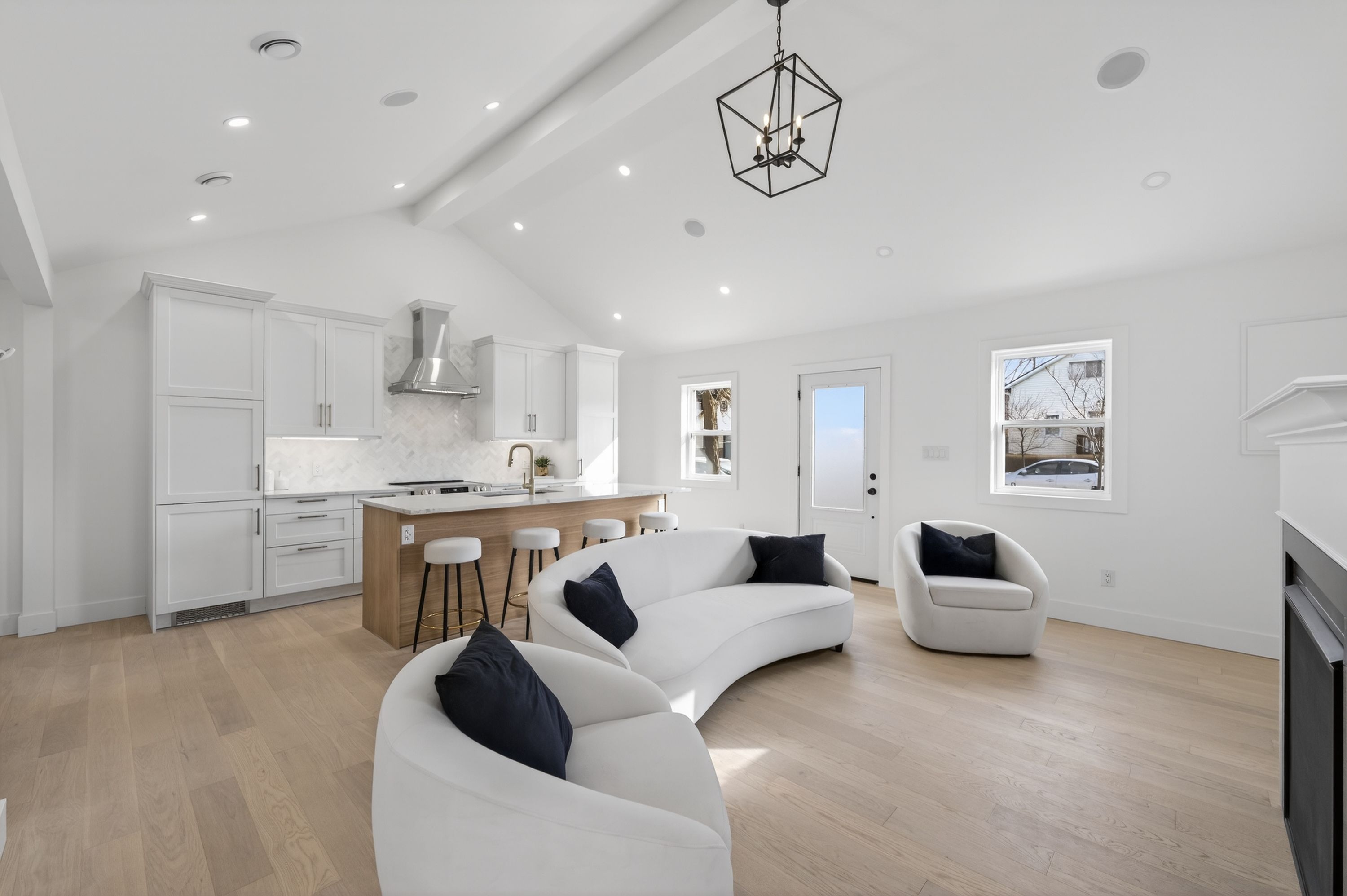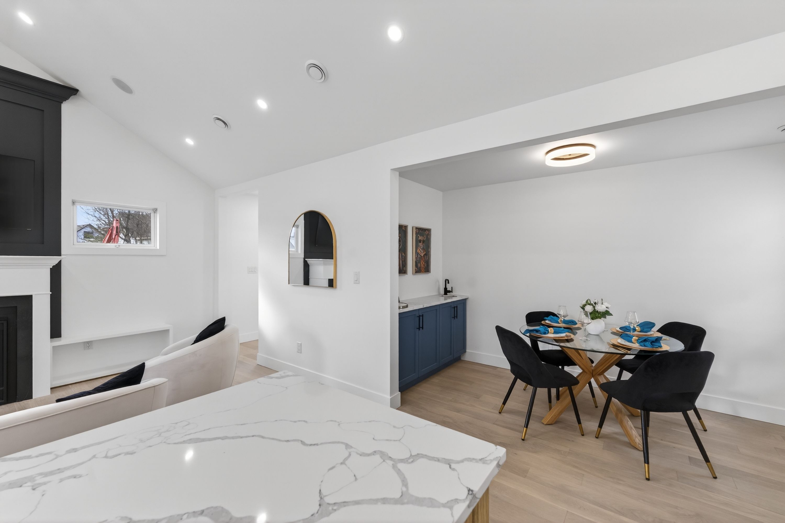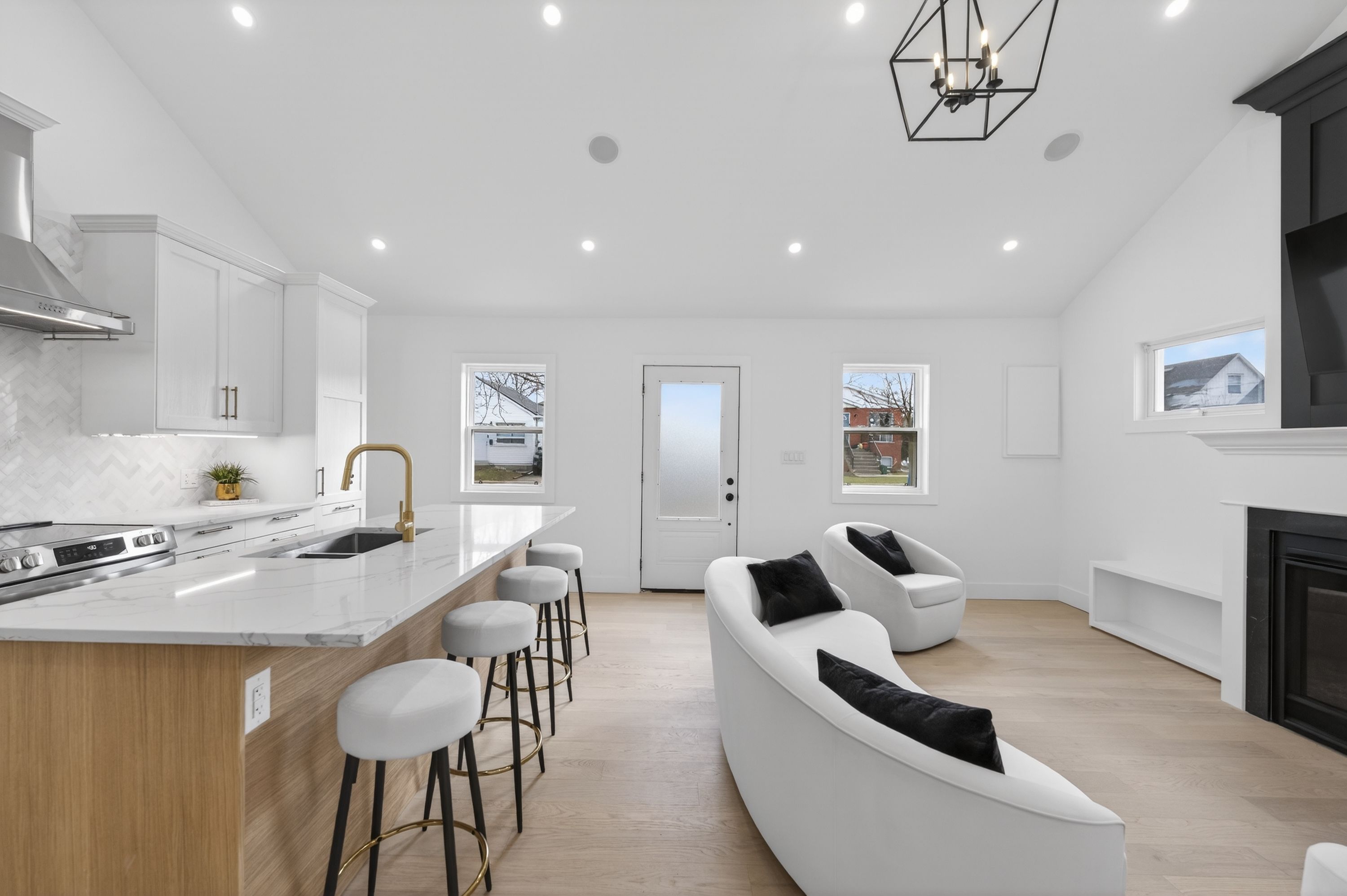 • Bright open-concept kitchen and living room with a gas fireplace.