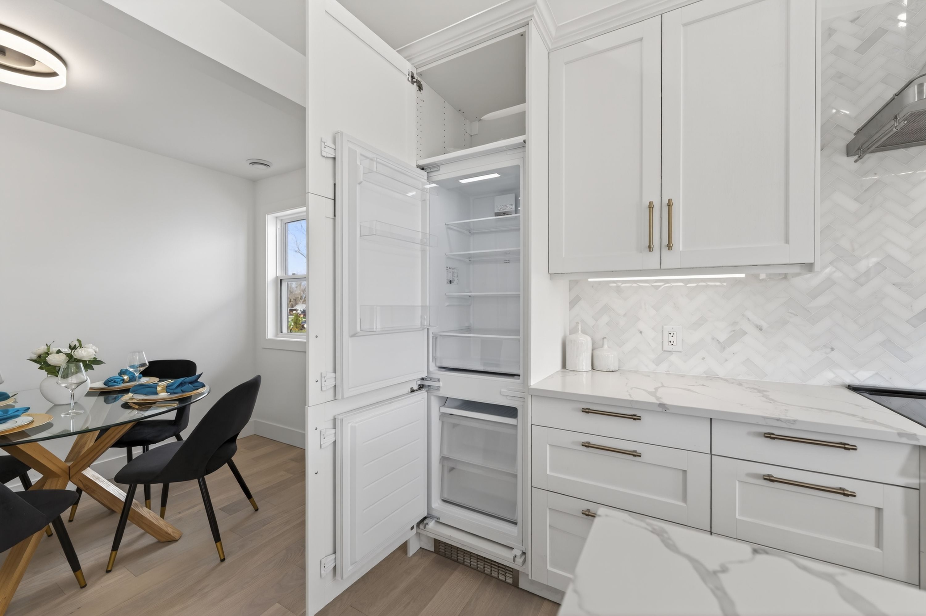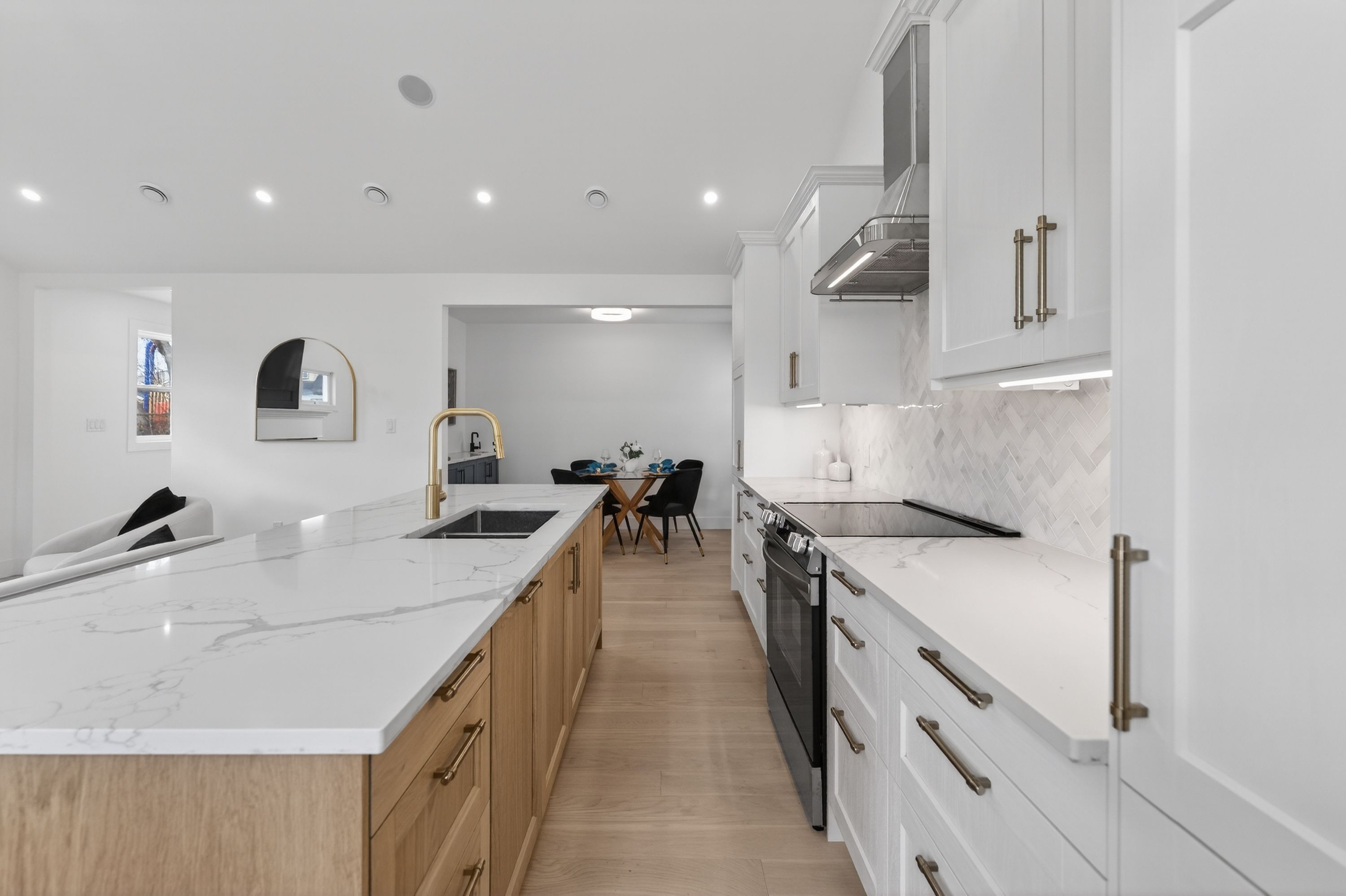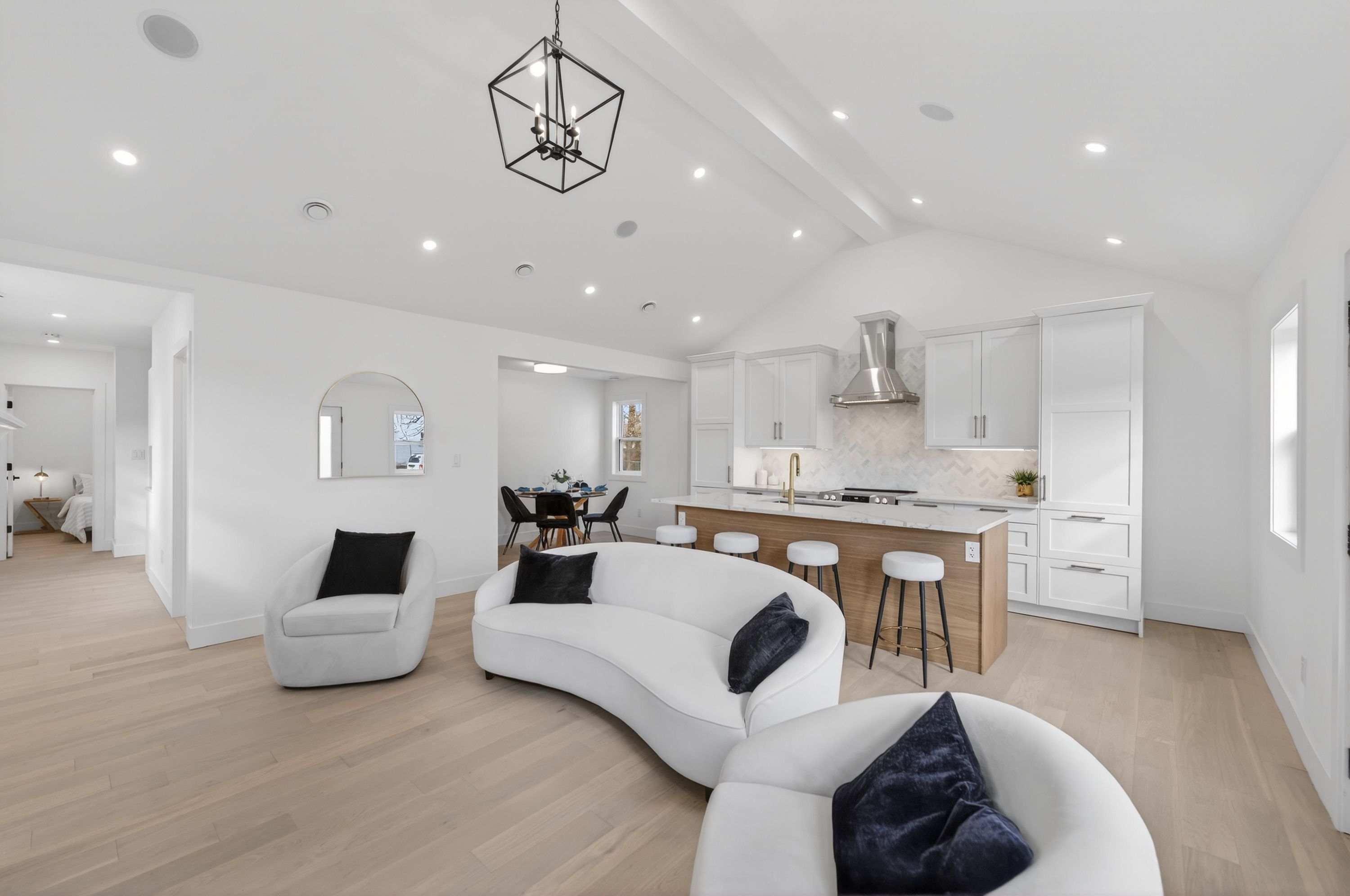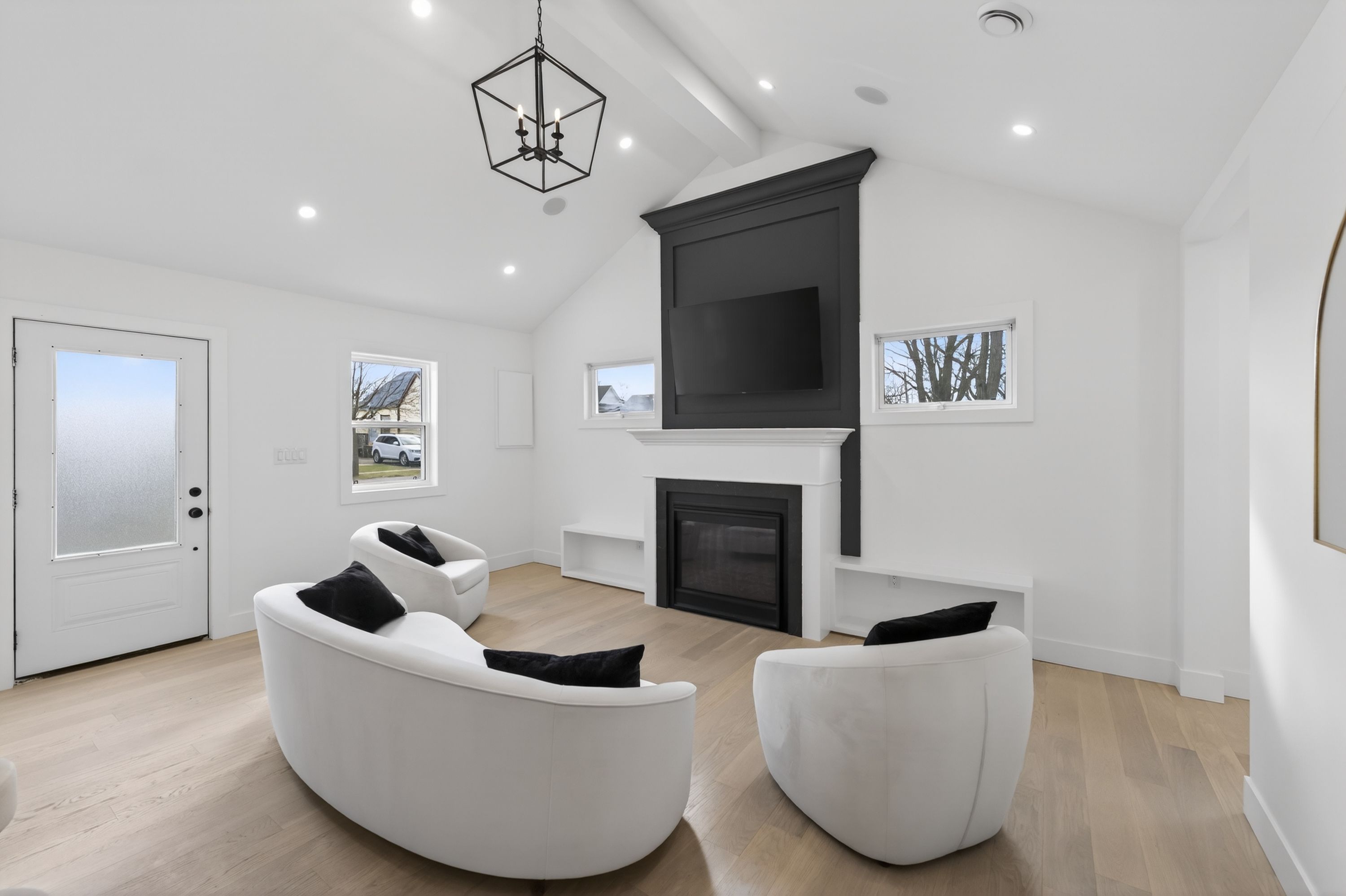 • Bright open-concept kitchen and living room with a gas fireplace.