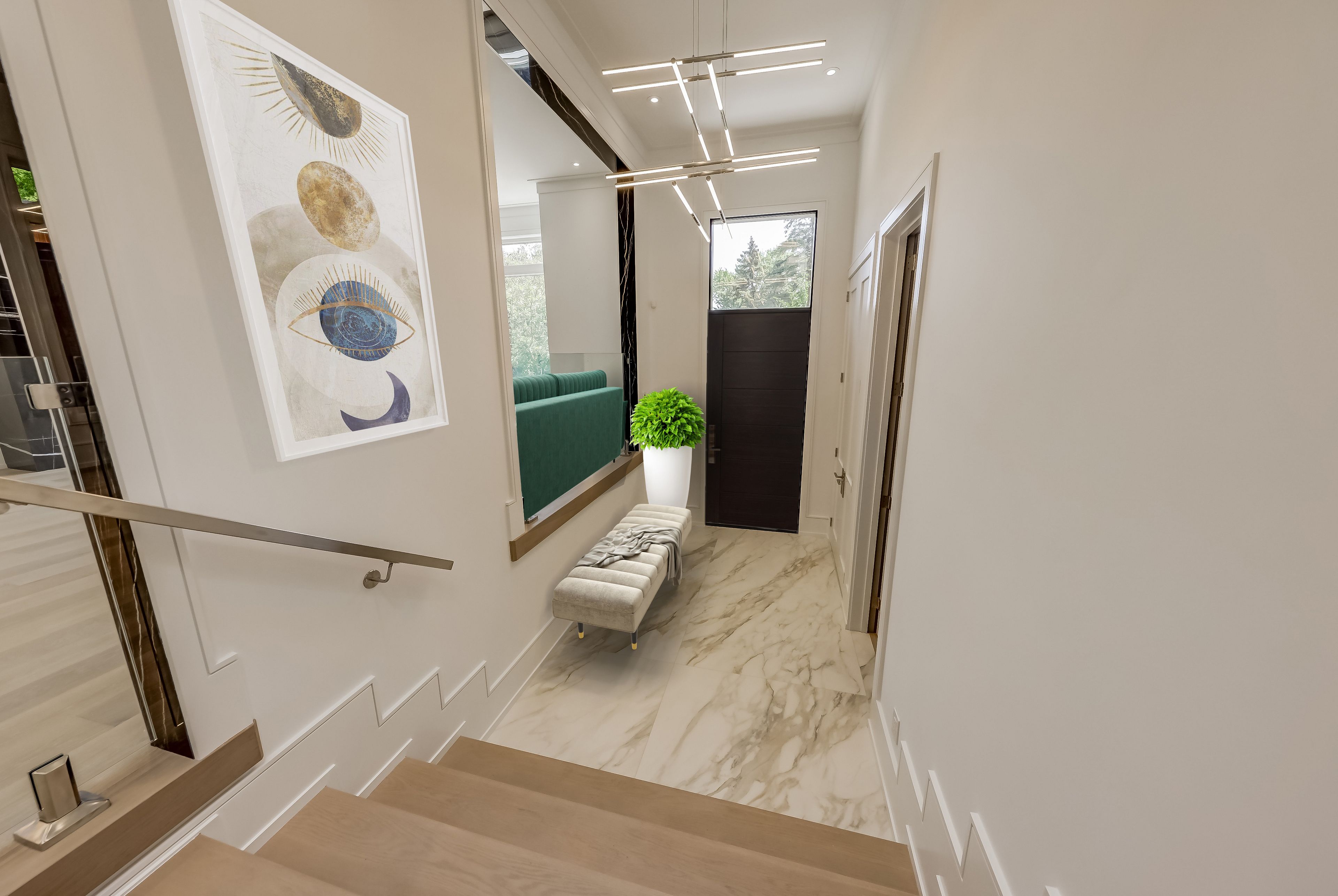Welcome to edenbridge-humber valley. This elegant 4+1 bedroom, 7 bathroom custom smart home is situated on a quiet ravine lot in one of toronto's most prestigious communities, just steps from lambton golf & country club, james gardens, and the humber river. The breathtaking exterior is perfectly matched by the homes luxurious interior design. The modern home has 5,762 sq ft on all levels and showcases three striking 5x10 italian slab stone gas fireplaces, contemporary skylights, heated stone floors, and 3/4-inch engineered white oak hardwood throughout. Custom scavolini cabinetry, a garaventa lift elevator, in-wall vacuum, sauna with steamer, and a full security camera system complete the homes exceptional details. The home is supported by control4 home automation allowing seamless control of lighting, climate, security, and entertainment from anywhere in the home or remotely. The stunning open-concept kitchen features light-toned finishes with built-in premium thermador appliances, an oversized island, and italian stone counters with matching backsplash, complemented by a well-appointed butlers pantry. Adjacent to the kitchen, the spacious family room invites relaxation with ample natural light and views of the backyard, while the formal dining and living rooms provide elegant spaces for entertaining guests. Each large, sun-filled bedroom offers a luxurious ensuite and a spacious walk-in closet, with the primary suite featuring his-and-hers closets and expansive windows overlooking the landscaped backyard. In the recreational area, a sophisticated wet bar with italian finishes and custom scavolini cabinetry adds an extra touch of elegance. This custom home features an exquisite office room, two laundry rooms, a mudroom shower, and a maintenance room. This exceptional residence is complete with a two-car garage offering optional ev charging, a heated driveway and stairs, a hydropool spa, a bbq area, and a spacious deck that overlooks stunning natural scenery.