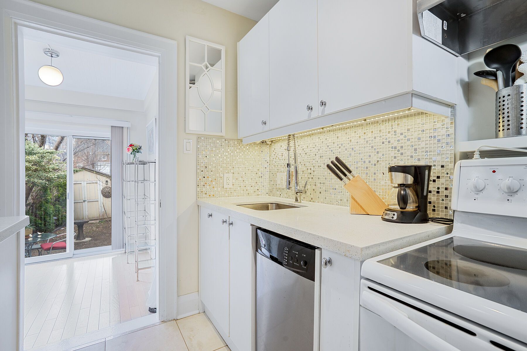 • Versatile den opens to a fenced backyard, great for office or relaxation.