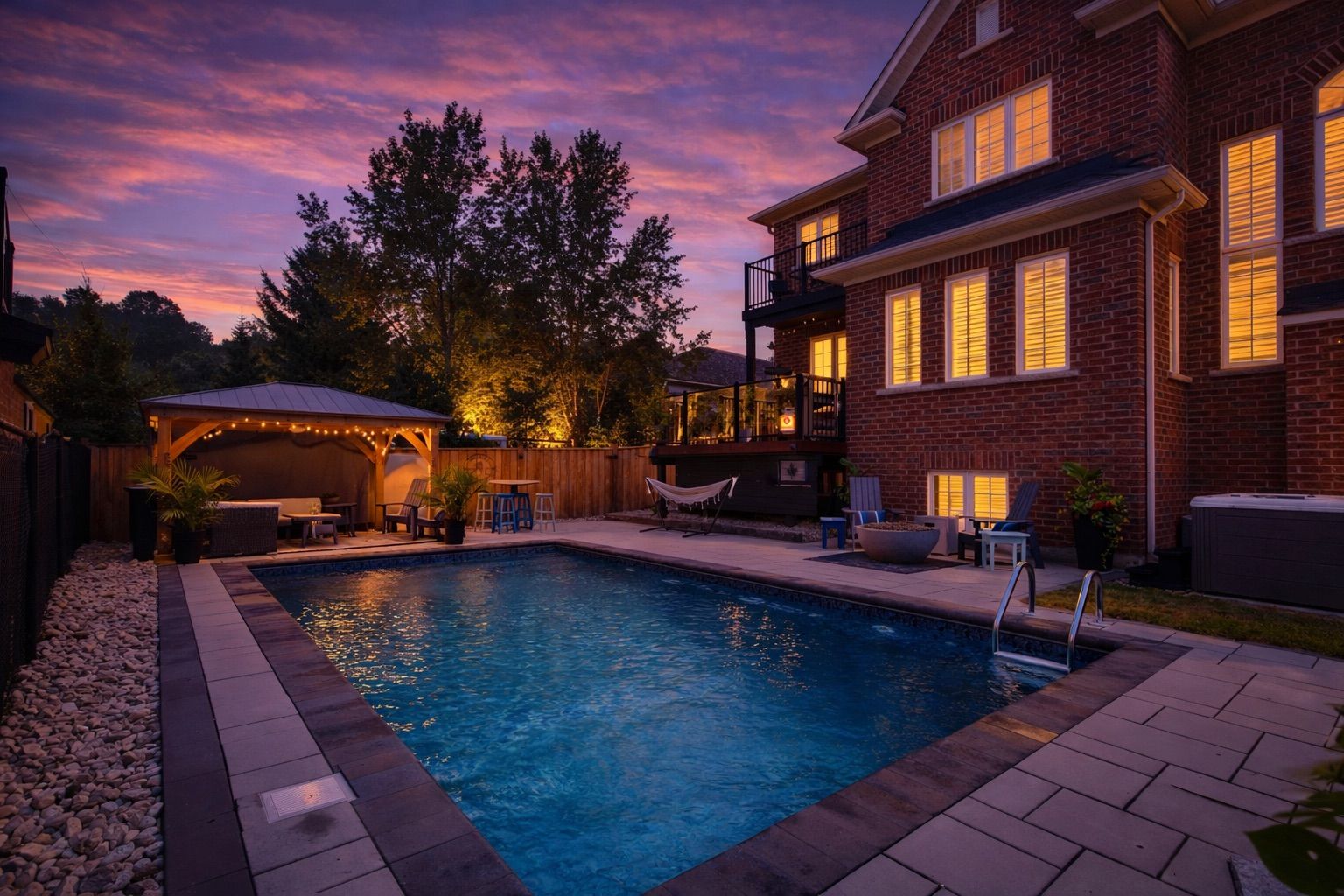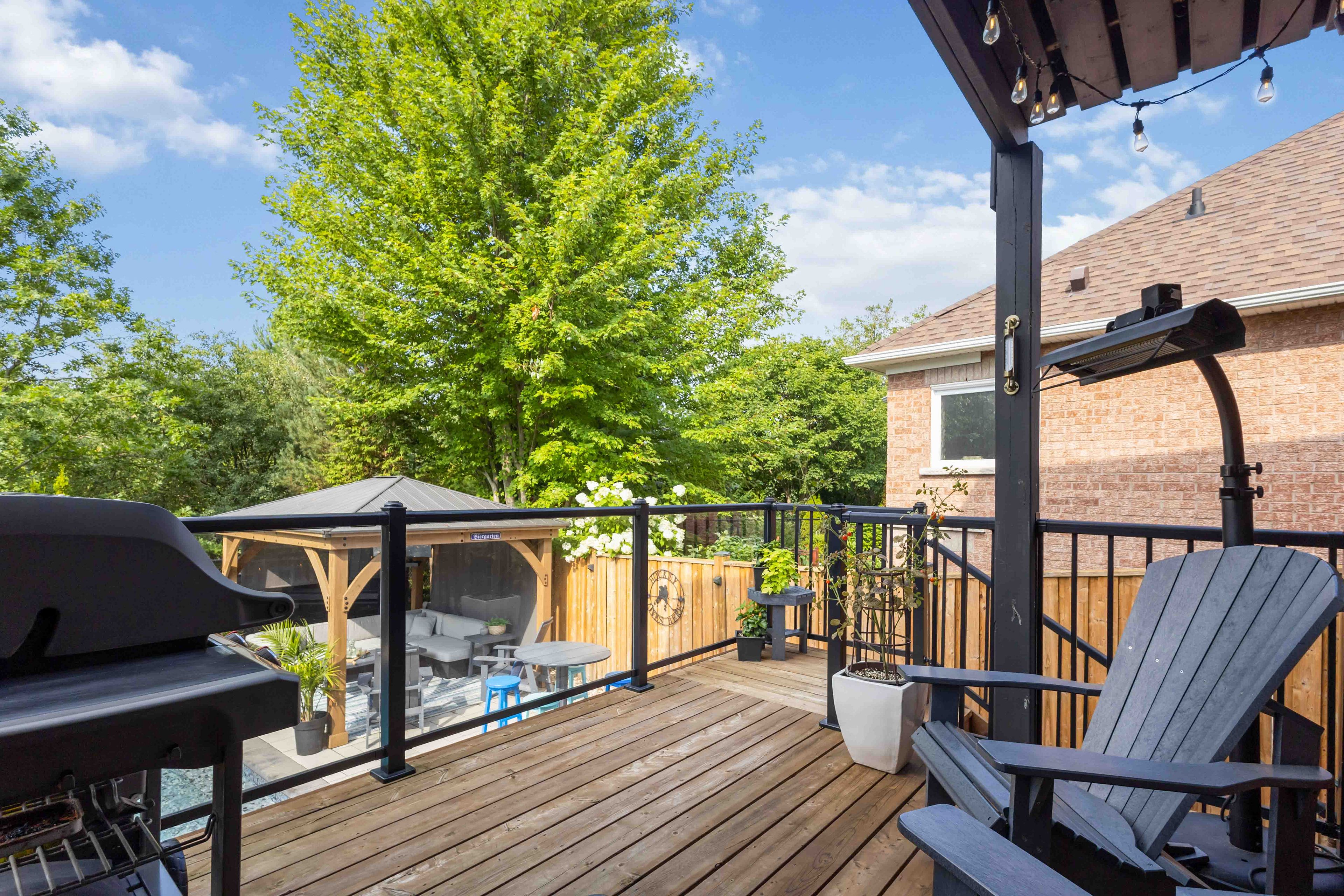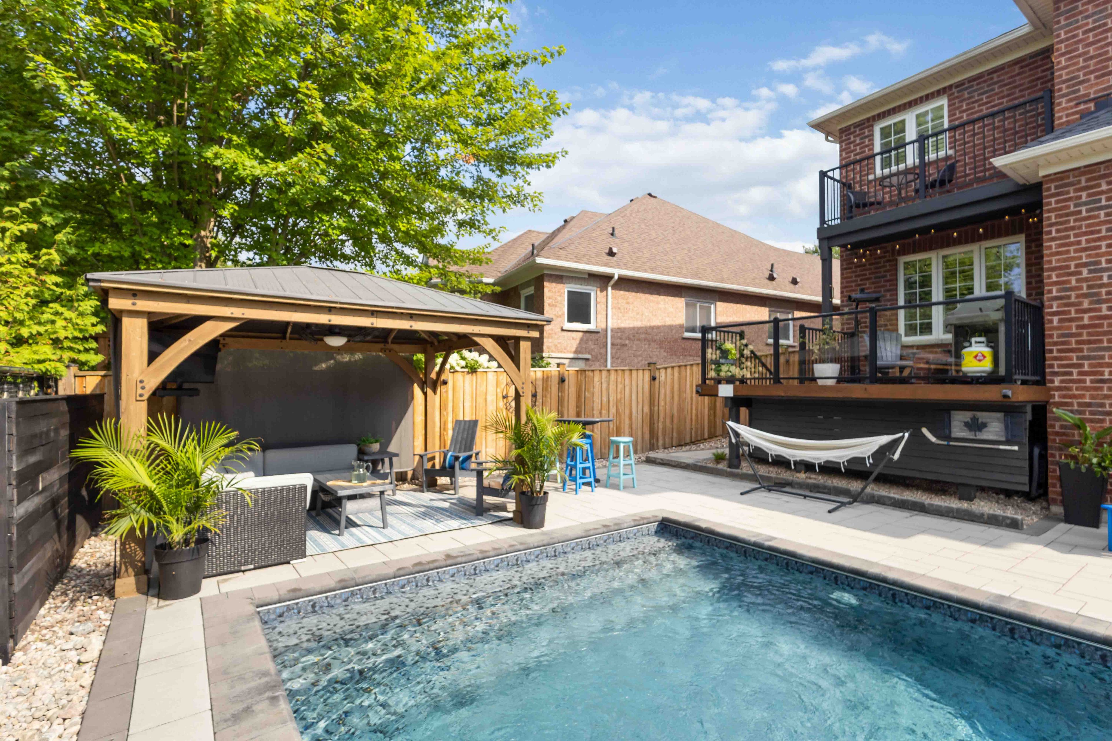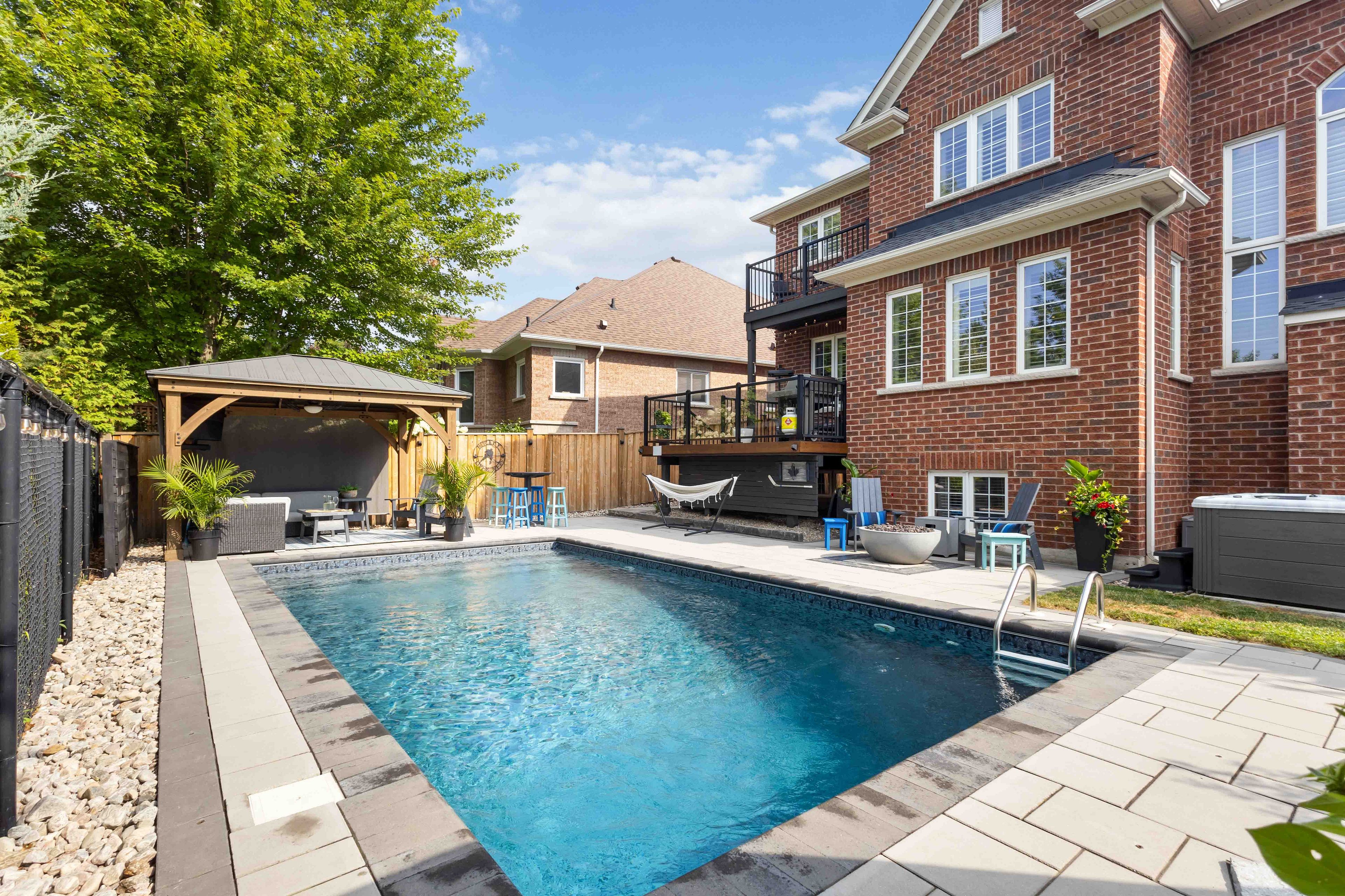 Tranquil ravine setting with inground pool, hot tub & a private backyard oasis! Beautifully upgraded fernbrook built, 3+1 bedroom, 4 bath home offering exceptional curb appeal with professionally landscaped front & back gardens. The backyard is designed for entertaining featuring a timber gazebo, large deck, interlocking patio, inground saltwater pool, hot tub & scenic treed ravine views providing ultimate privacy. The inviting foyer welcomes you to a sun filled open concept main floor with extensive crown moulding, wainscoting & california shutters throughout. Convenient main floor office ideal for working from home or study space. Main floor laundry room with direct garage access. Gourmet kitchen showcases silestone quartz countertops, raywal cabinetry, ceramic backsplash, stainless steel appliances, pantry with custom pull out shelves & centre island with breakfast bar. Spacious breakfast area offers a garden door walkout to the entertainer's deck with panoramic ravine views. The impressive great room features soaring cathedral ceilings, gas fireplace with custom mantle & elegant detailing - perfect for family gatherings. Upstairs offers 3 generous bedrooms. The primary retreat features a huge walk-in closet & private balcony overlooking the ravine - perfect for morning coffee. Spa inspired 5 piece ensuite includes soaker tub, large glass shower & granite vanity. Additional bedrooms are spacious & bright with well appointed ensuite baths. Partially finished basement includes a 4th bedroom with barn door entry & a bright rec room with oversized windows offering additional living space for growing families. Situated in a highly desirable community just steps to parks, schools, trails & downtown brooklin shops. A rare opportunity combining luxury finishes, functional family layout & resort style outdoor living in a premium ravine location!