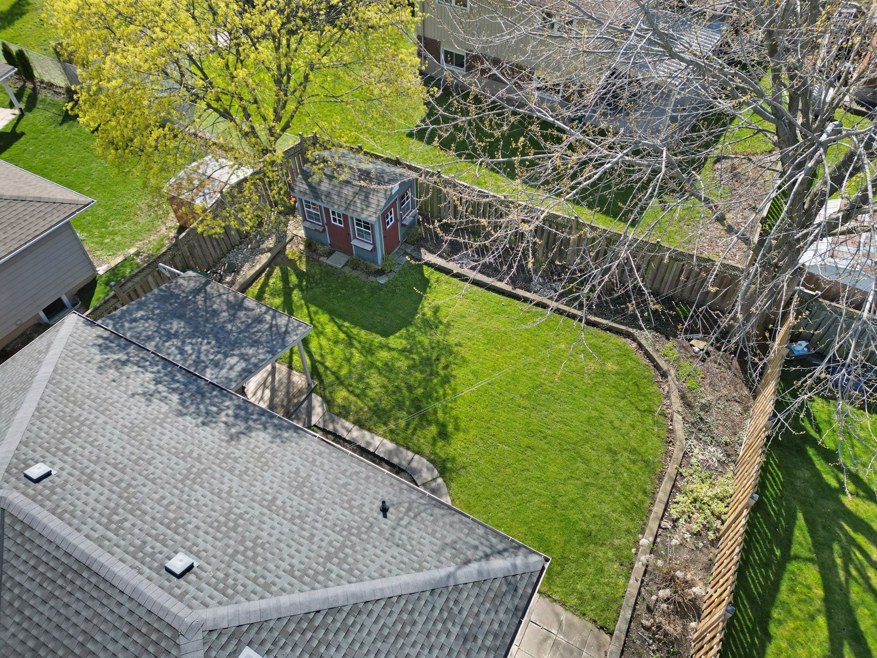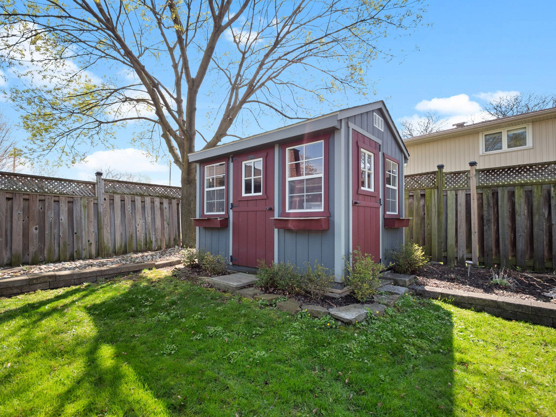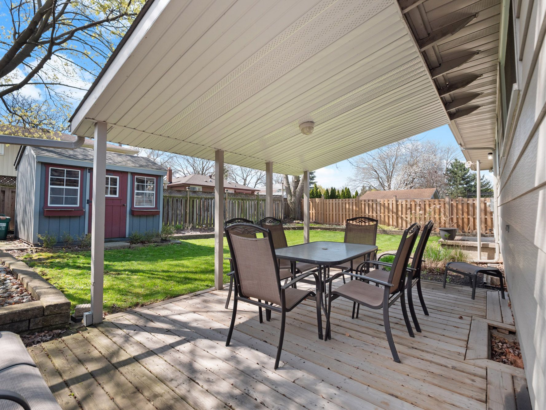 • Beautifully maintained backyard with a shaded deck and gardens.