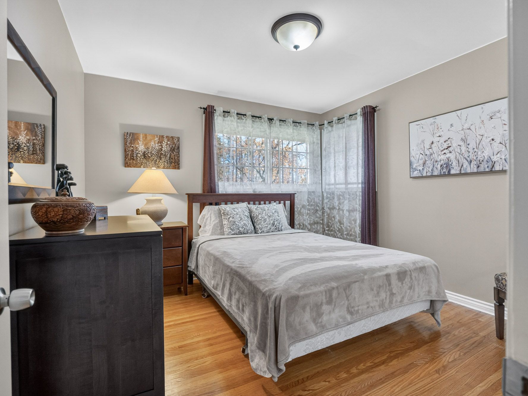 Right when you pull up, the curb appeal does the talking. A covered front porch, mature trees lining a quiet street, and that feeling that someone has really loved this place. It's the kind of home you can settle into from day one. Step inside to a tiled entry with a coat closet straight ahead. You'll notice the original hardwood floors running through the hallway, all three bedrooms, and living room. Big windows and lots of natural light make the living room a very inviting room to unwind in. The kitchen is practical and well-equipped with ample cabinetry and a double sink, and it flows easily into the dining area. A back door off the kitchen puts you steps from the backyard. All three bedrooms are comfortable and well-sized, with a full 4-piece bathroom down the hall. Head downstairs to a fully finished basement that's ready for whatever you need it for. There's a large rec room with a wet bar and fridge, perfect for teens, students, or just a great hangout space, plus a second full bathroom, a spacious laundry room with double utility sinks, a workshop, and various spaces for storage. Out back, a shaded deck (thanks to the overhang), a large shed, and beautifully kept gardens make this a backyard worth spending time in. Close to the pen centre shopping hub and highway 406, this conveniently located and lovingly cared-for home is ready and waiting for its next chapter.