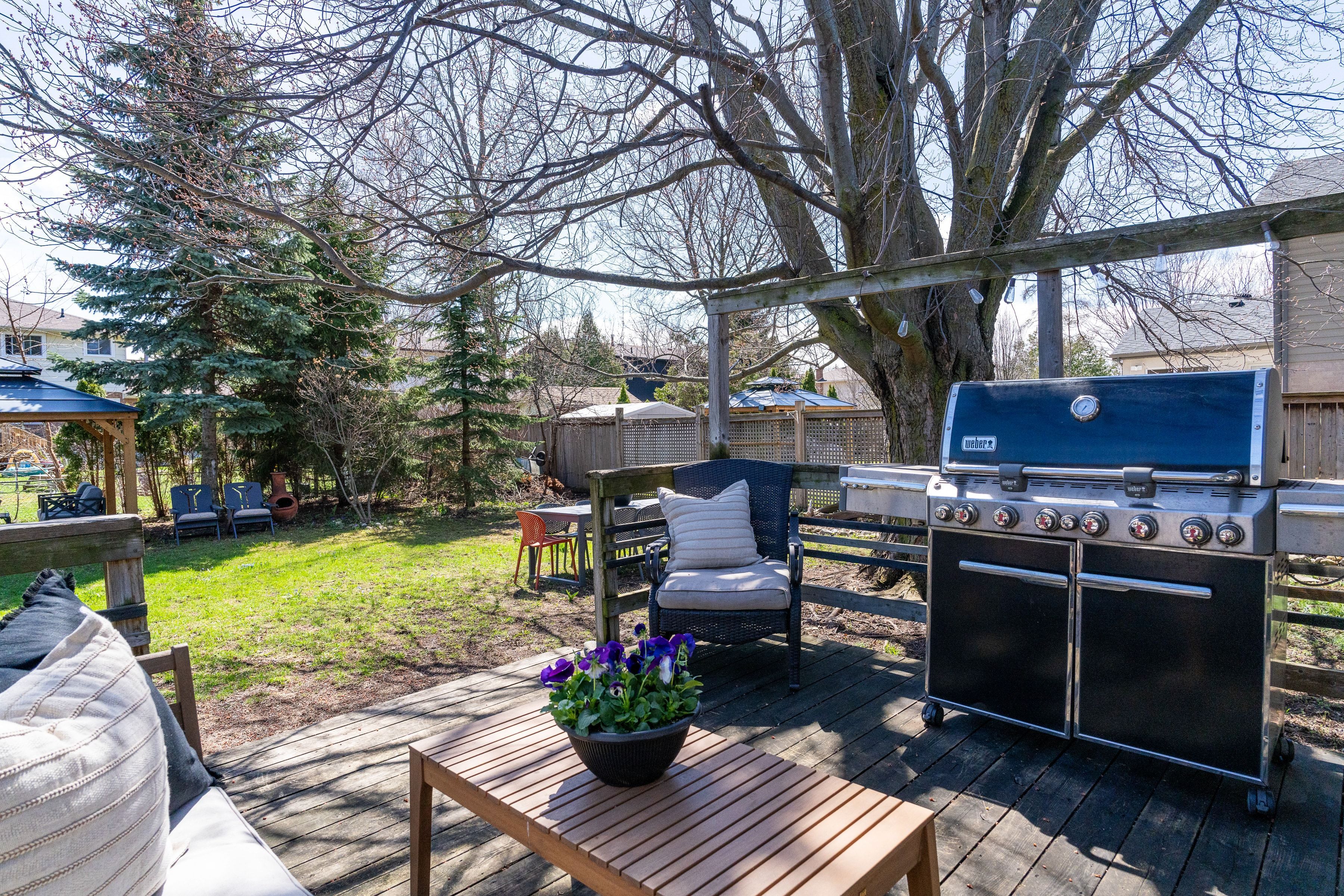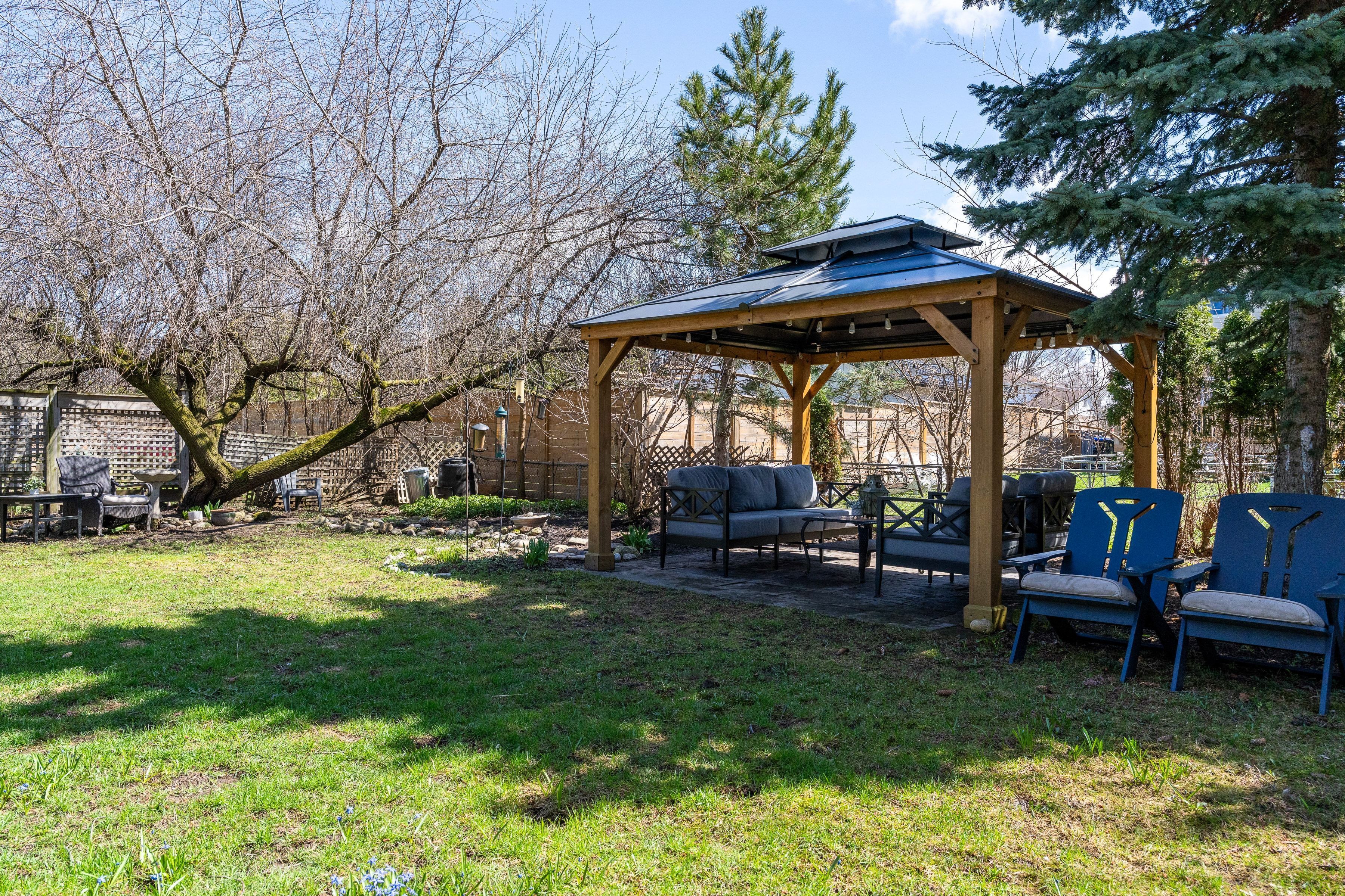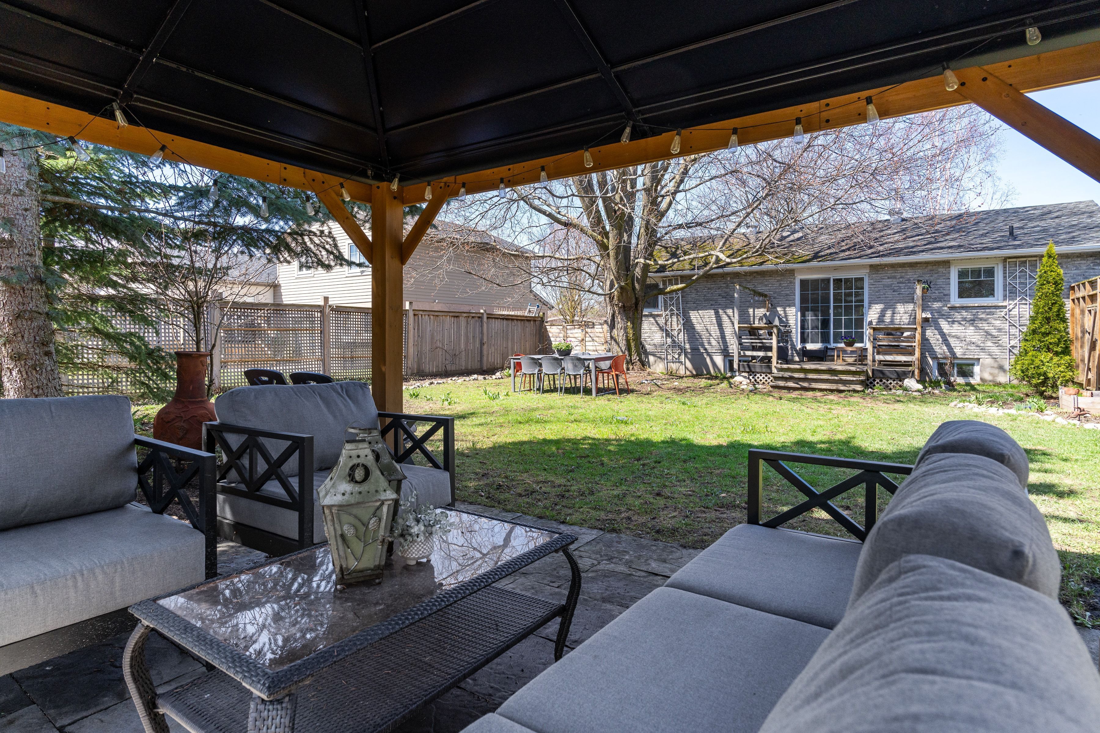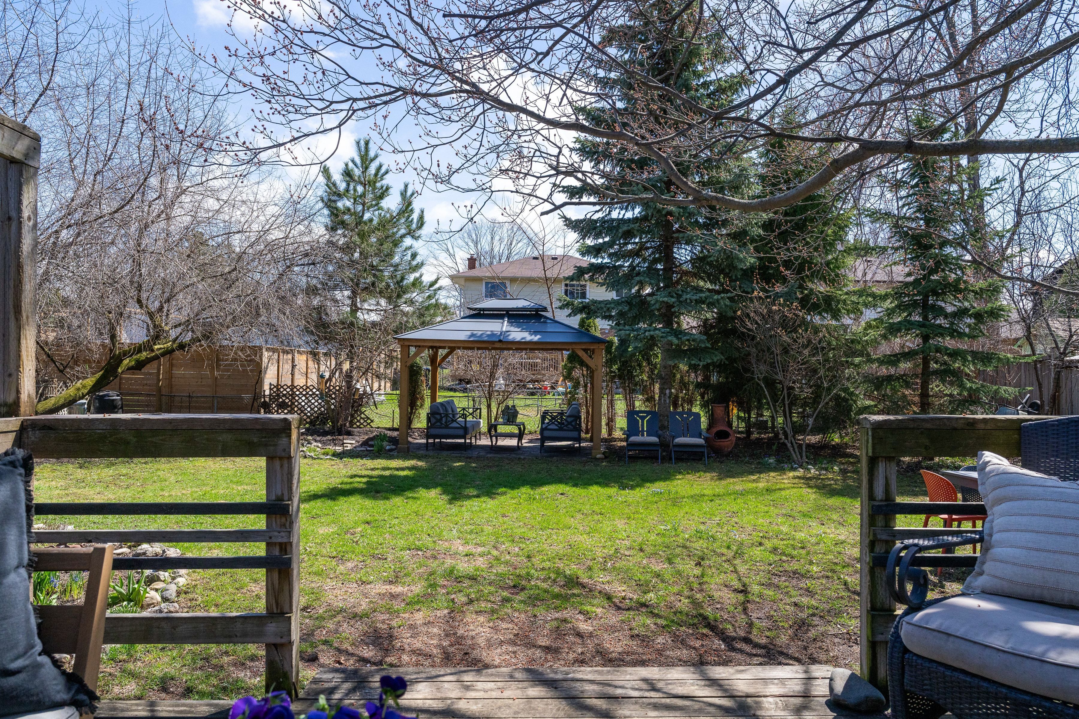 • Fully fenced backyard with deck, gazebo, and plenty of room for play.