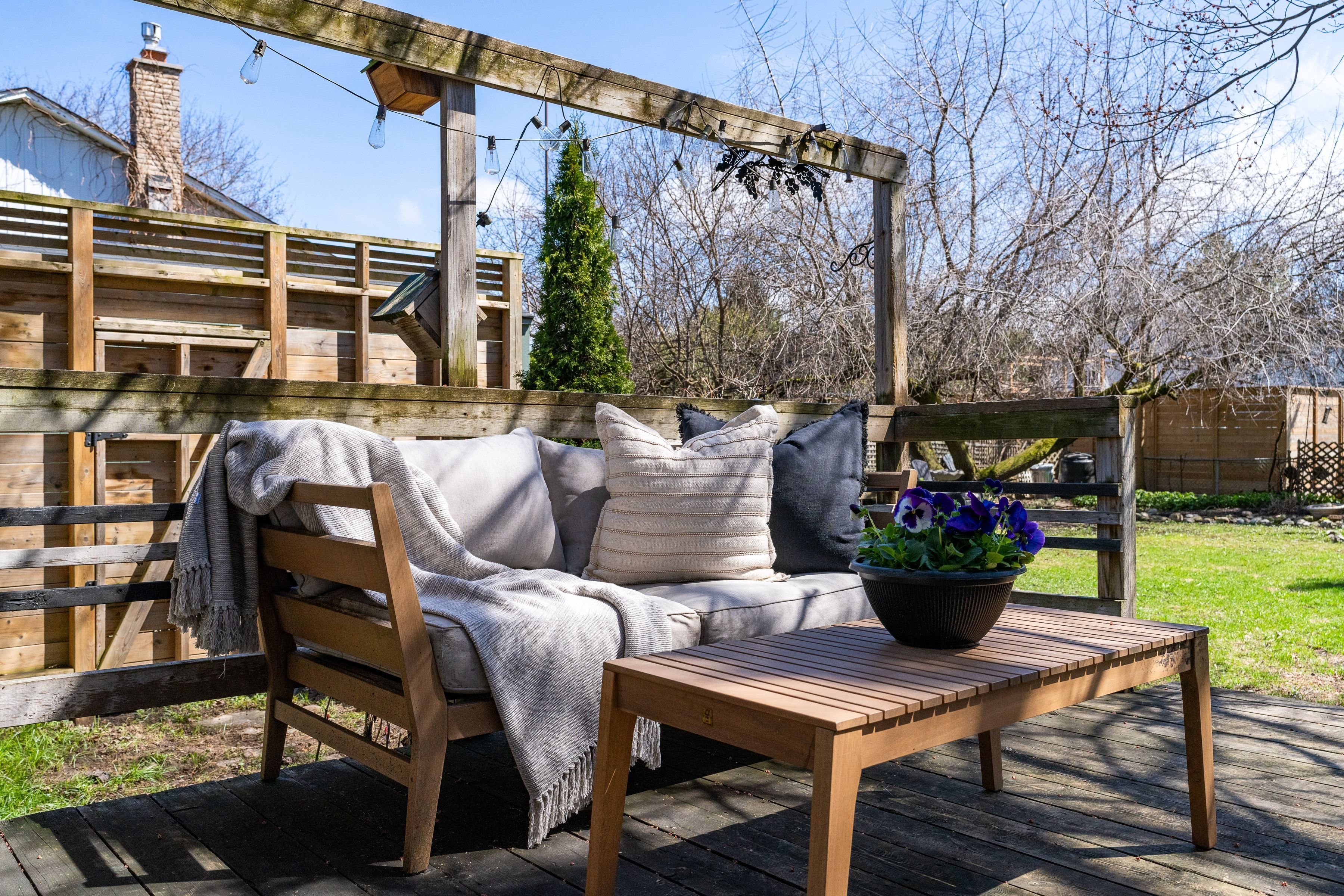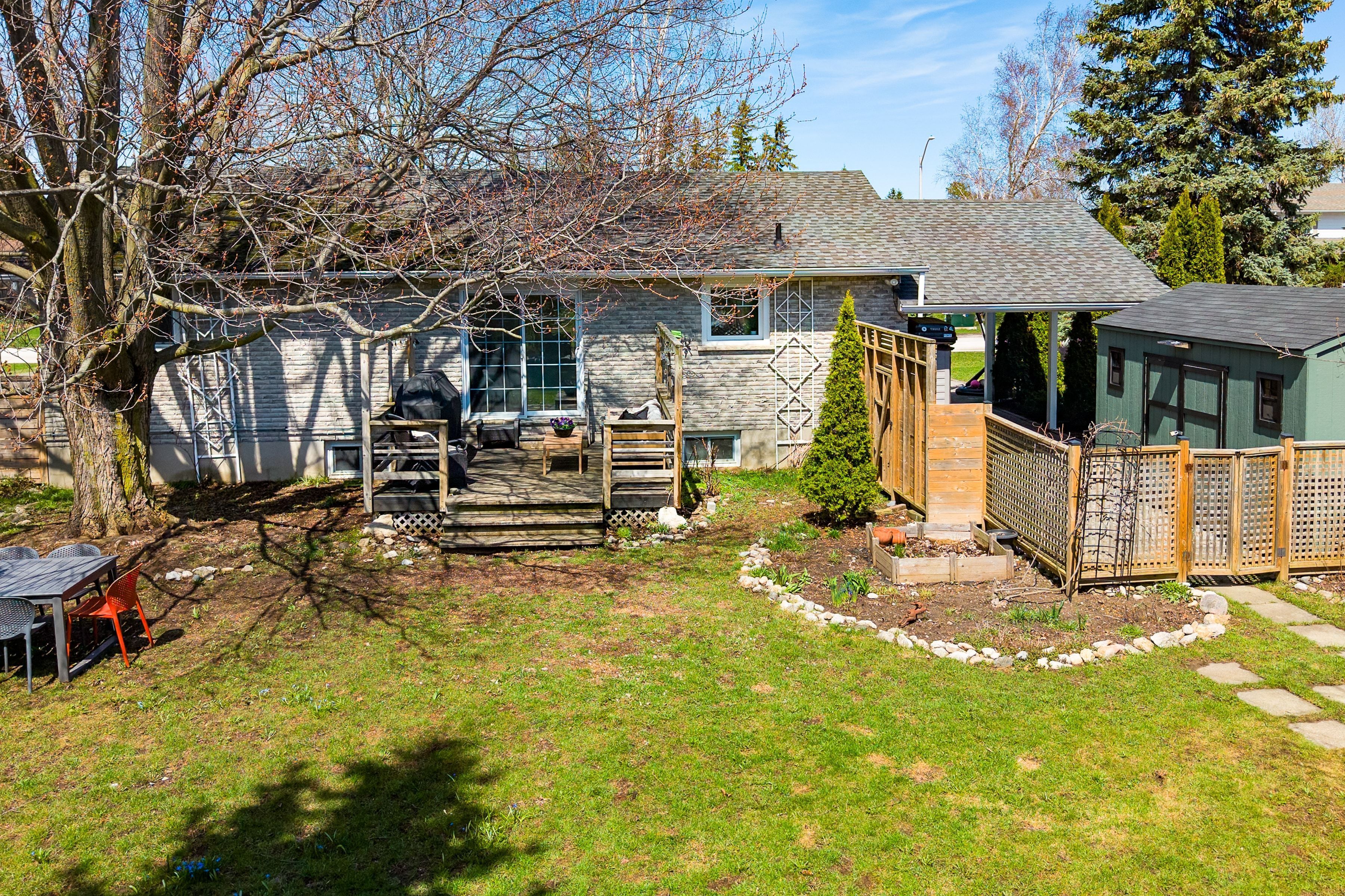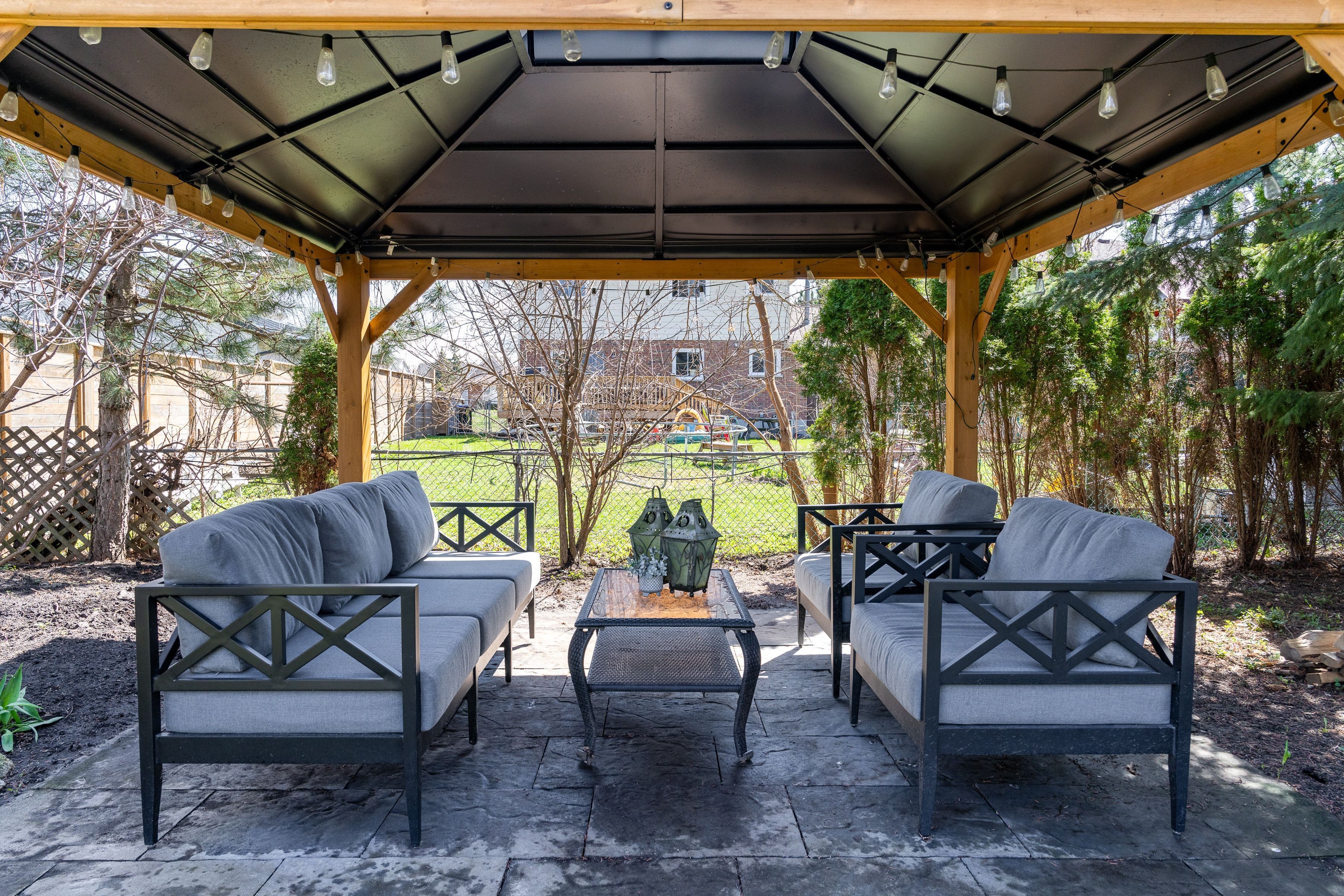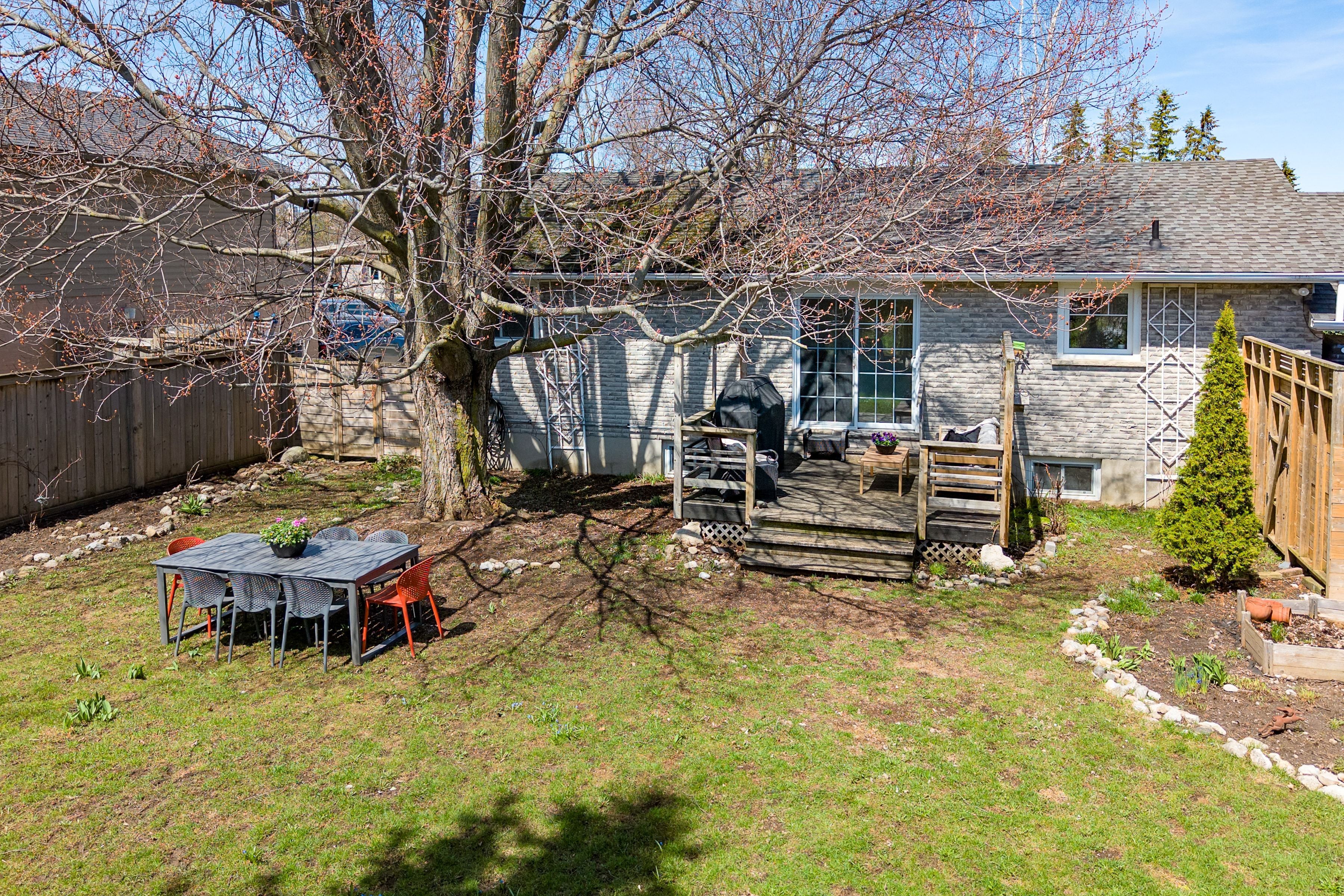 • Fully fenced backyard with deck, gazebo, and plenty of room for play.
