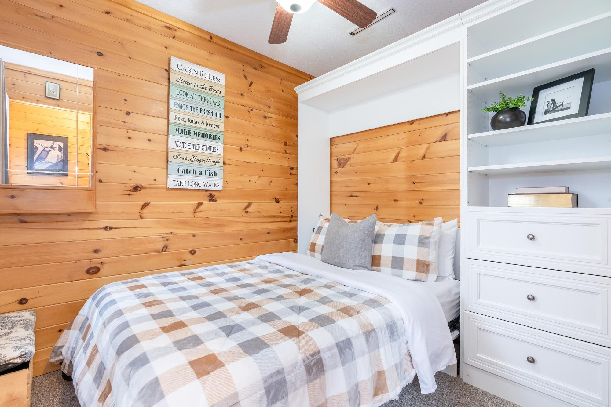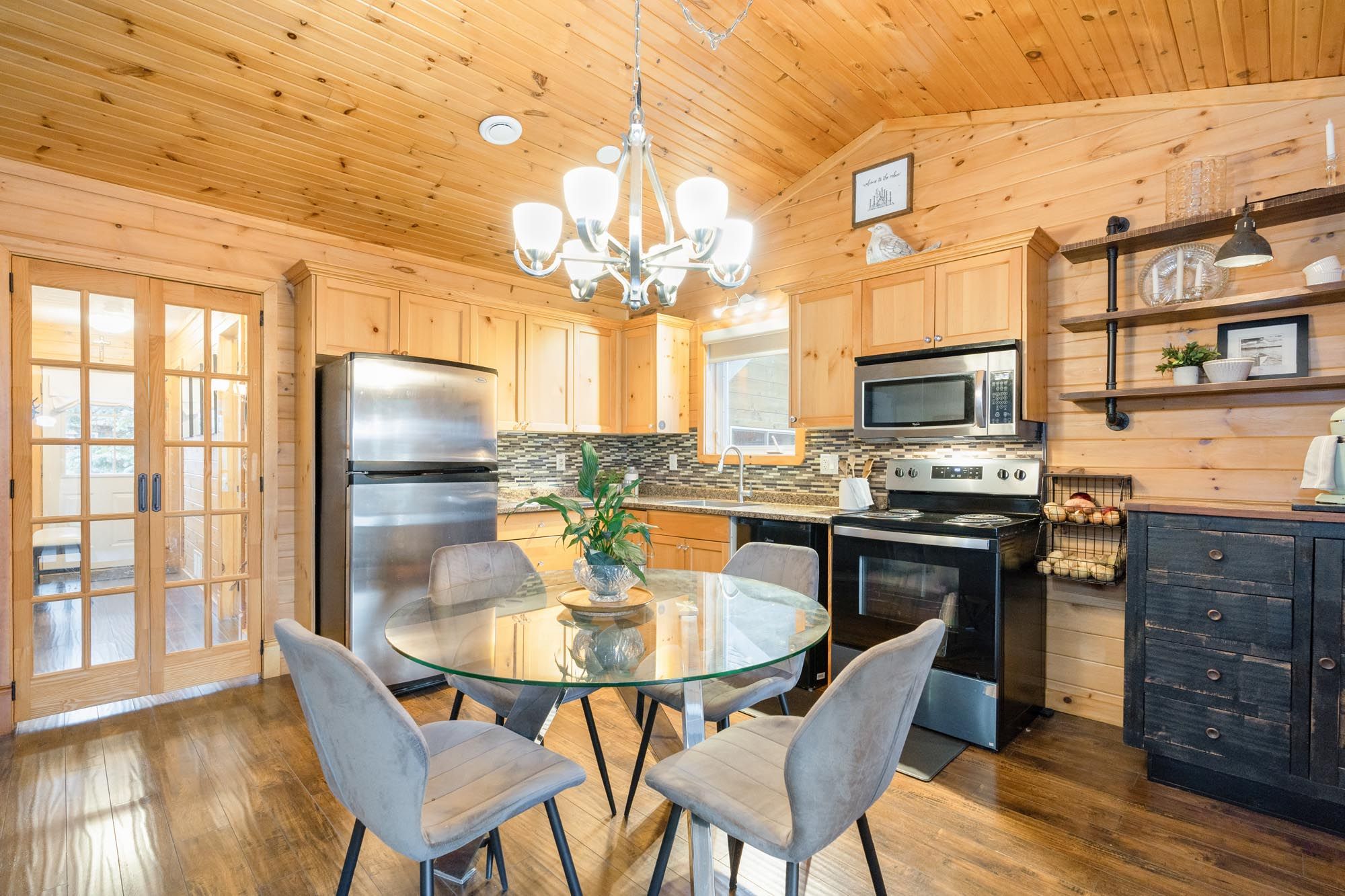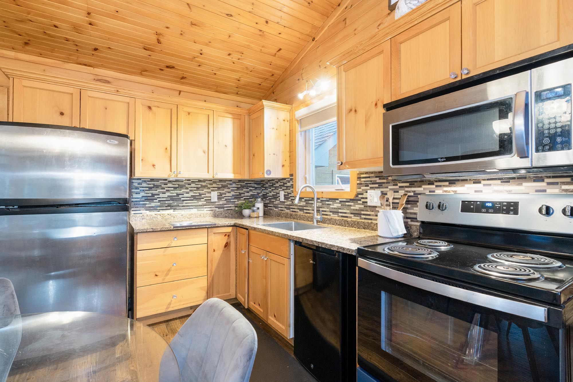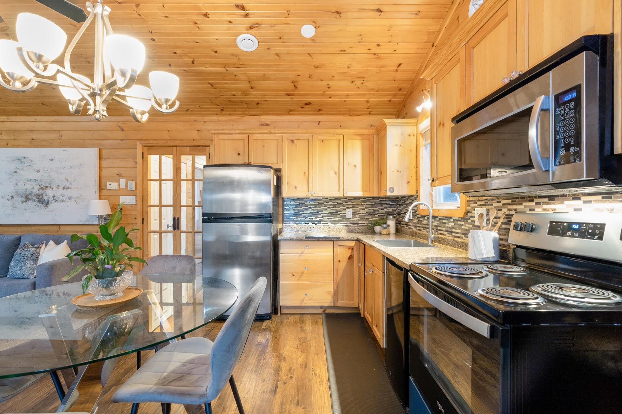 • Warm cabin with cathedral ceilings and an inviting open-concept layout.
