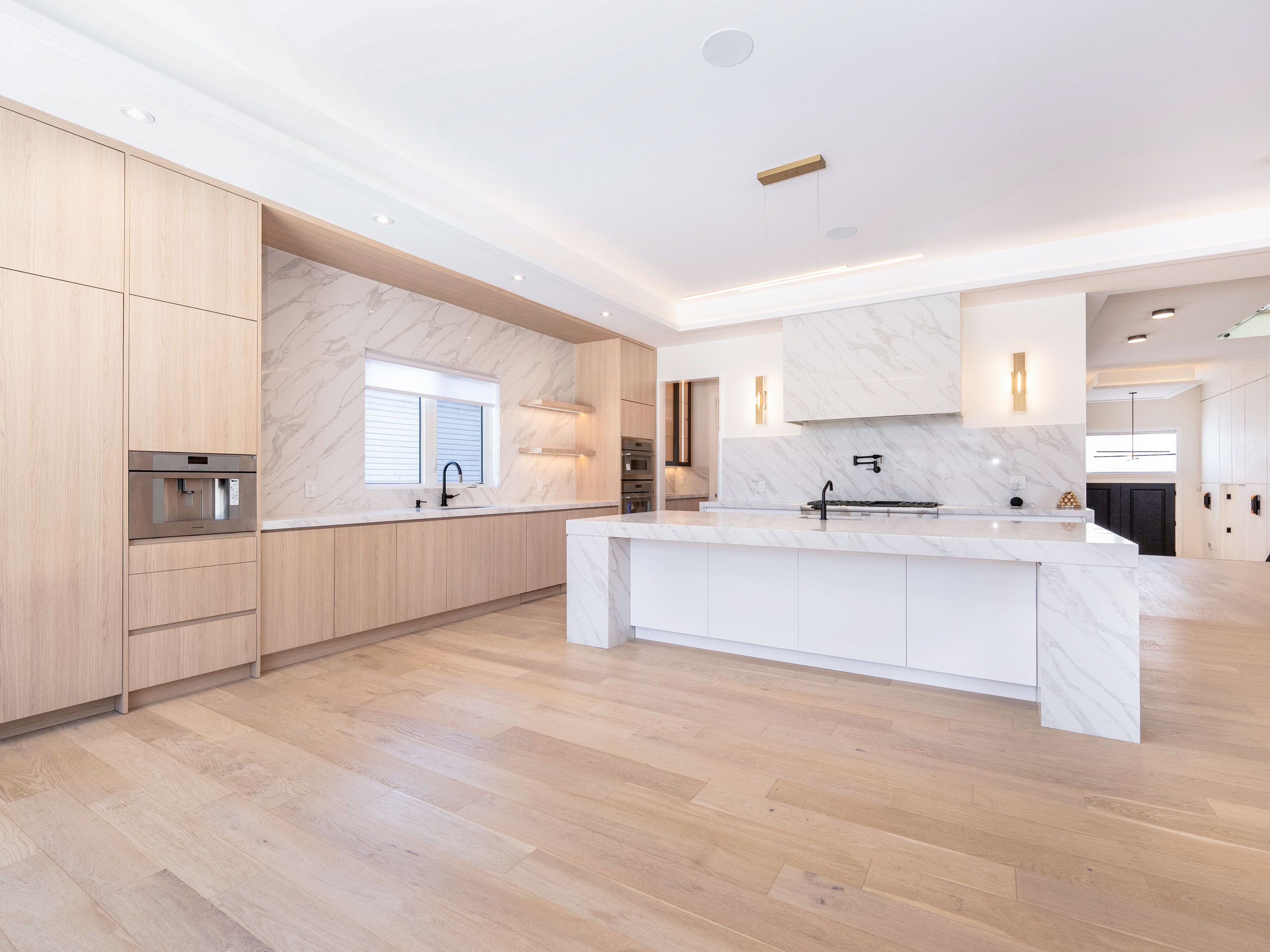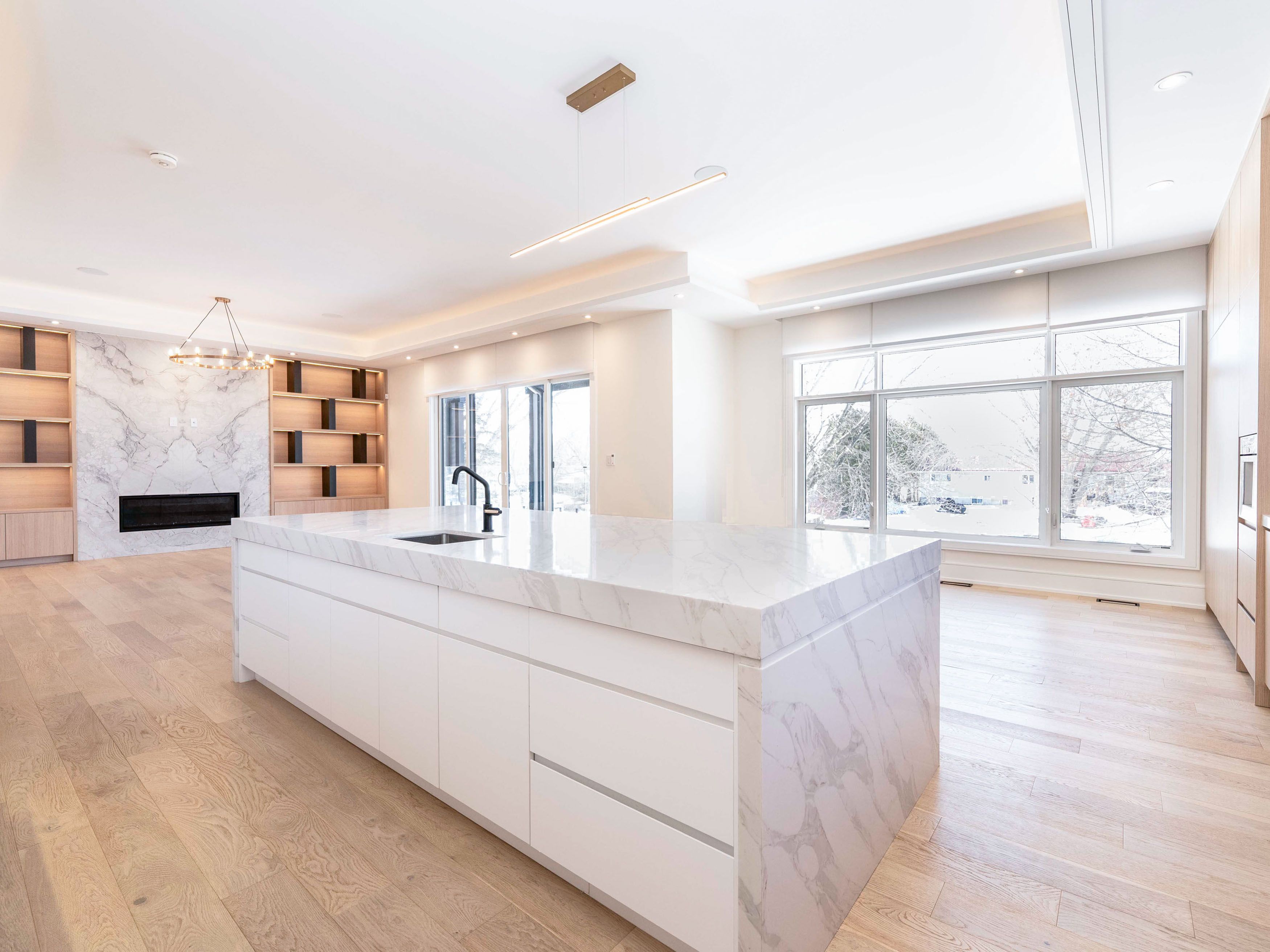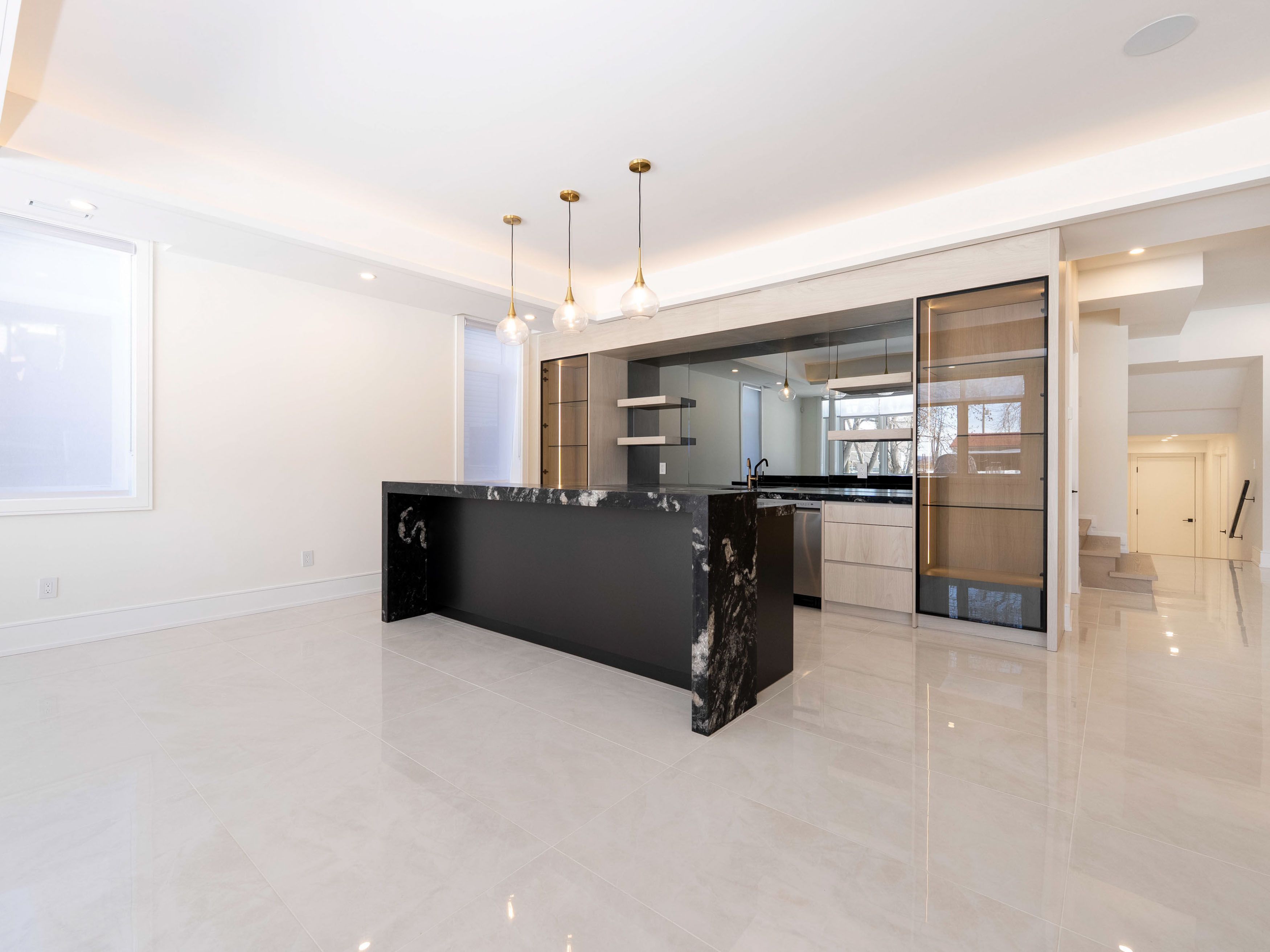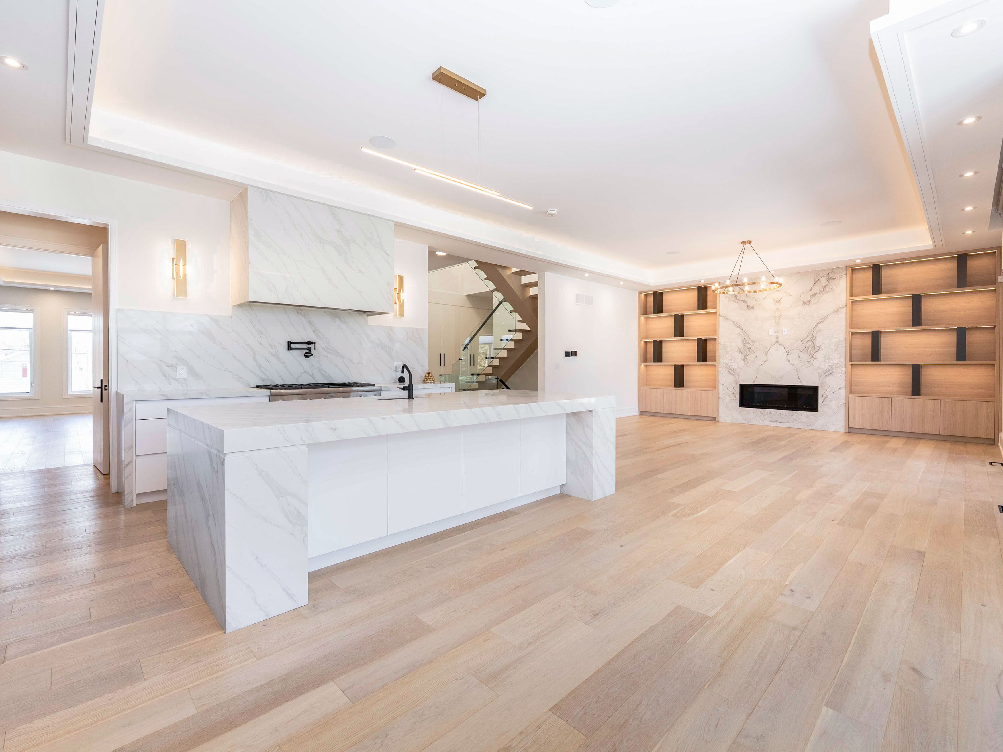 • Chef's kitchen with premium appliances and waterfall marble island.