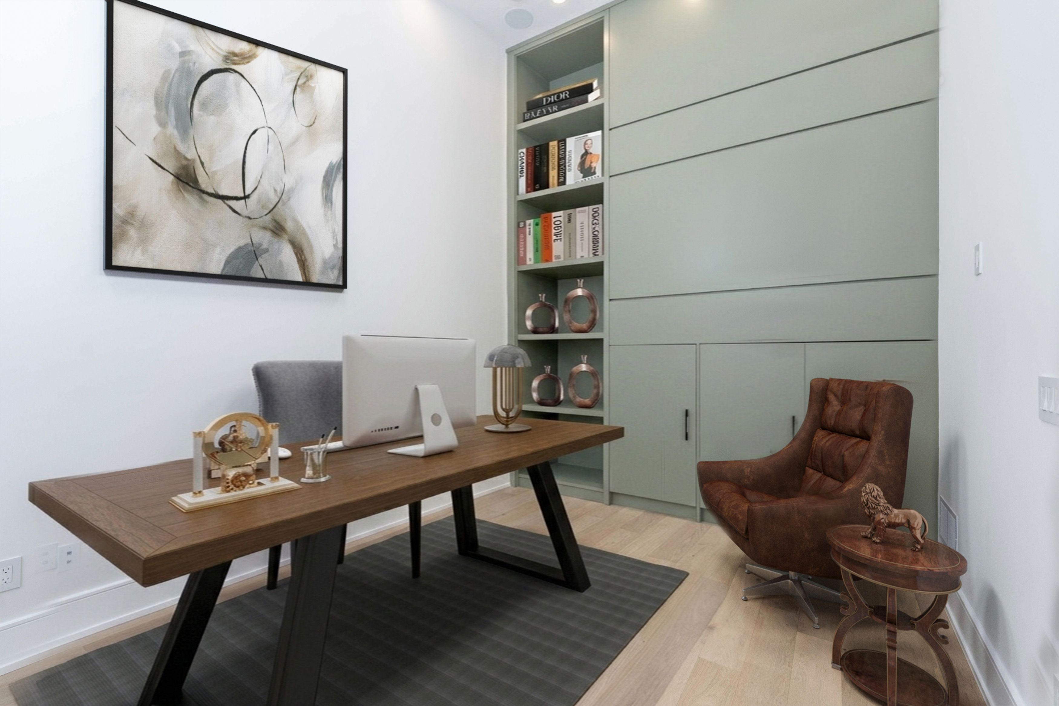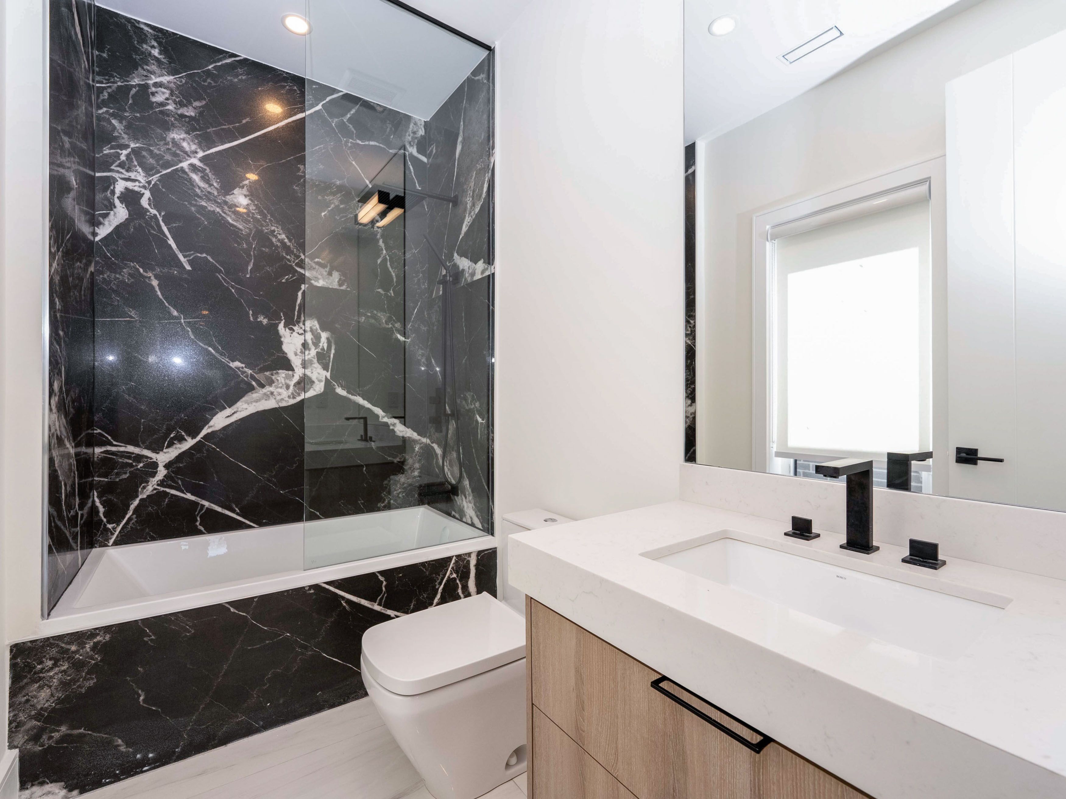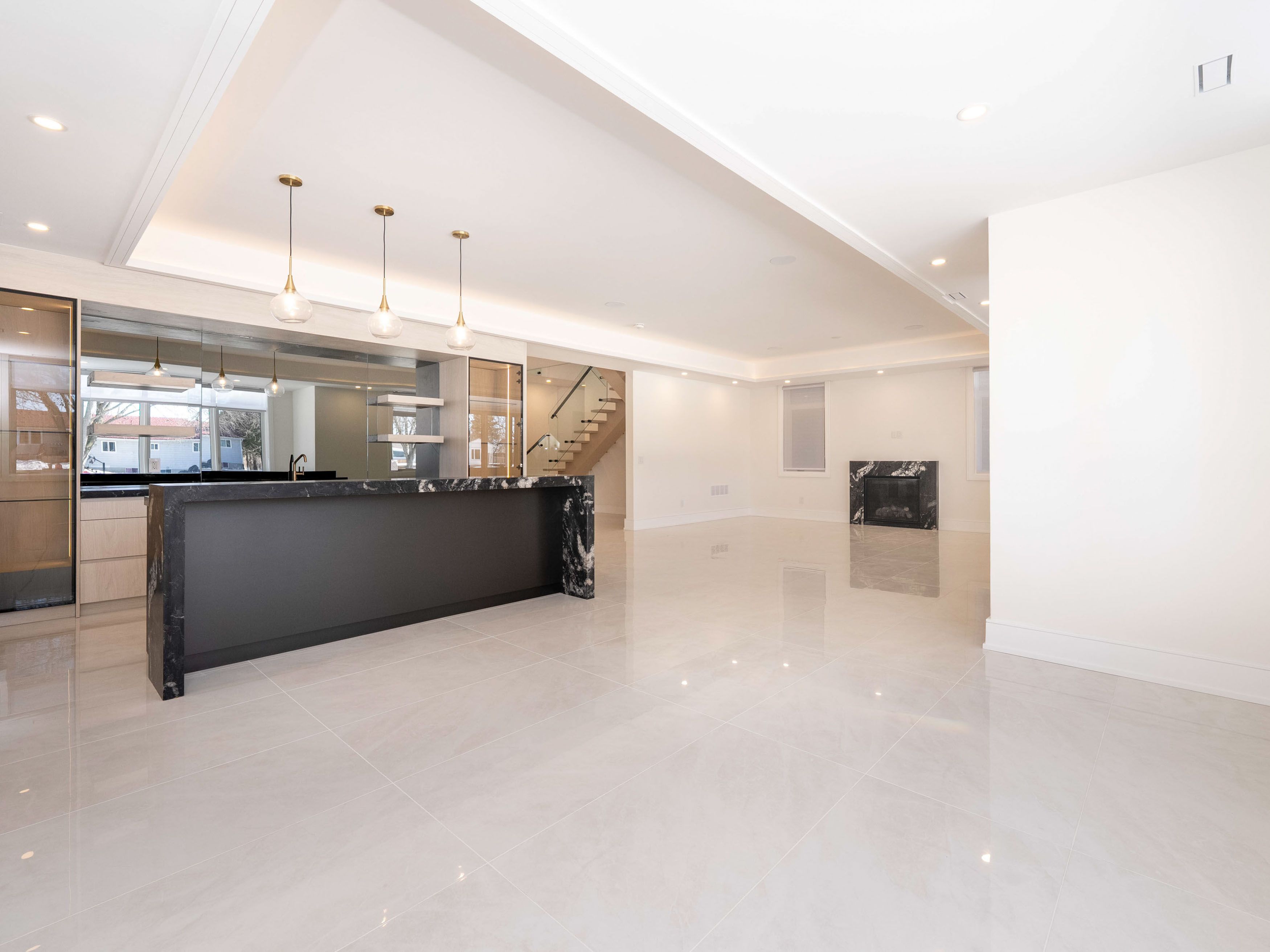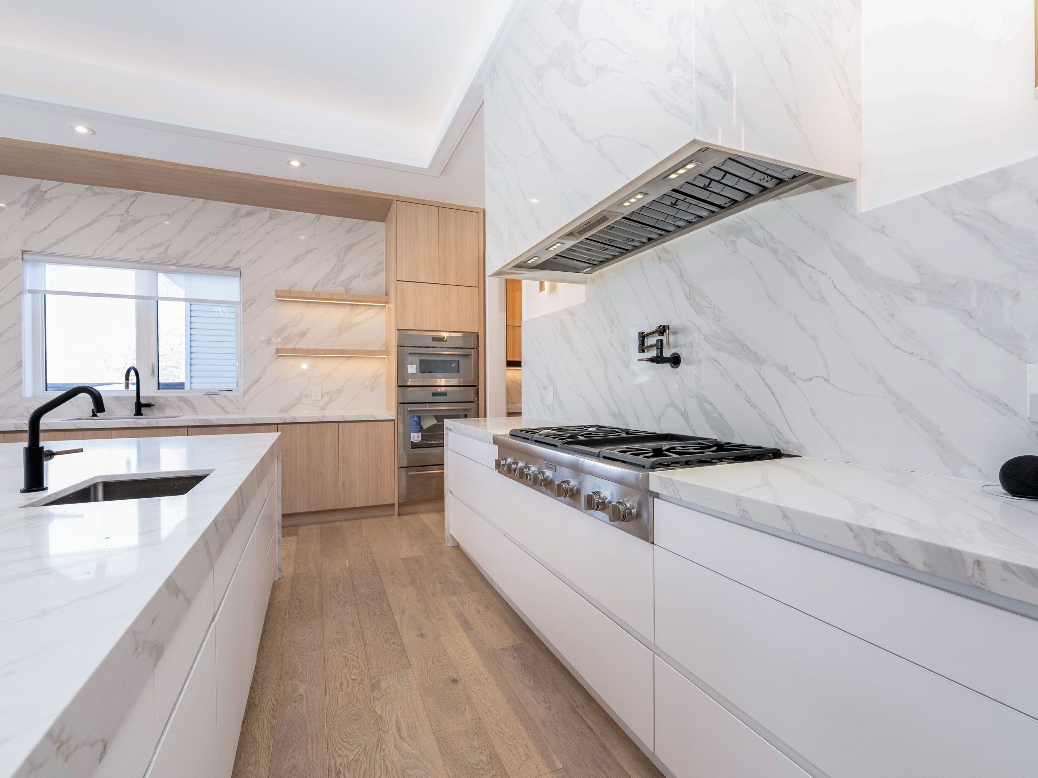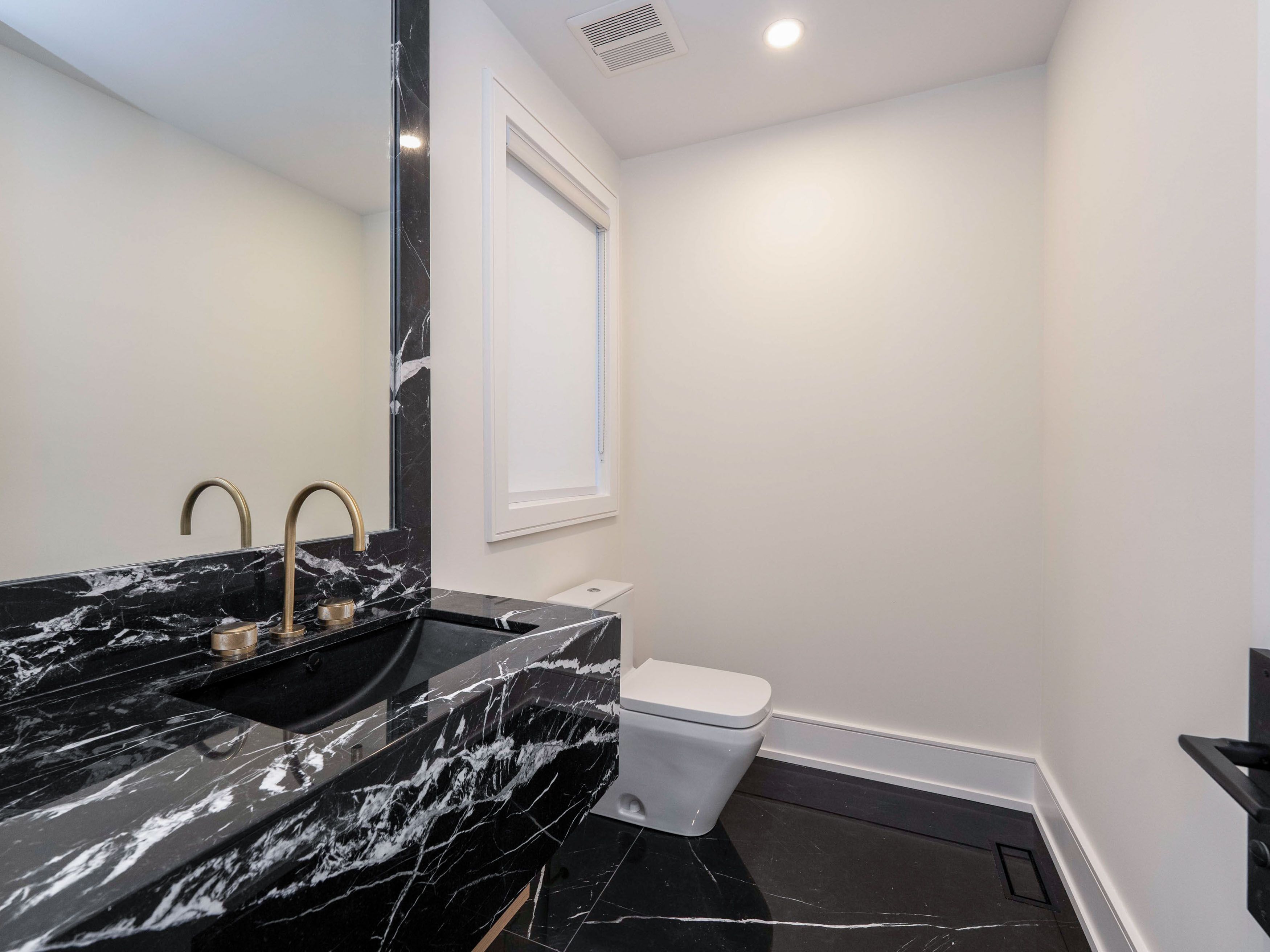 • Chef's kitchen with premium appliances and waterfall marble island.