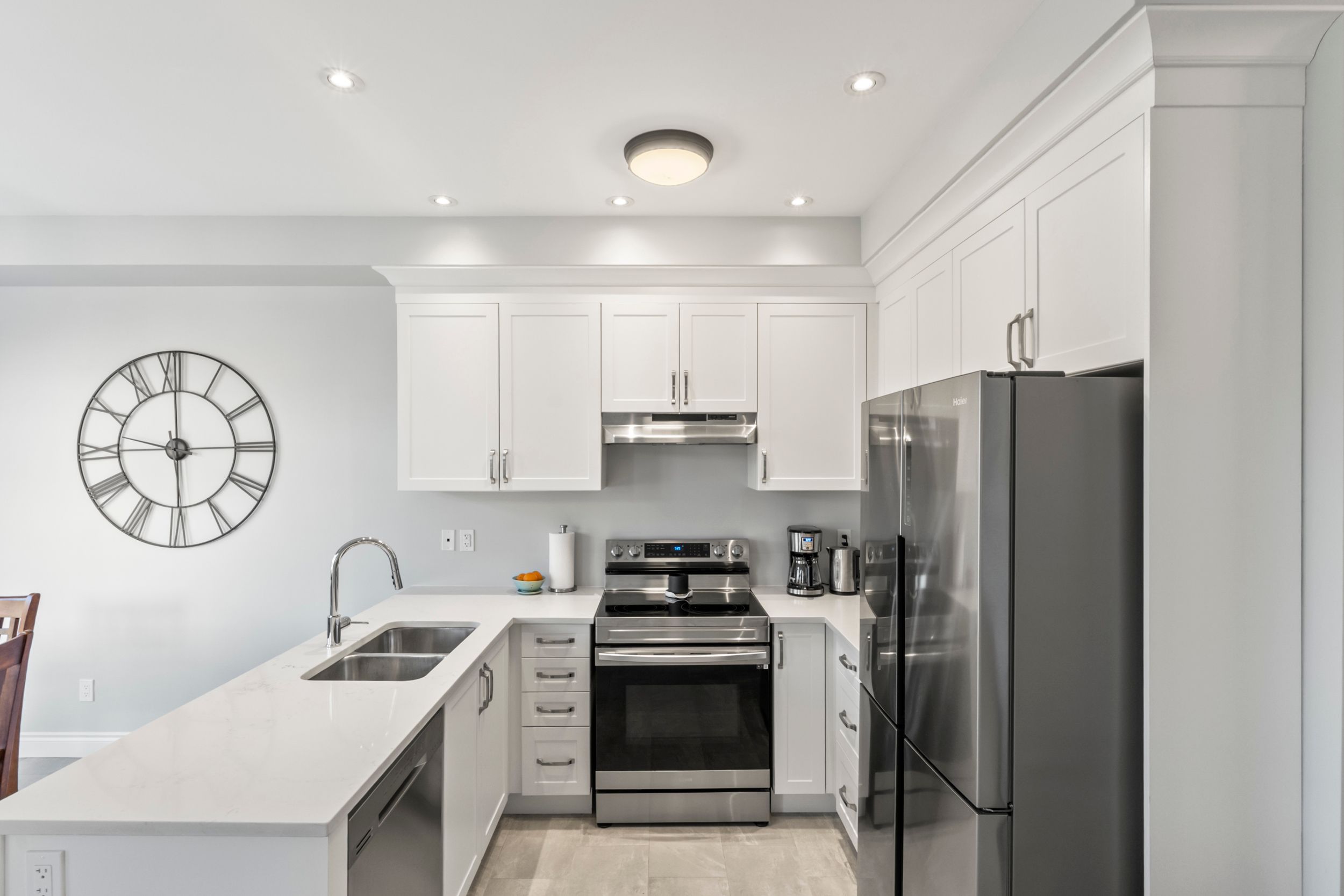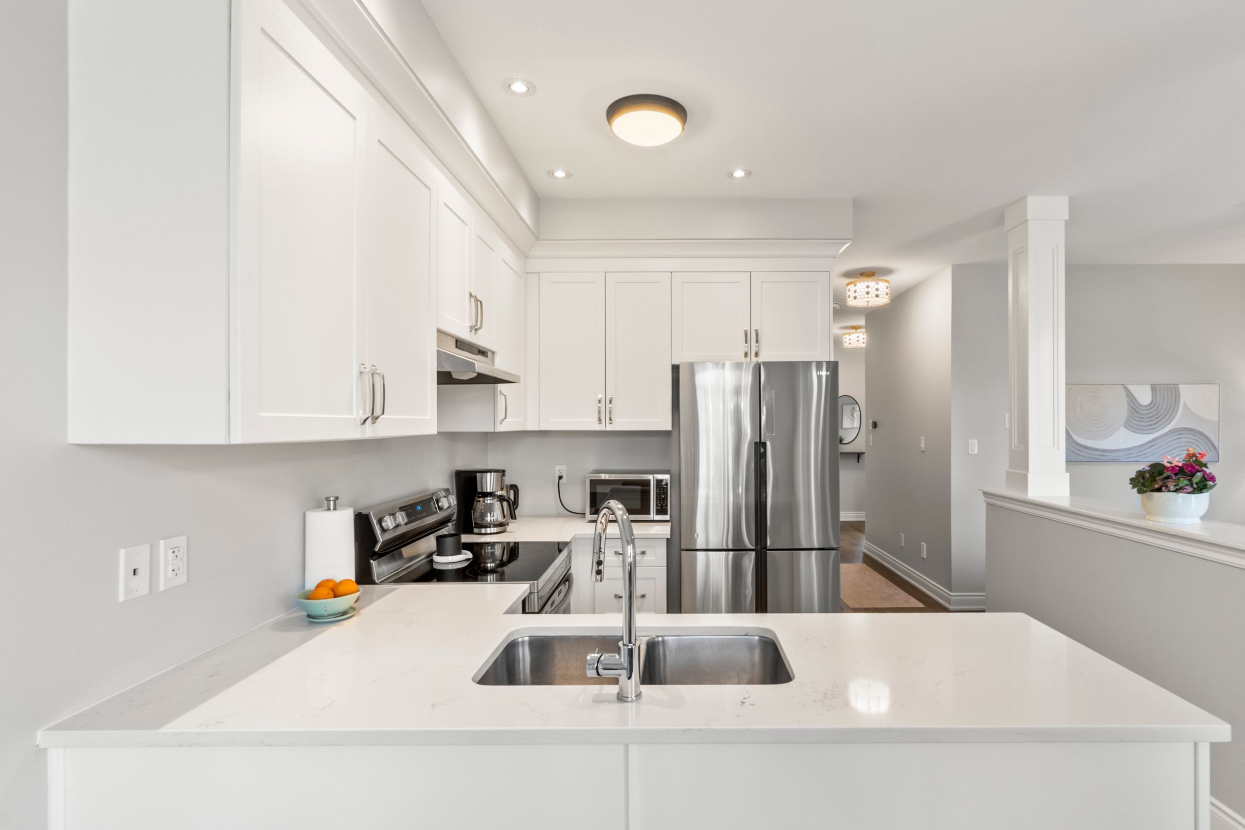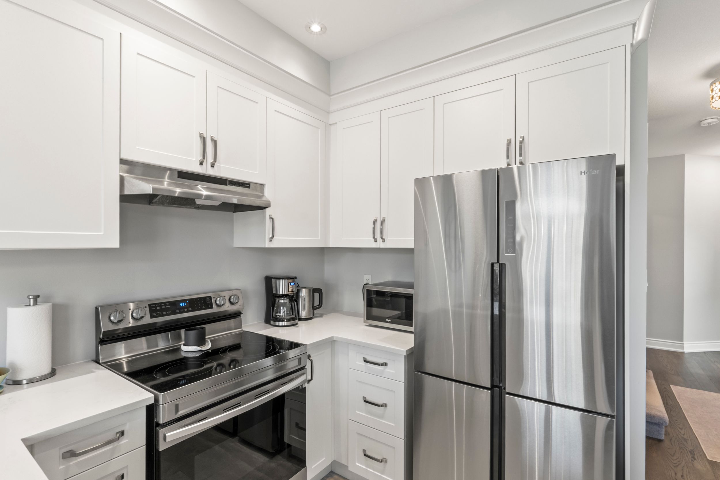 • Stylish kitchen with quartz counters and stainless steel appliances.