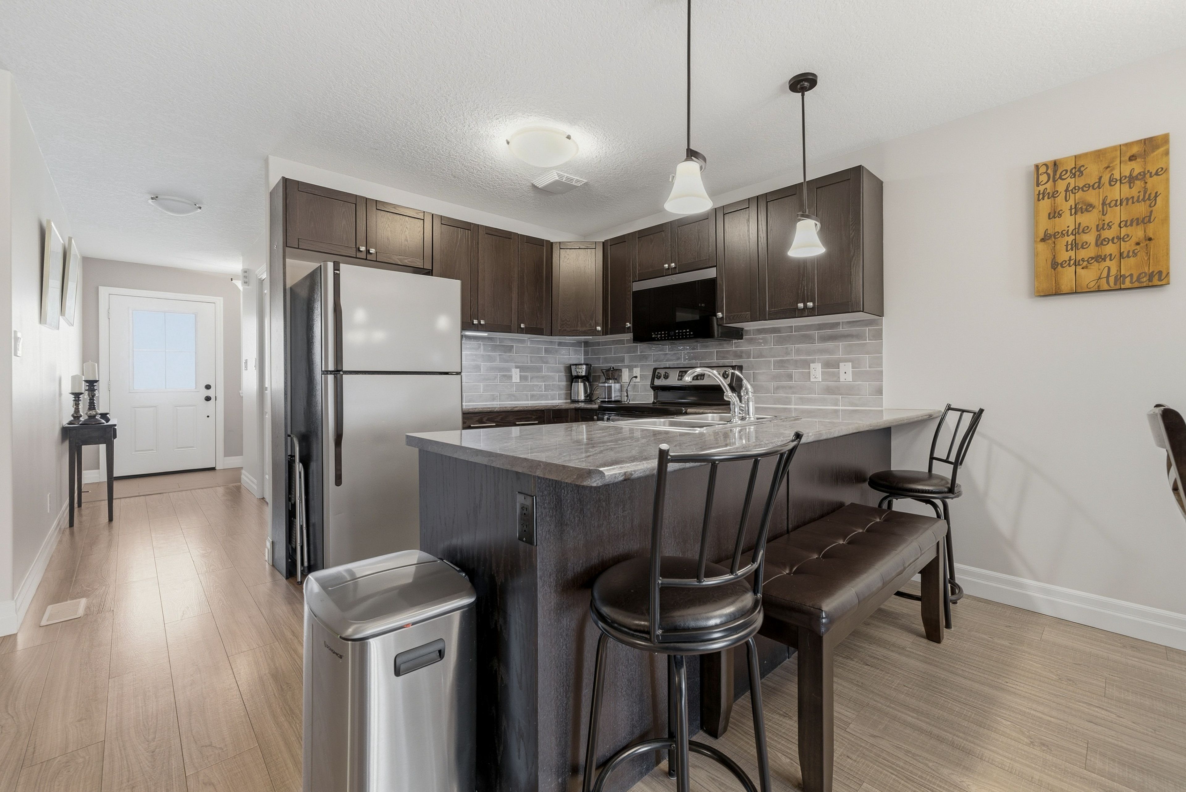Welcome to this professionally finished, turn-key townhome located in one of quinte west's most sought-after neighborhoods. Perfectly positioned for the modern lifestyle, you are minutes away from local shopping, essential amenities, and easy 401 access-making it an ideal hub for commuters. The heart of the home features a seamless open-concept design, blending the kitchen, living, and dining areas into one inviting space. The kitchen features a stylish tile backsplash, premium stainless steel appliances, and a functional peninsula with a breakfast bar. Step through the patio doors onto your private deck, leading to a fully fenced backyard with a bonus hot tub for soothing relaxation. The spacious main bedroom featuring a large walk-in closet and a "cheater" door for direct access to the main bath. Space to grow and entertain in the fully finished basement adds significant value, offering an expansive recreation room perfect for movie nights or a home gym, a private additional bedroom, ideal for guests or a home office. A secondary full bathroom for added convenience. Attached garage, great curb appeal, this home is a must see!