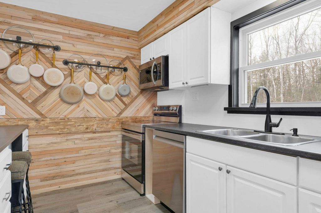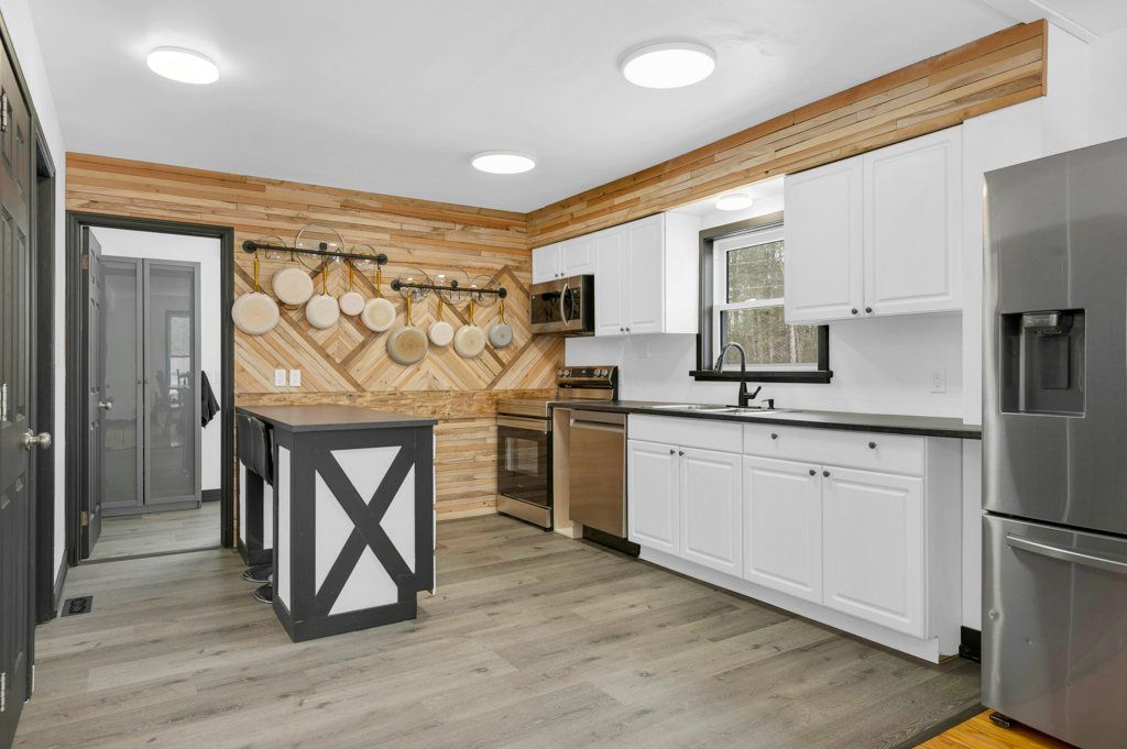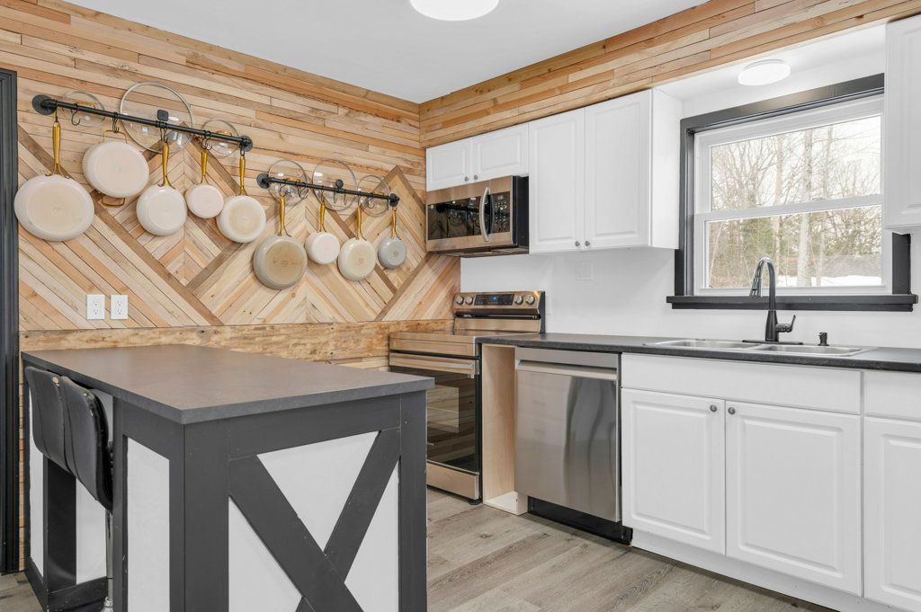 • Open concept living area with a cozy wood-burning fireplace.