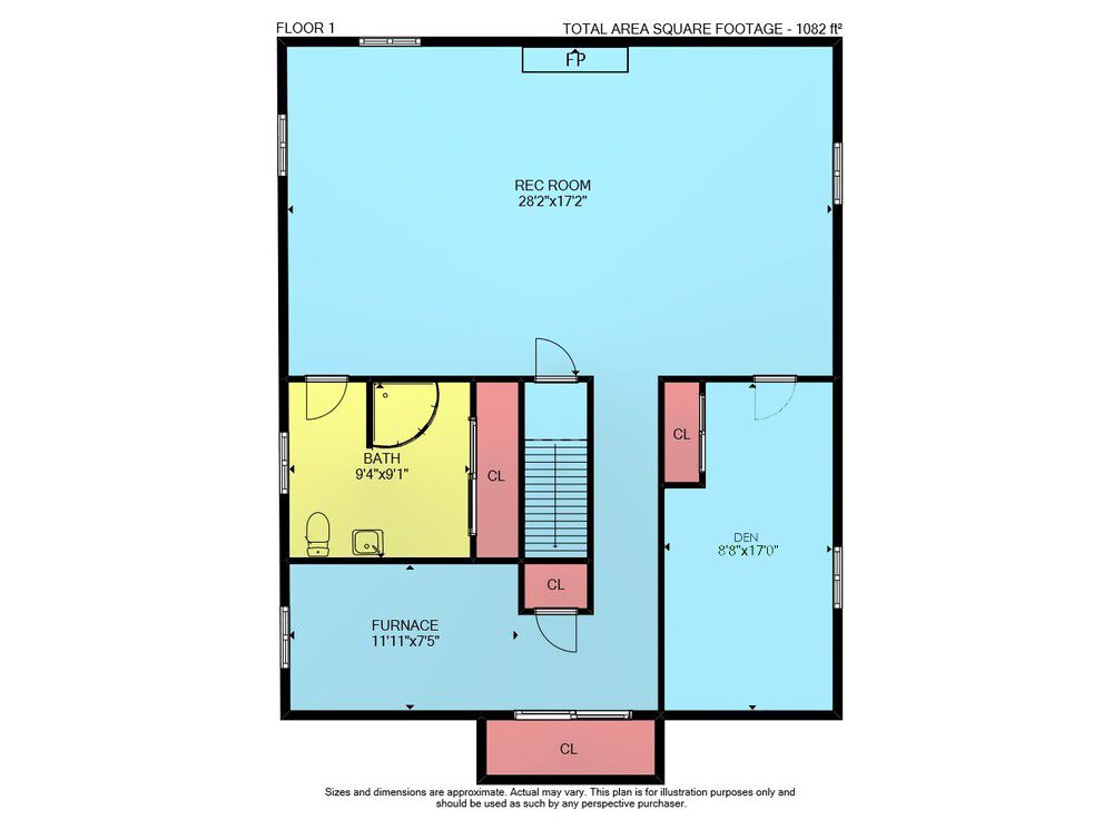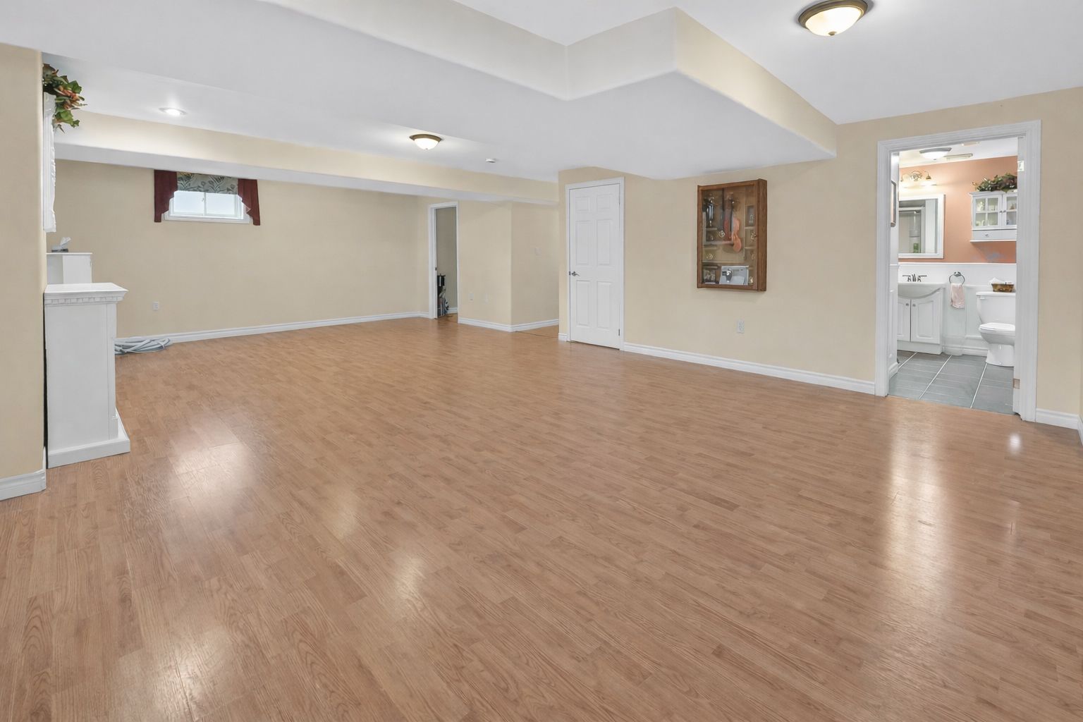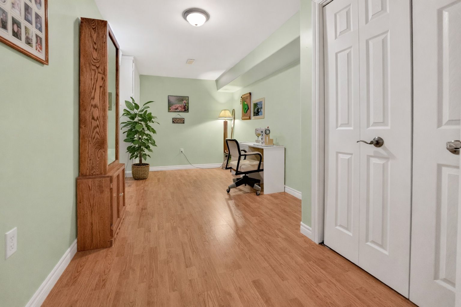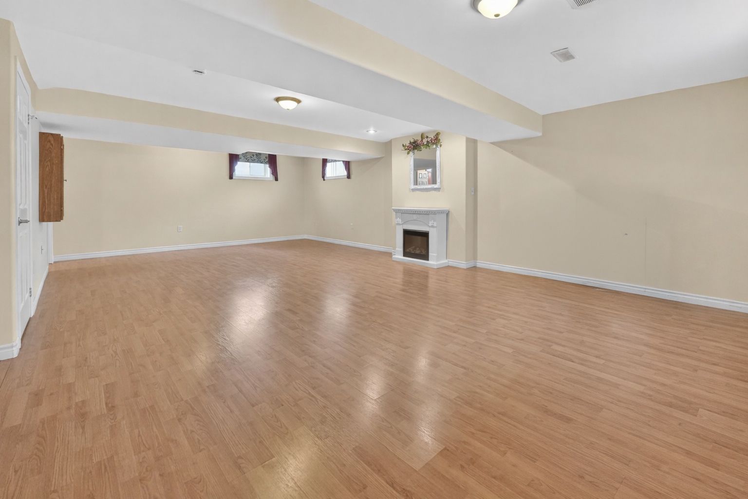• Spacious lower level family room with electric fireplace and bonus office space.