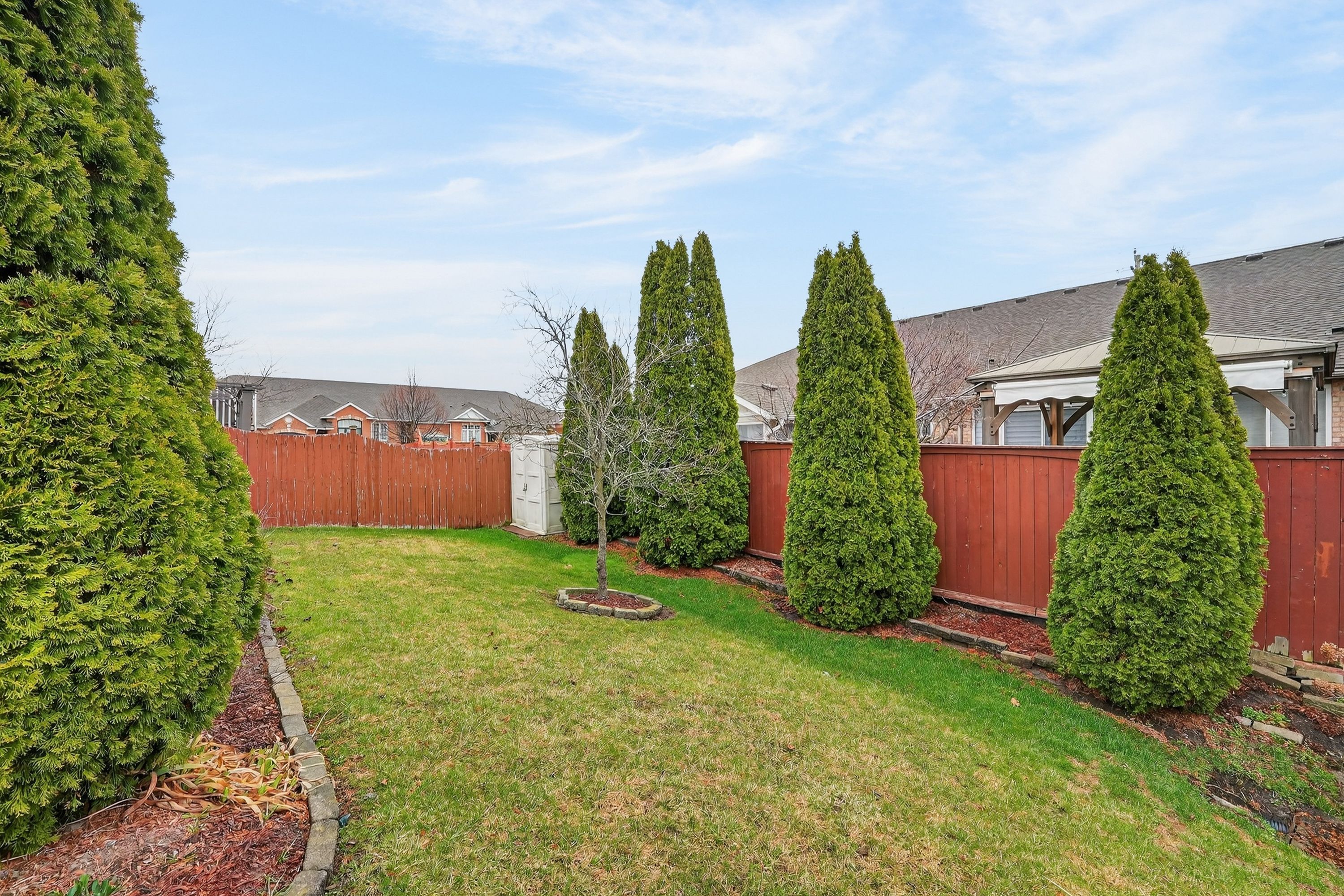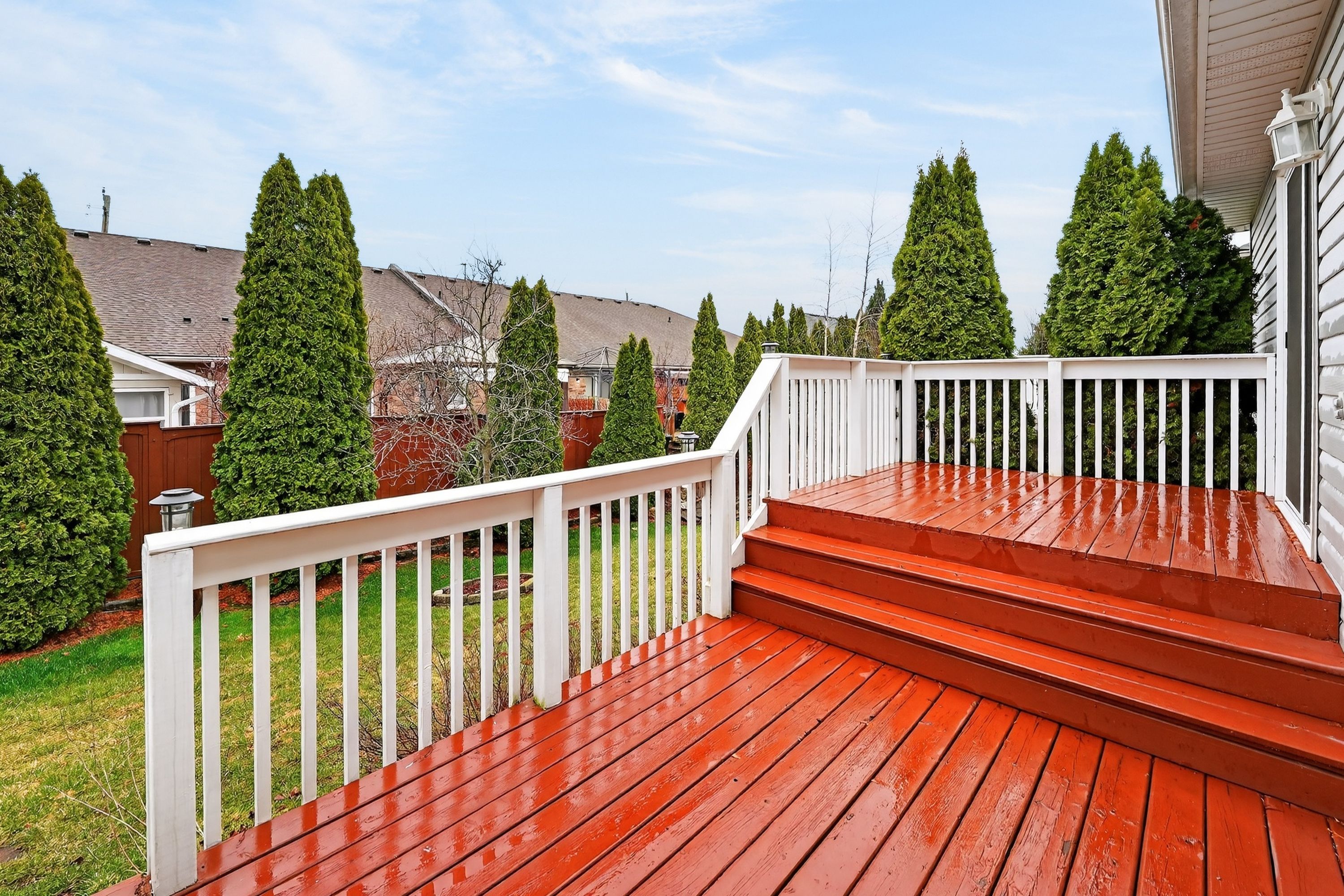 • Two-tiered deck with a partially fenced yard and Rubbermaid storage shed.