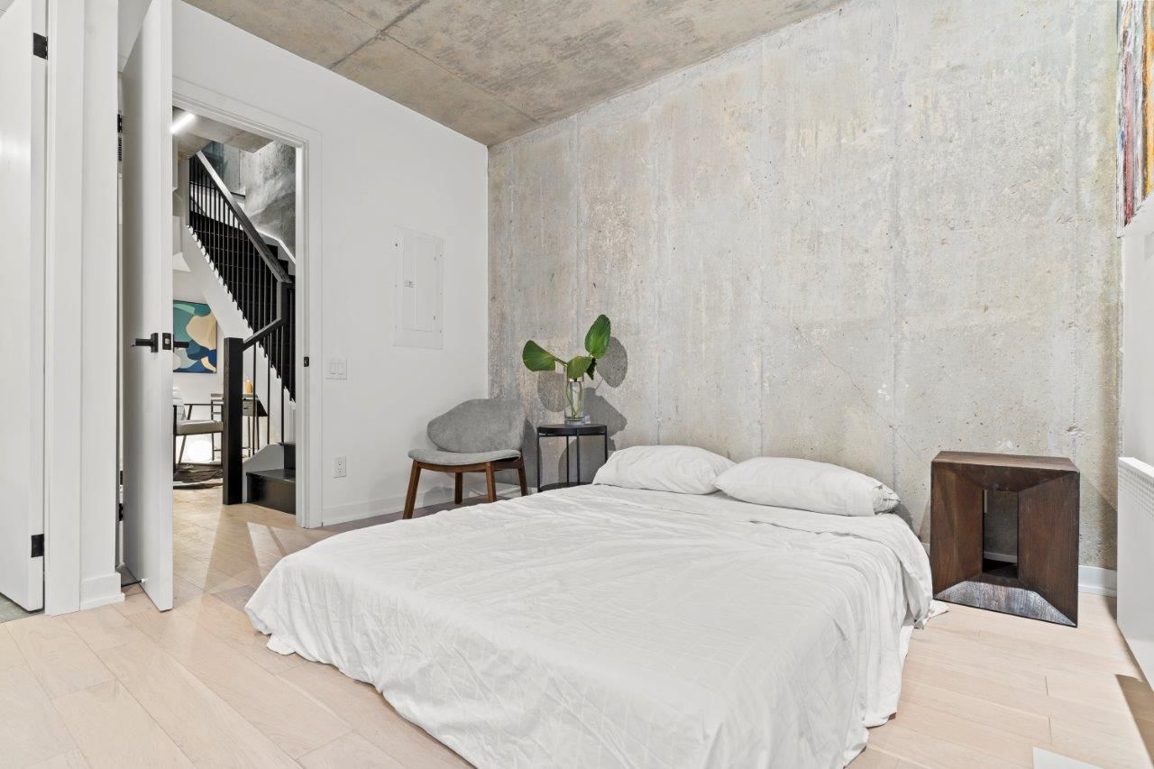 Welcome to this sleek, contemporary 2-bedroom, 2. 5-bathroom stacked townhome, perfectly situated for city access and convenience. Concrete construction throughout for security & quiet enjoyment of living space. Located minutes from highway 401 and nestled between two subway stations, this home offers unbeatable connectivity for commuters and city lovers alike. Spanning two spacious levels, this unit boasts 9. 5 ft. Exposed concrete ceilings and premium finishes throughout. The open-concept living area flows effortlessly, complemented by a stunning north-south view that floods the space with natural light. The home includes a private walkout & beautiful garden terrace with water hose bib access and gas line for bbq totalling 322 sq. Ft., perfect for enjoying both morning coffee and evening relaxation. Inside, you'll find countless upgrades, including large custom walnut closet millwork, high end light fixtures and window coverings, upgraded modern cabinetry, integrated fridge, freezer, dishwasher - stainless steel slide in stove & microwave, caesar stone countertops/backsplash & engineered flooring throughout. Both bedrooms offer ample closet space, with the primary suite featuring an ensuite bathroom designed for comfort and style. This townhome seamlessly blends modern aesthetics with functional living, making it the perfect urban retreat. Parking spot is a rental in the underground **extras** all premium appliances, elfs & window coverings.