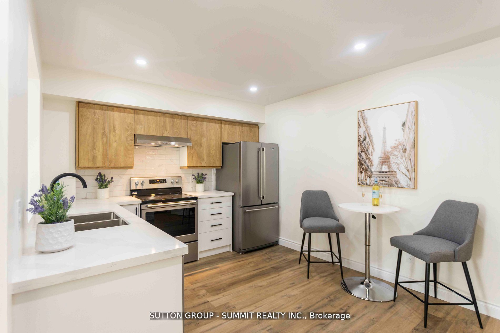 • Stylish kitchen with quartz countertops and stainless steel appliances.