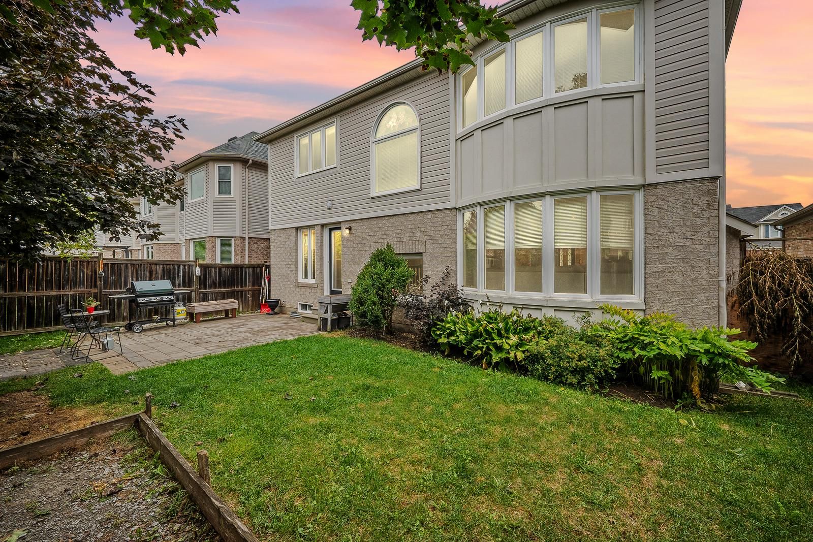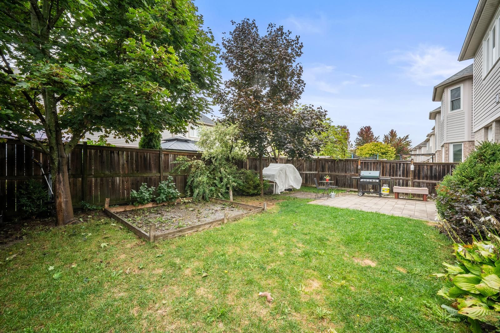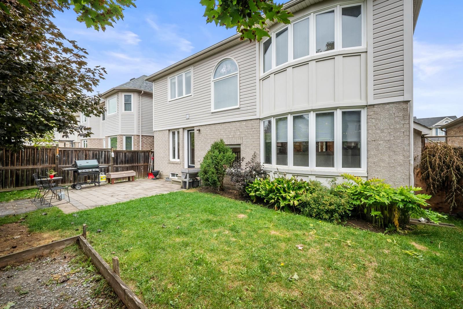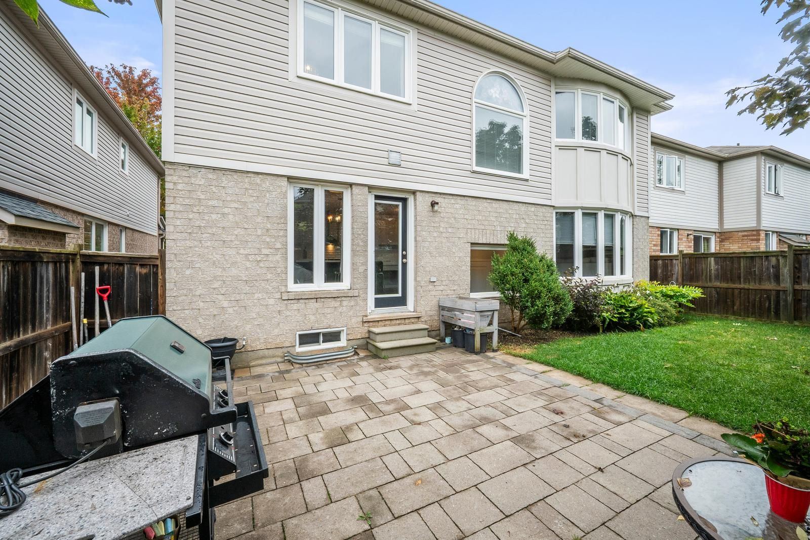 • Backyard designed for gatherings with interlock and space for a pool.