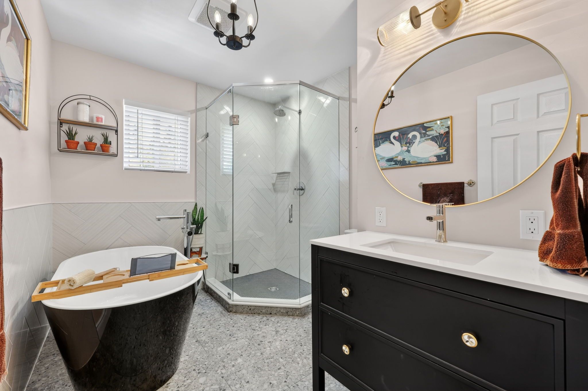 • Finished lower level with fireplace, extra bedroom, and spa-like bathroom.