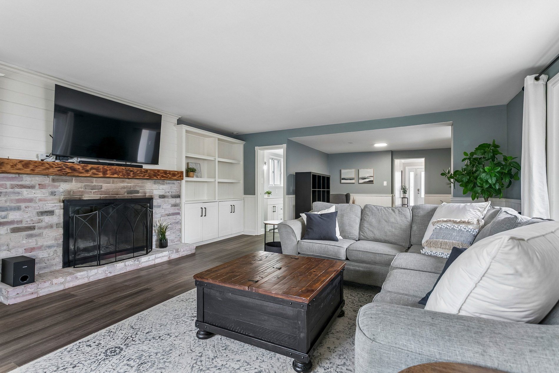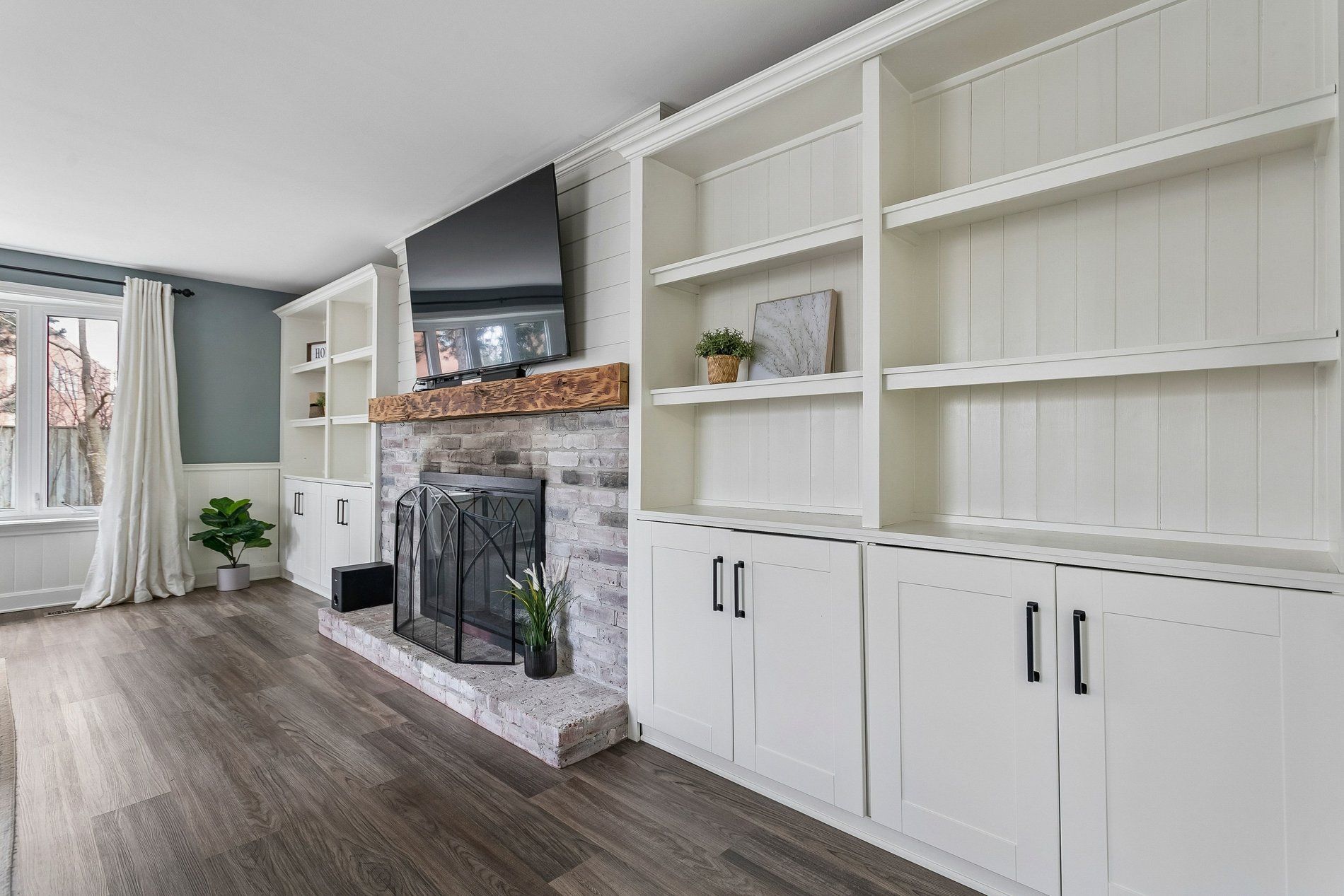 • Above-grade family room with custom cabinetry and wood-burning fireplace for comfort.