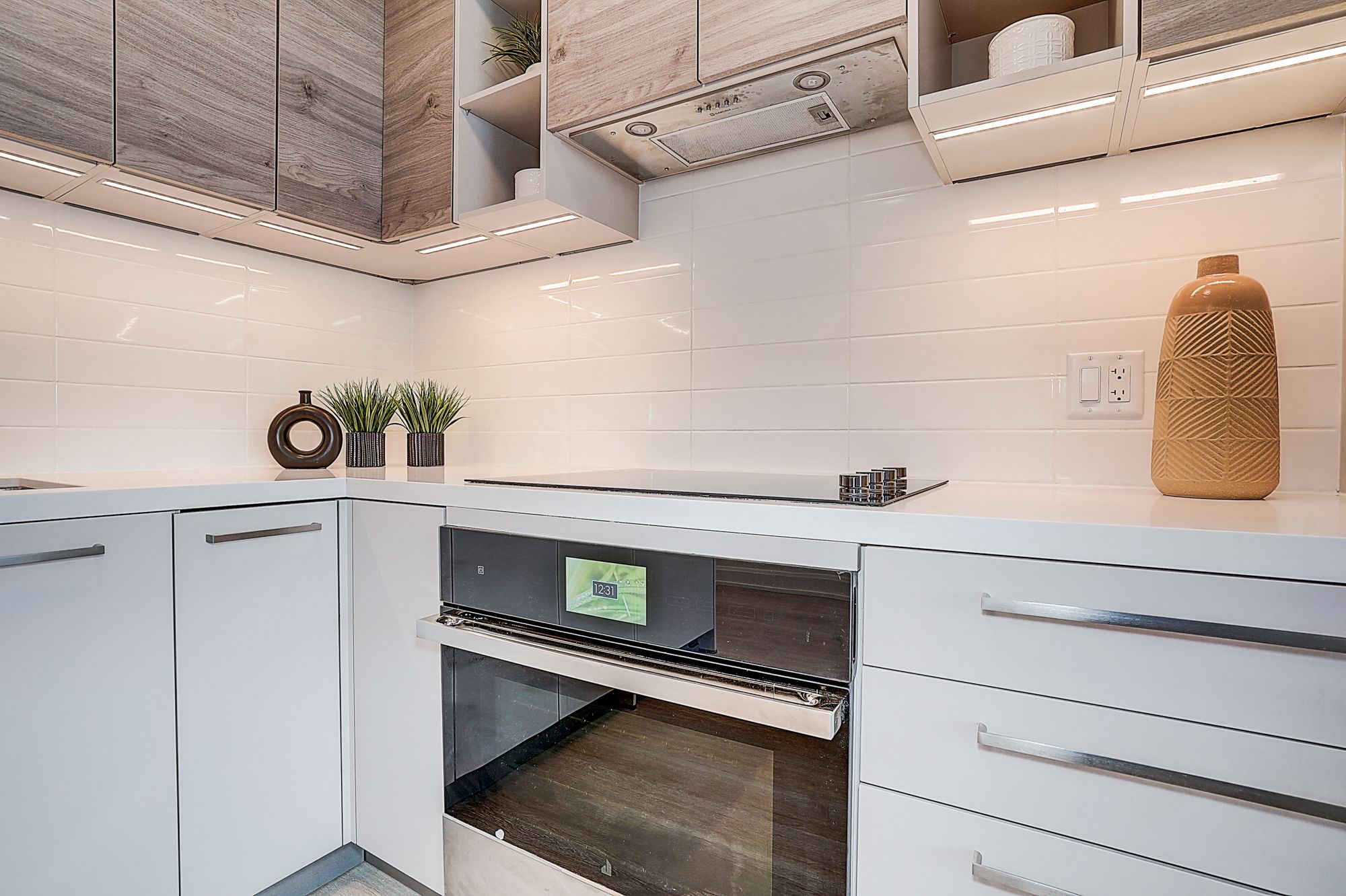 • Modern open-concept kitchen with stylish quartz countertops and built-in appliances.