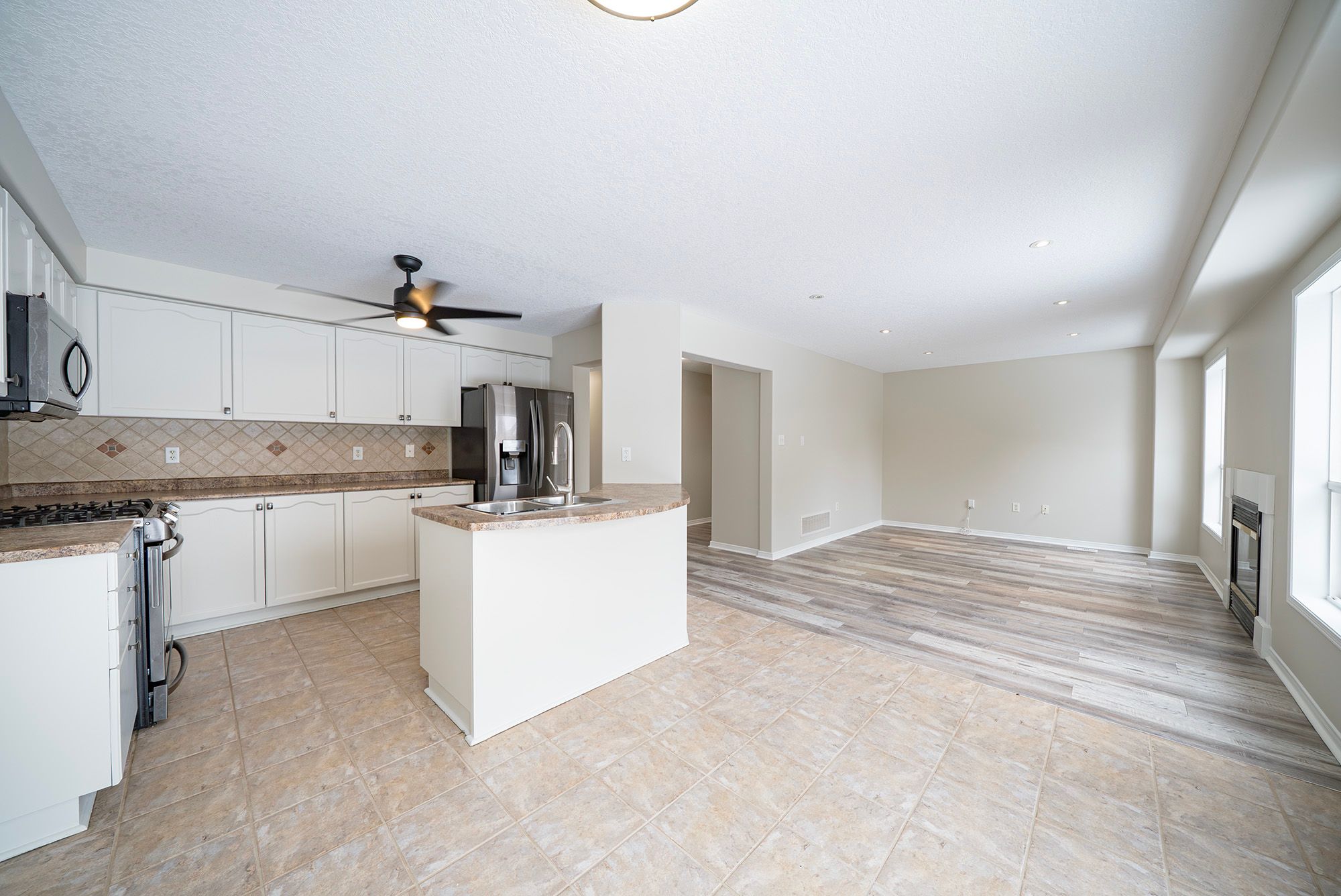 • Open-concept kitchen with modern appliances and a kitchen island.