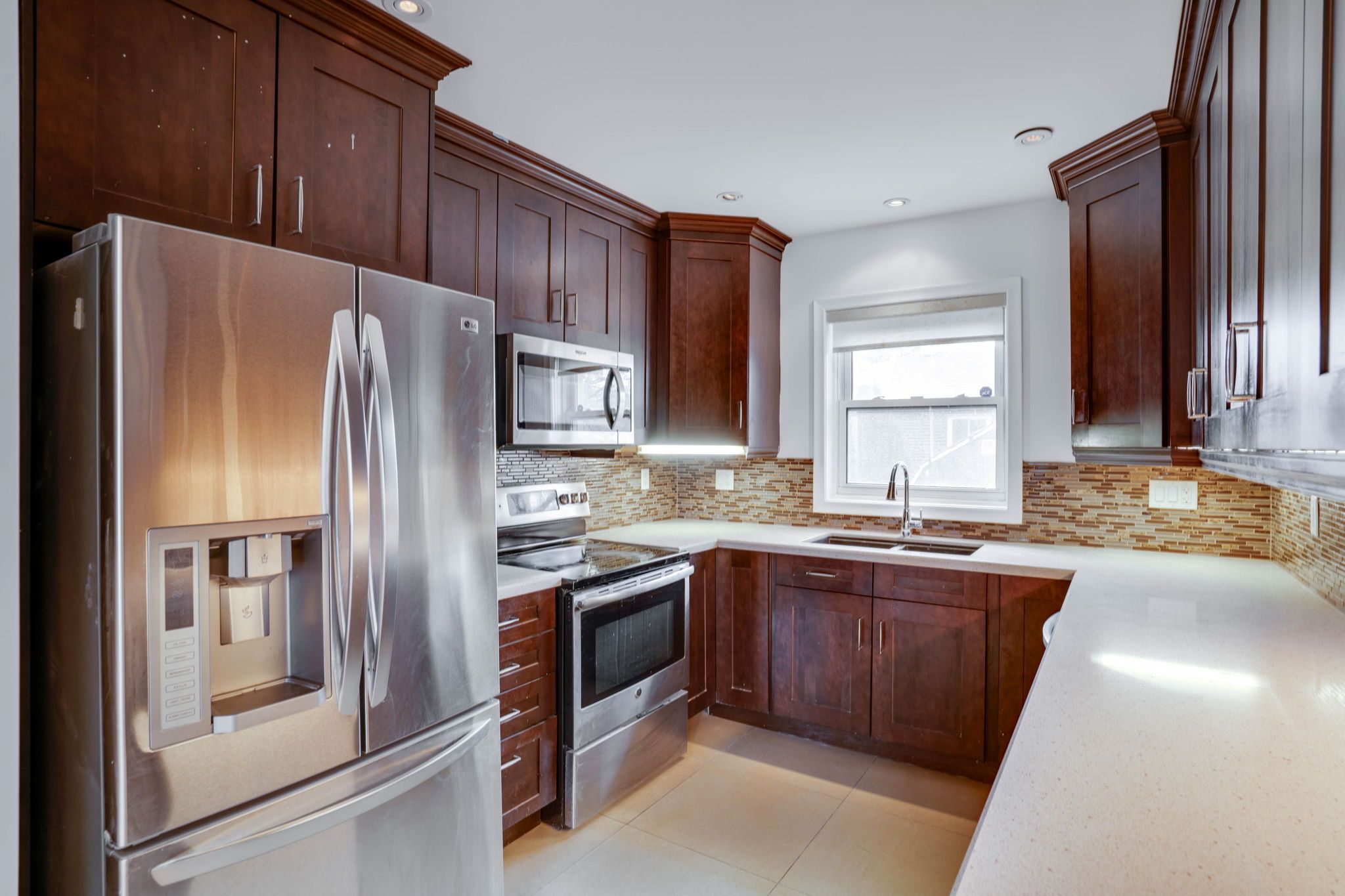 • Updated kitchen featuring stainless steel appliances and granite countertops.