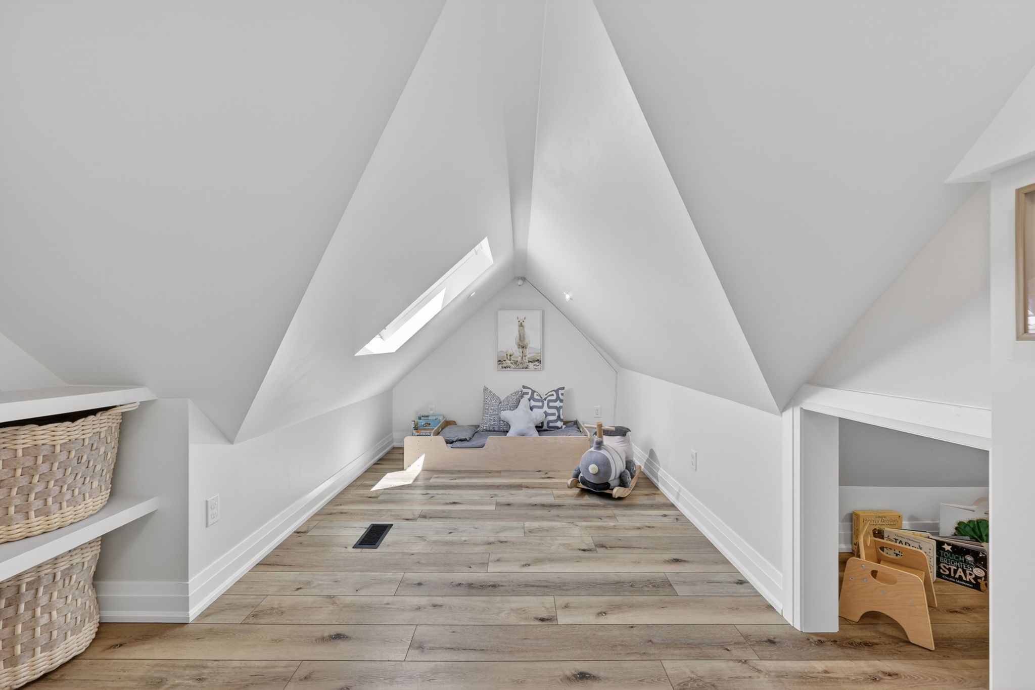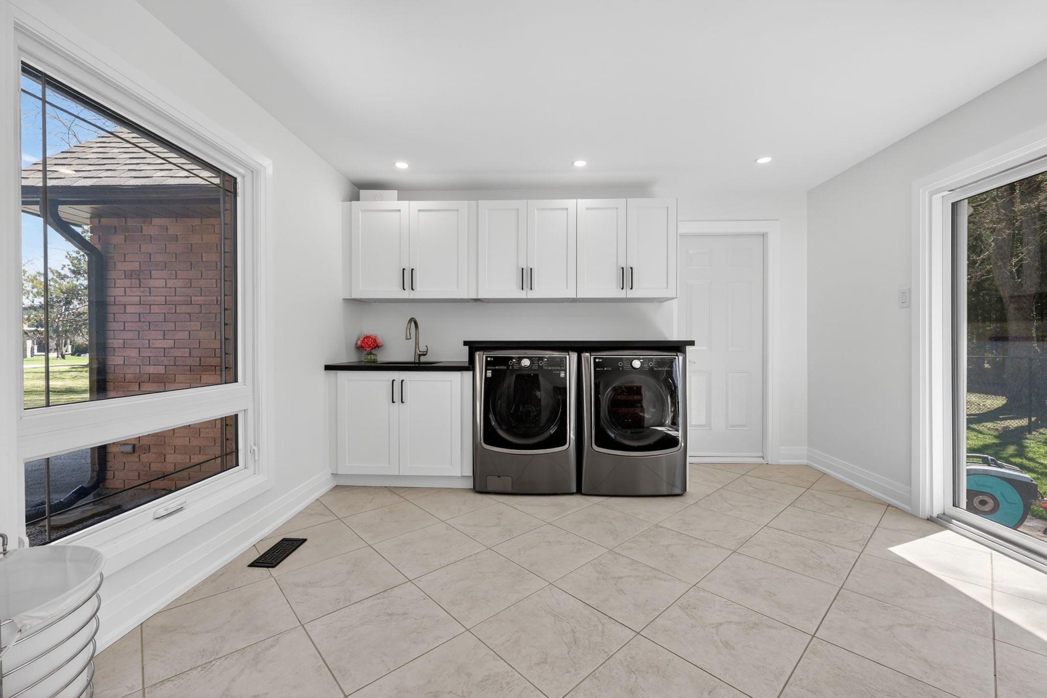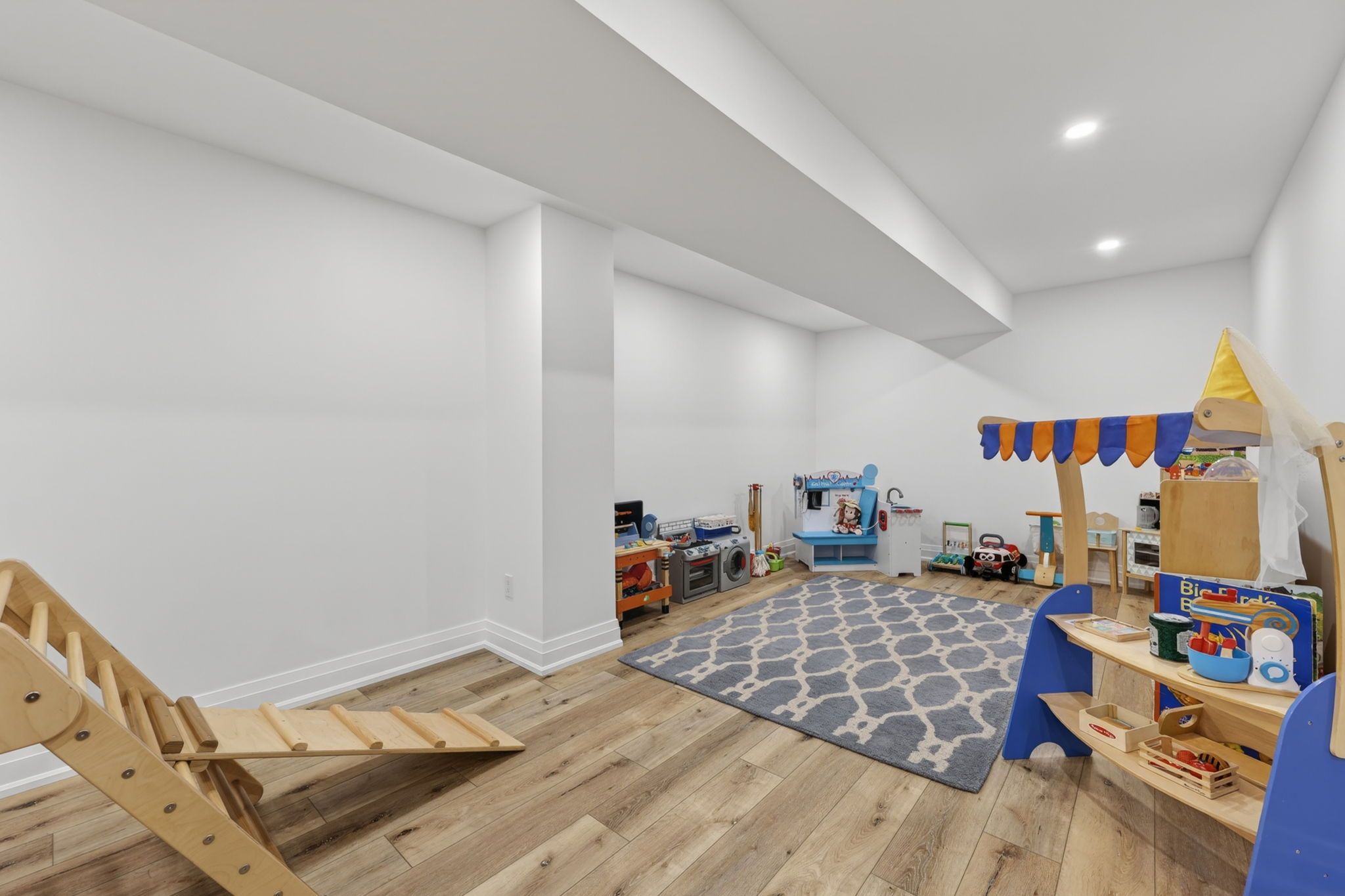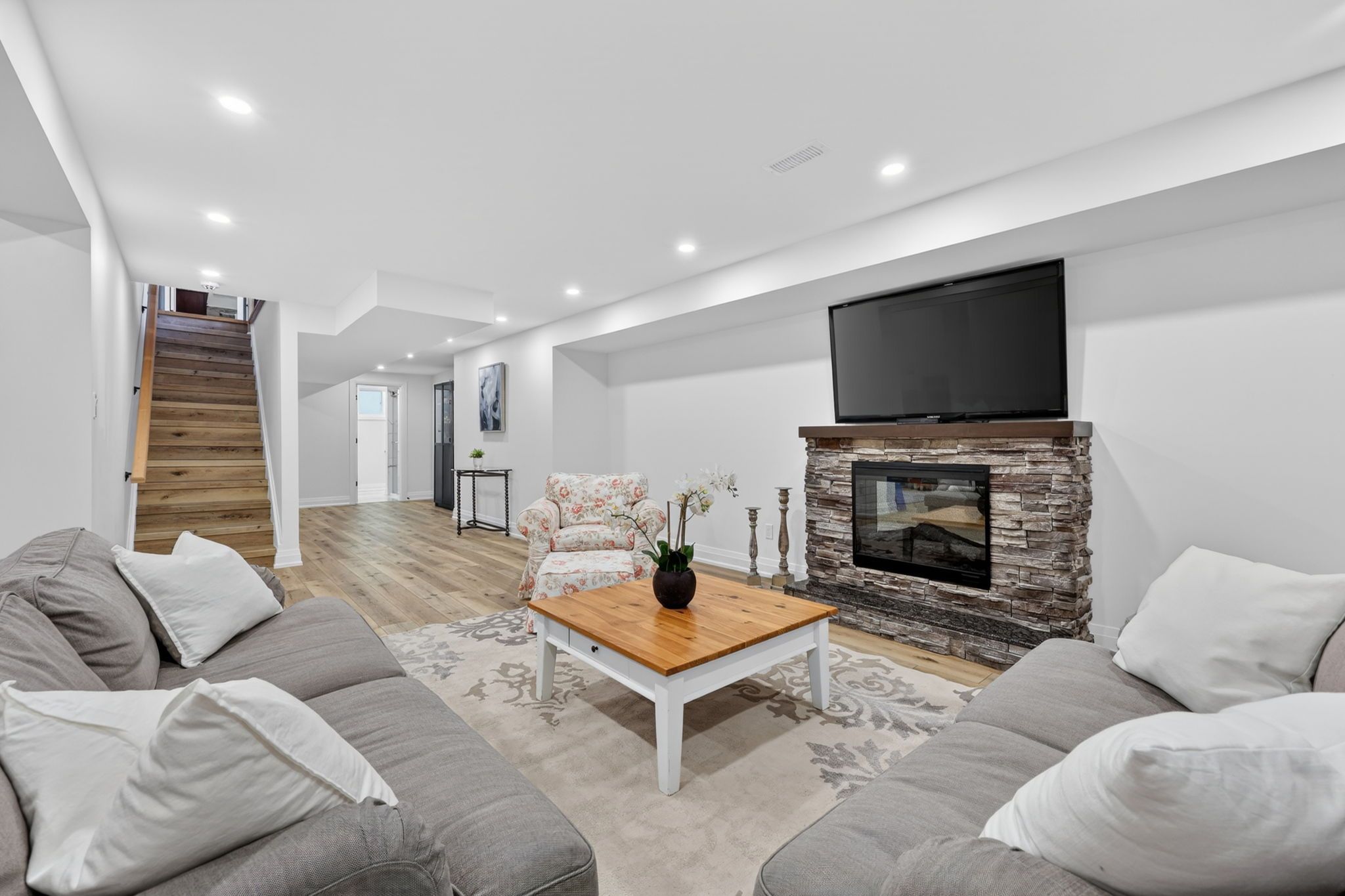 • Versatile basement with extra bedrooms, recreation area, and electric fireplace.