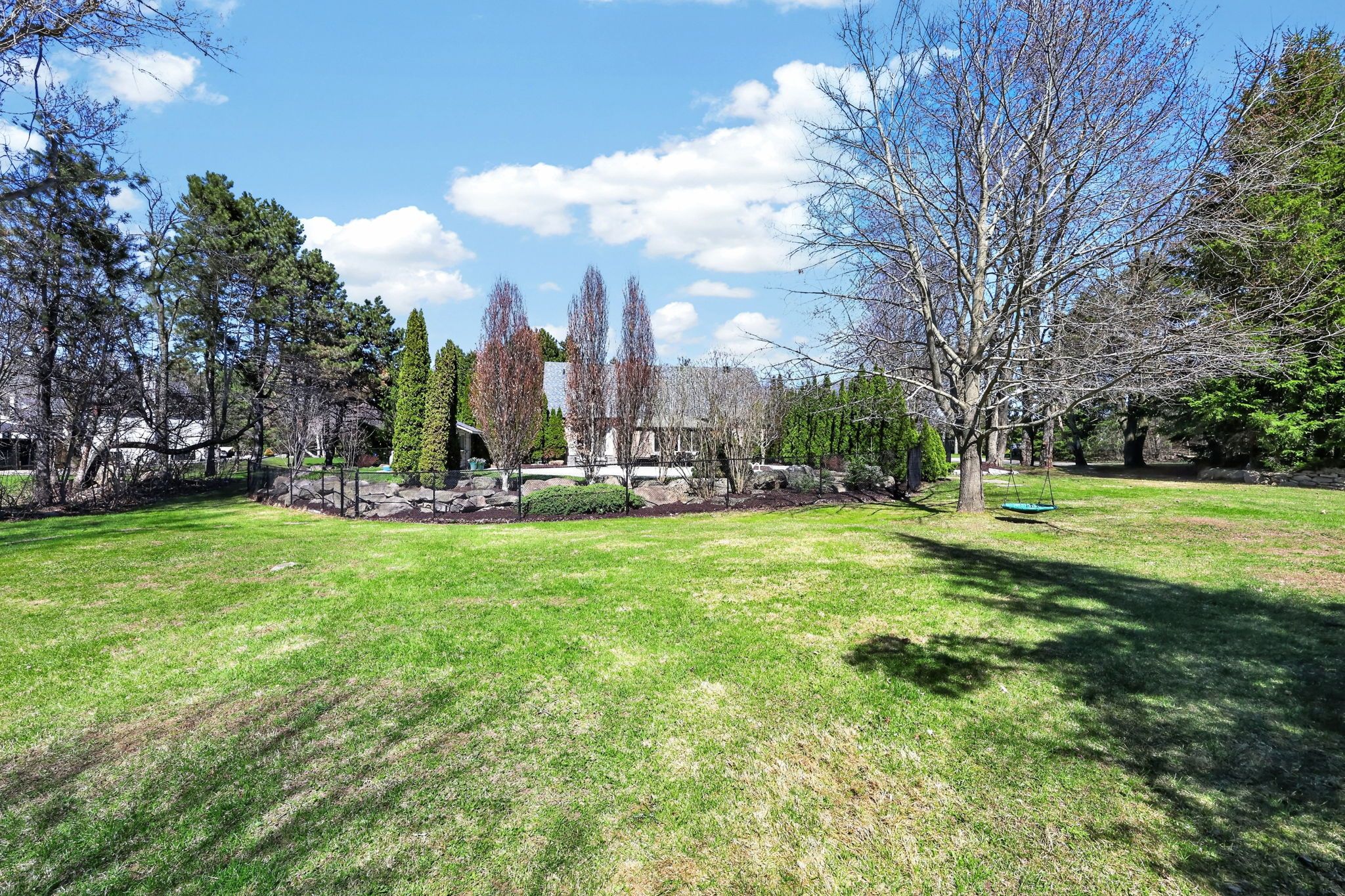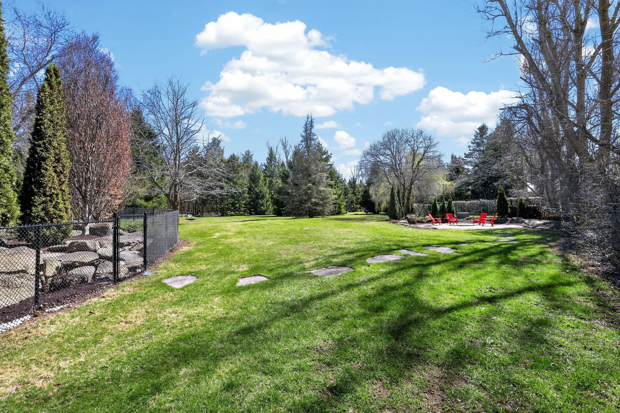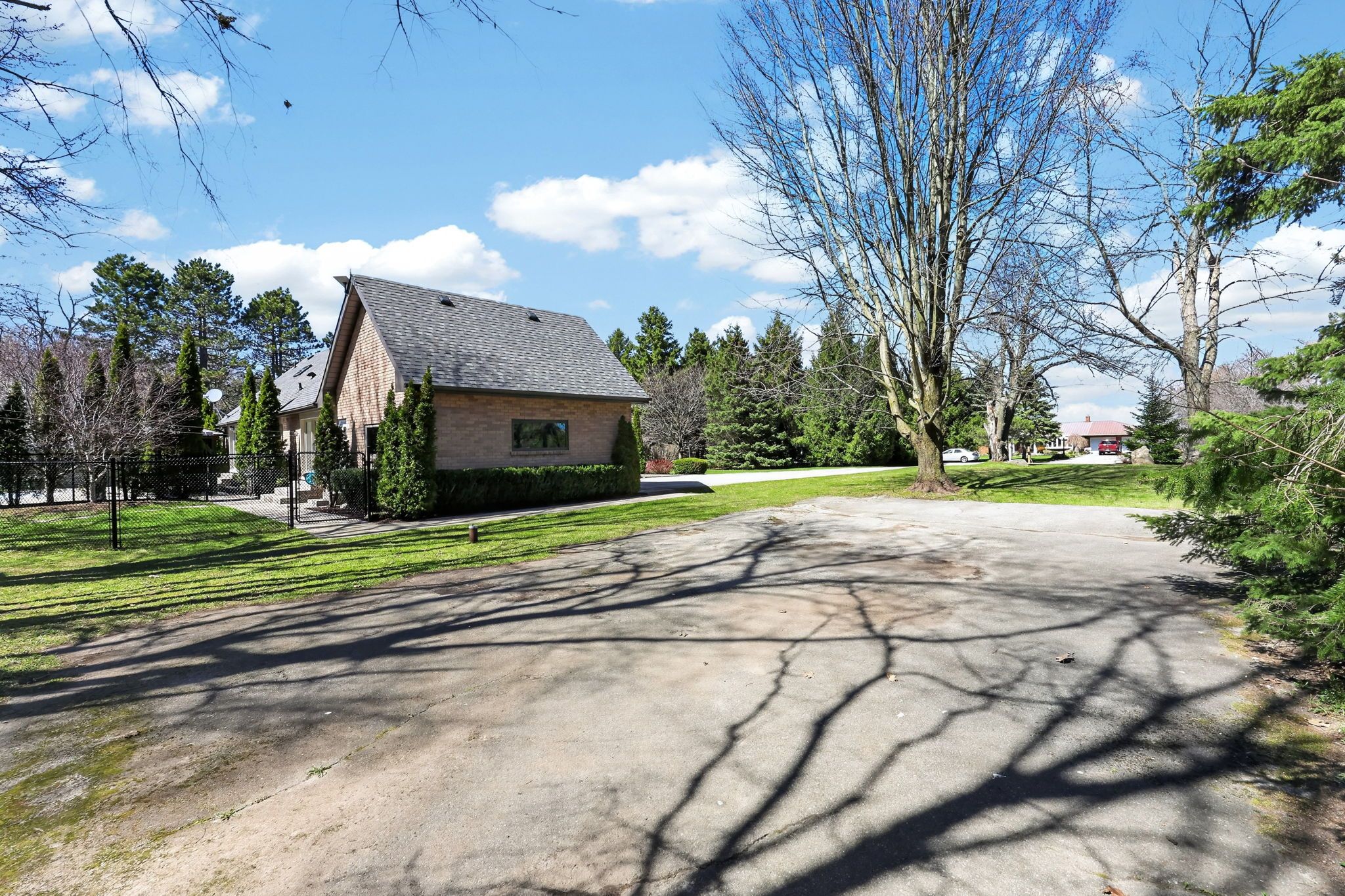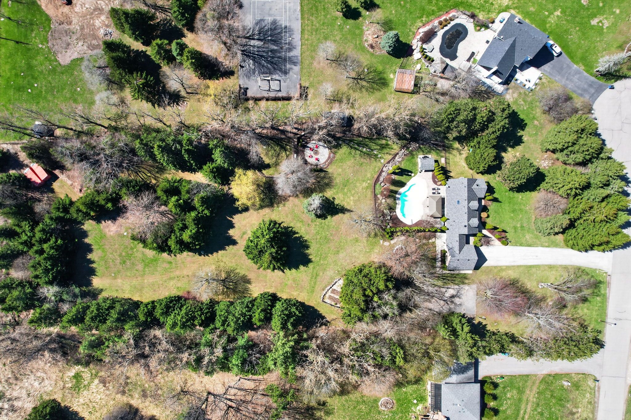 • Spacious yard for kids, basketball court, and walking trail amid mature trees.