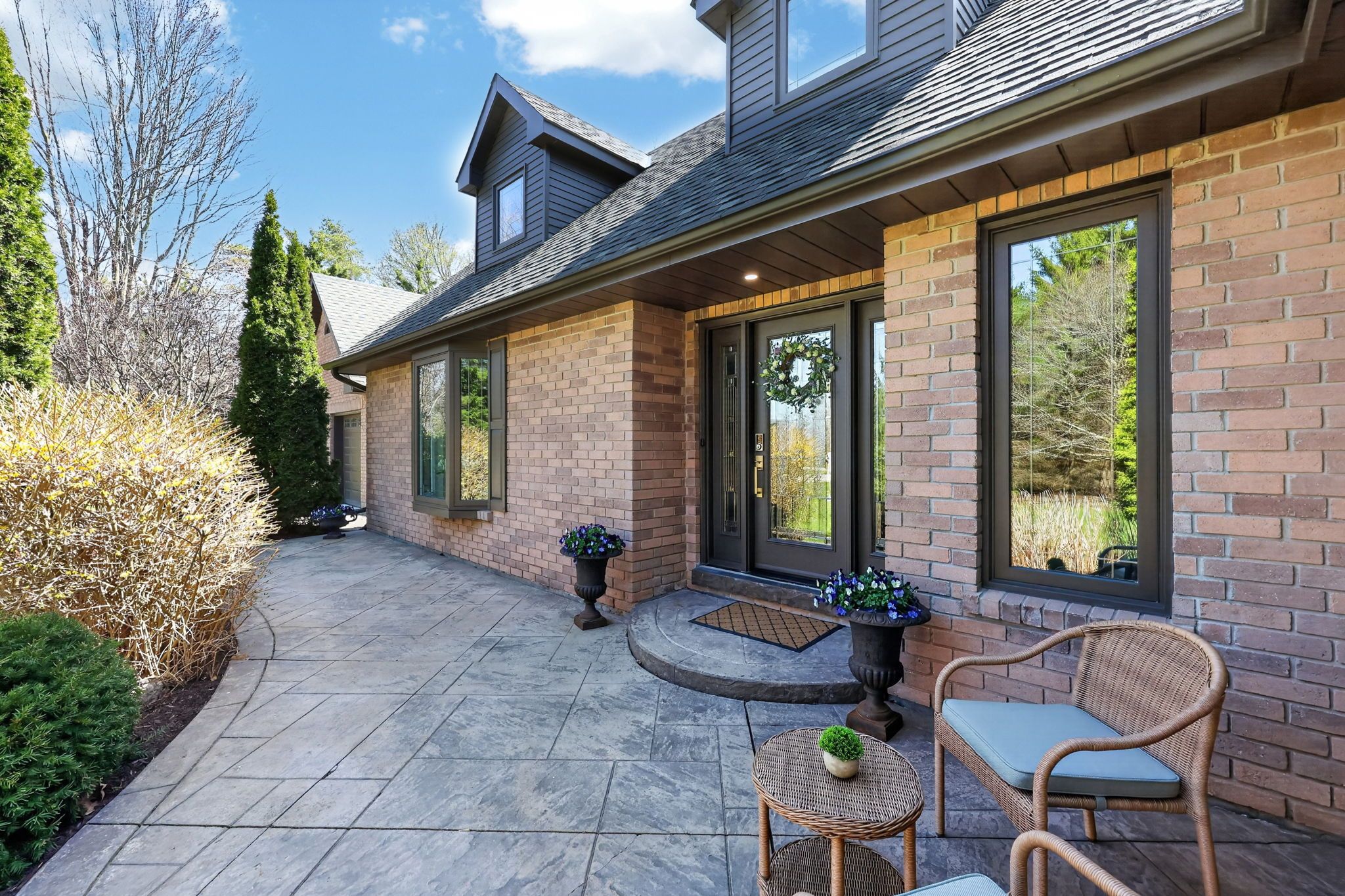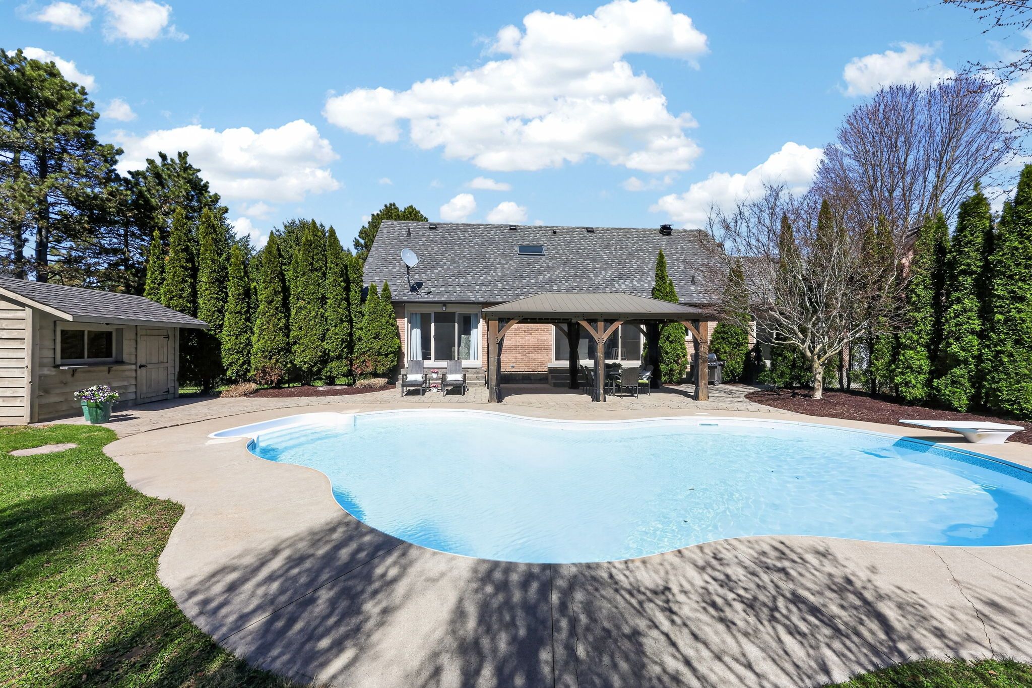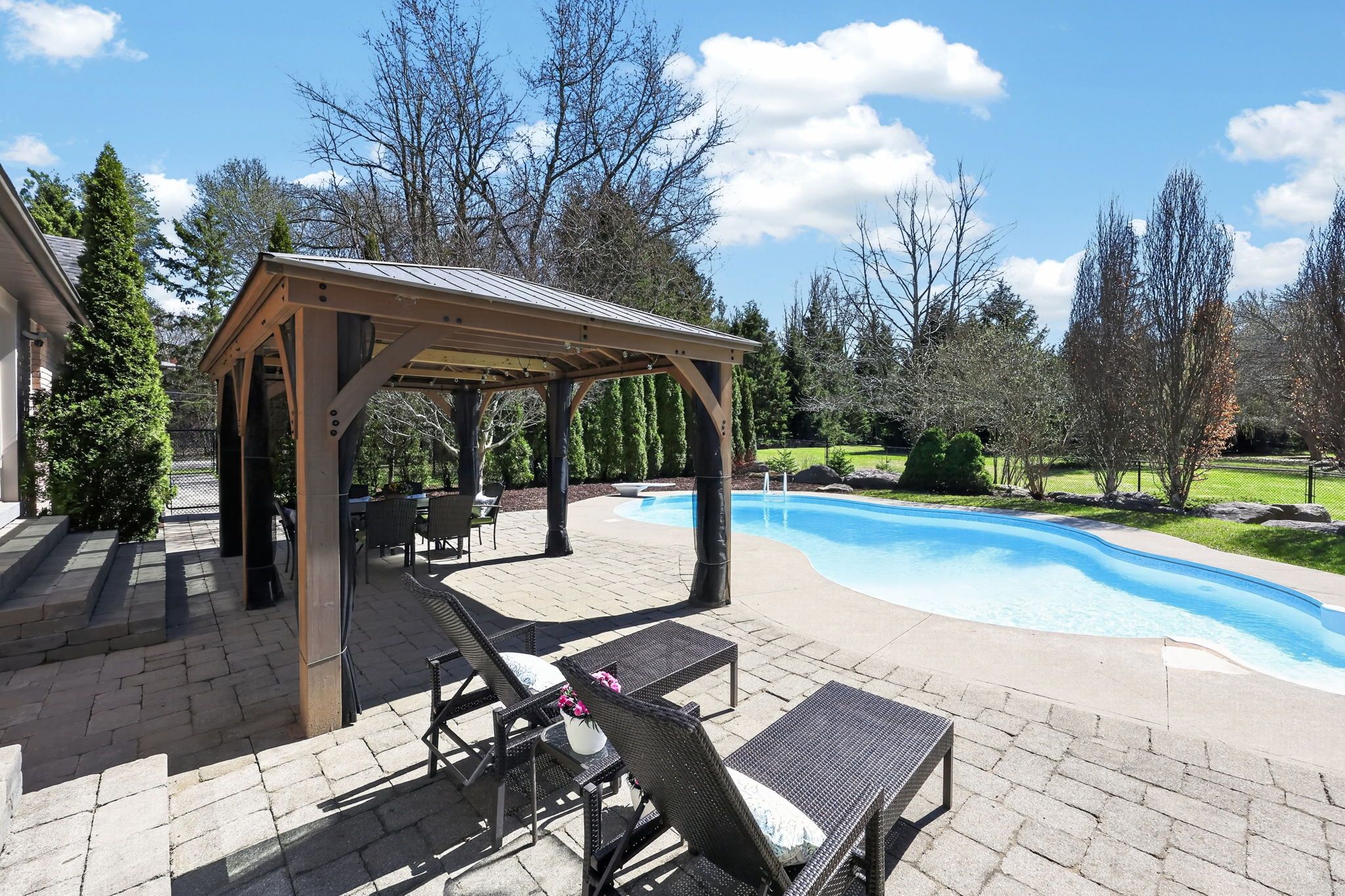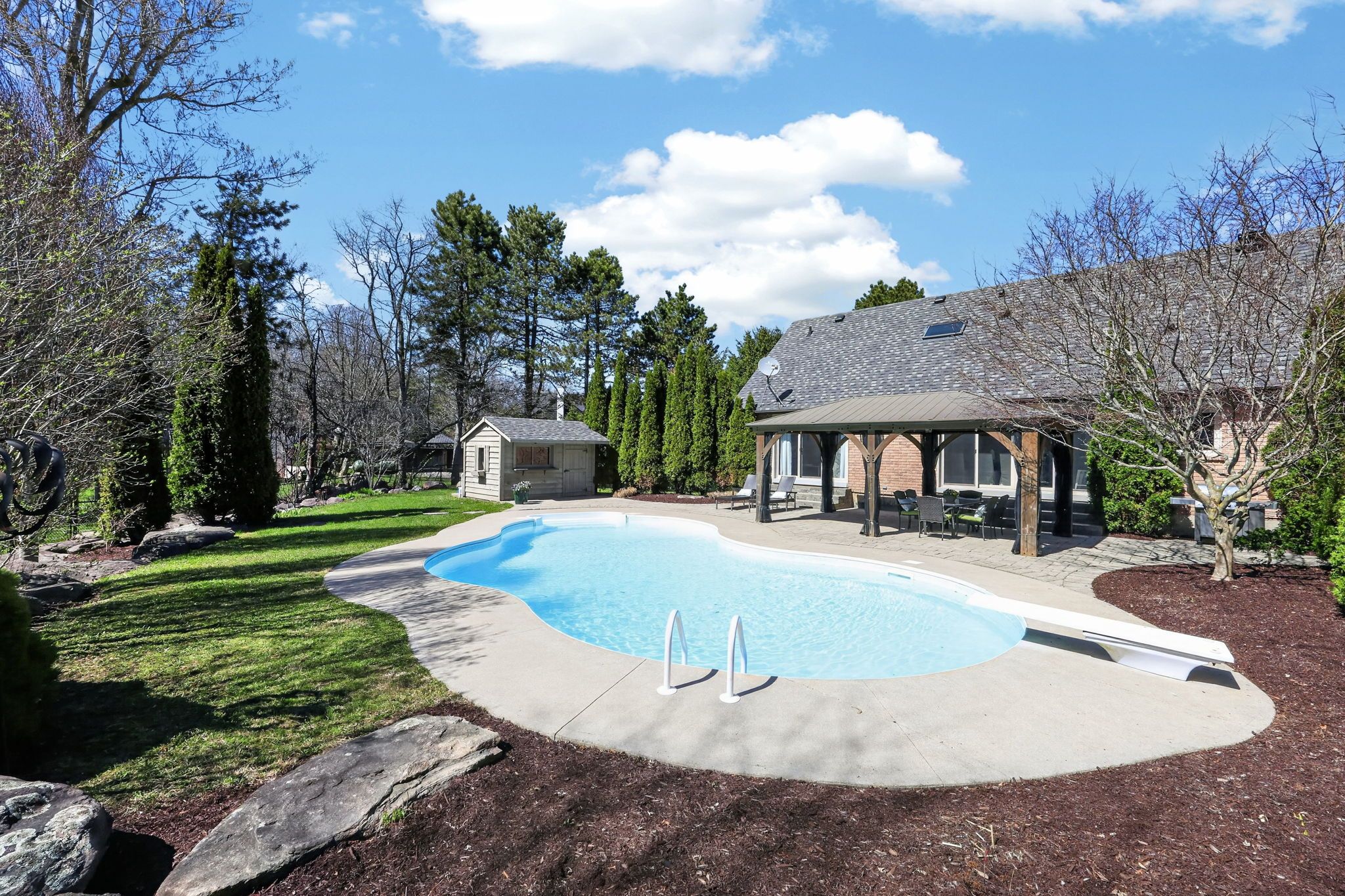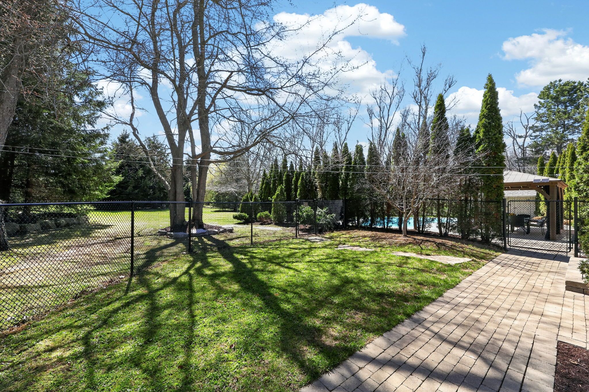 • Spacious yard for kids, basketball court, and walking trail amid mature trees.