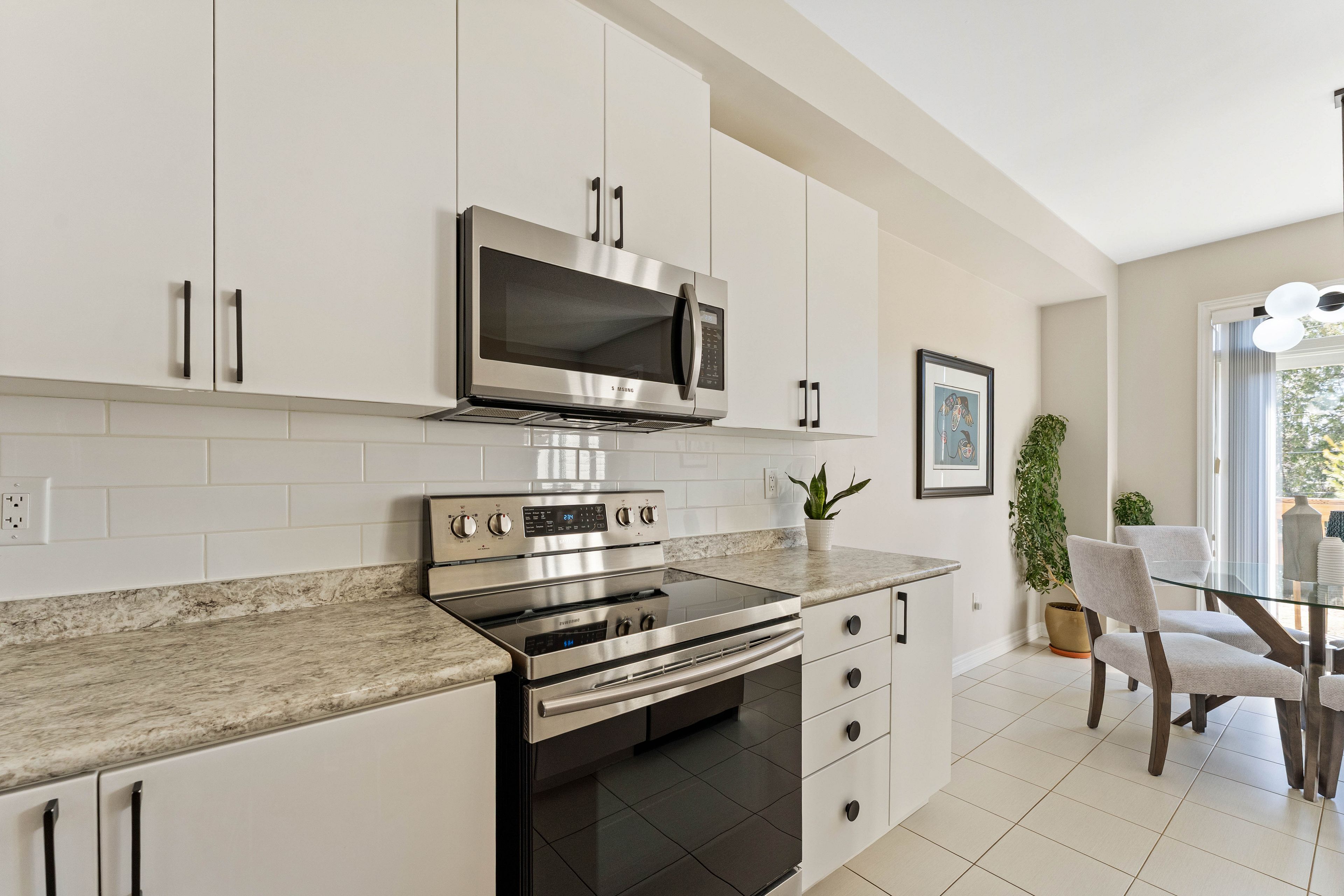 • Modern kitchen with ample cabinetry and access to private deck.