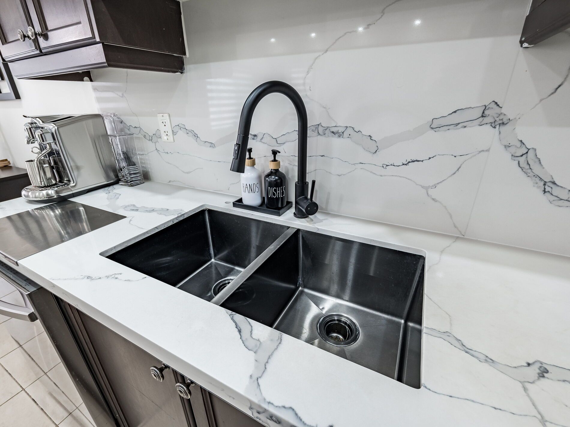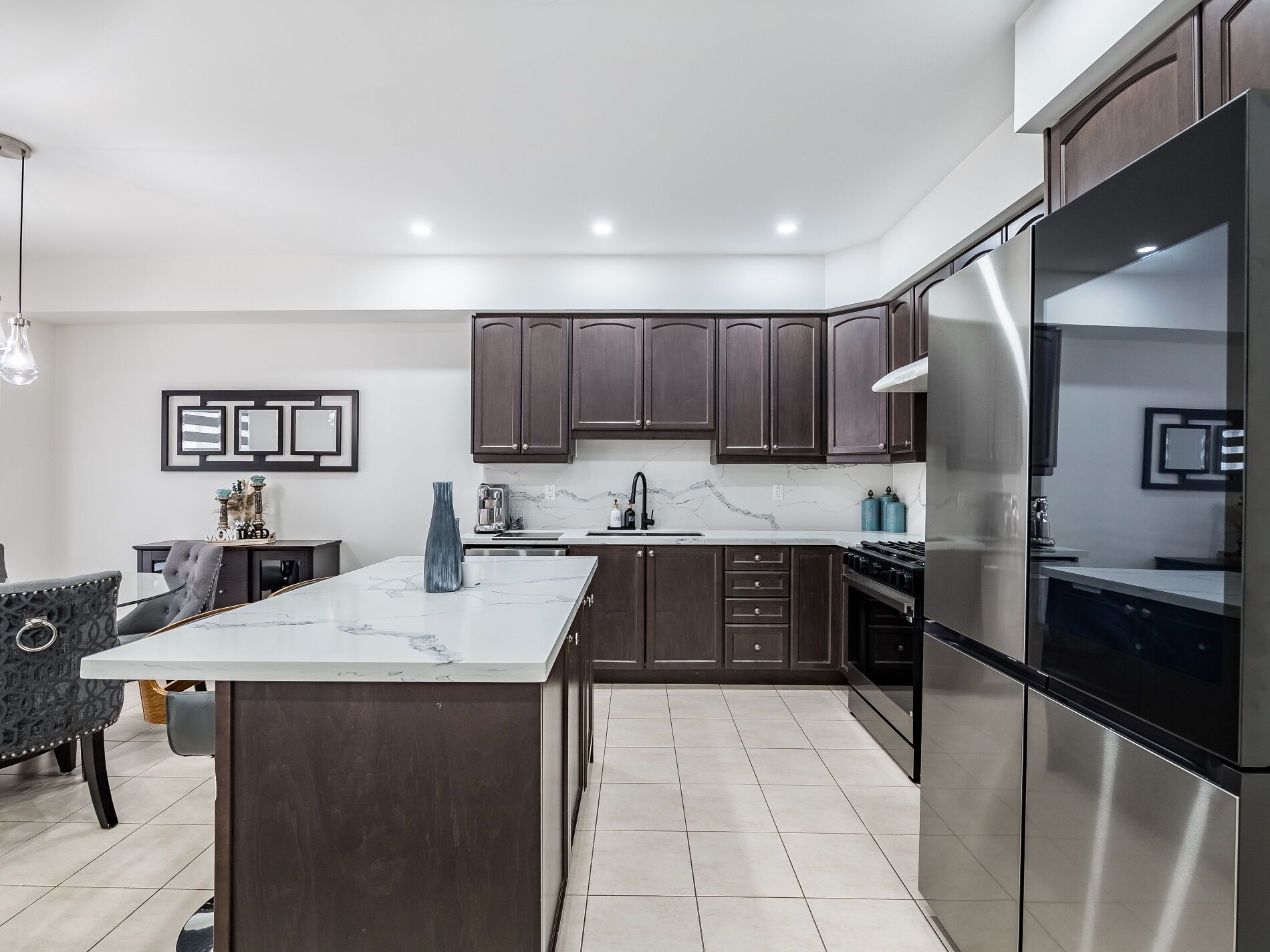 • Chef's kitchen features quartz countertops and stainless steel appliances.