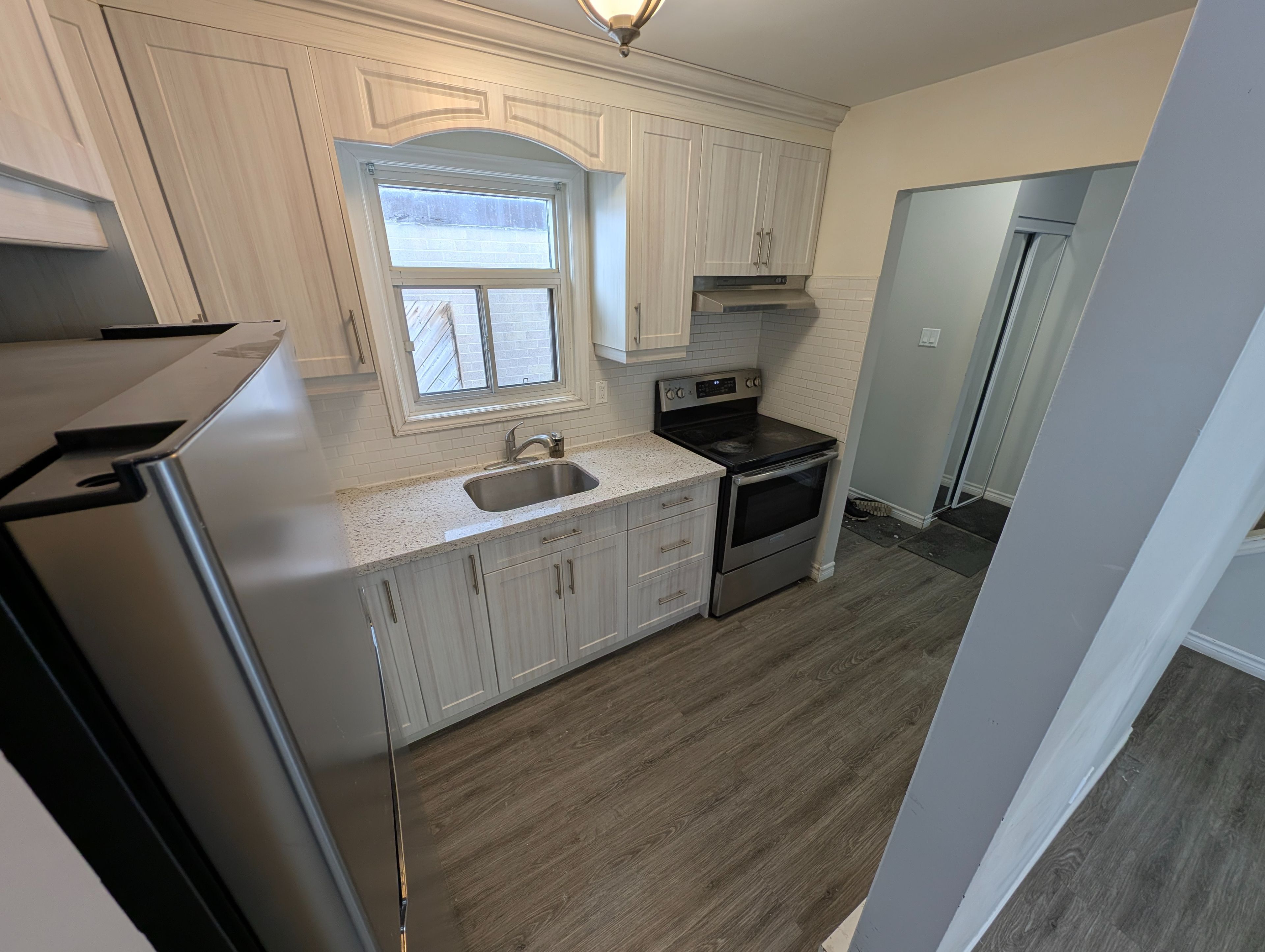 • Modern kitchen with stainless steel appliances for cooking convenience.