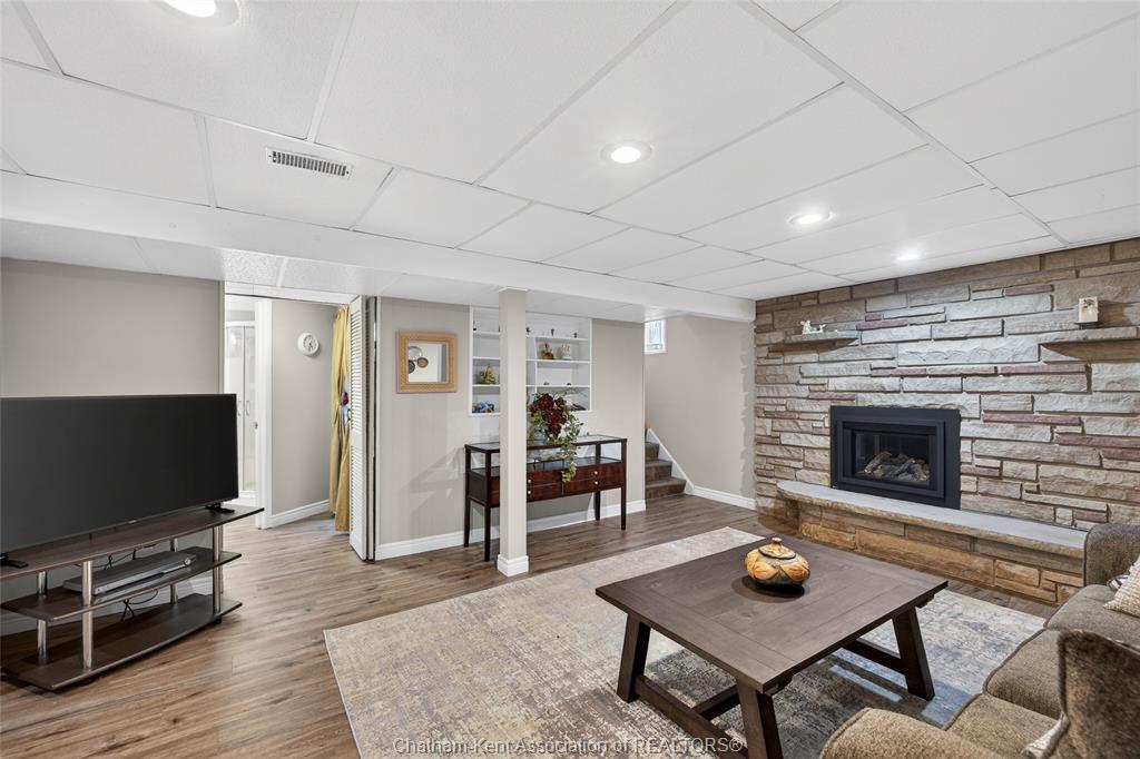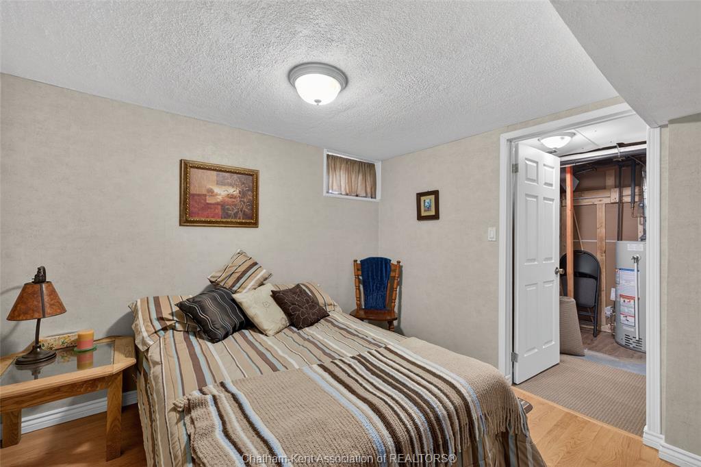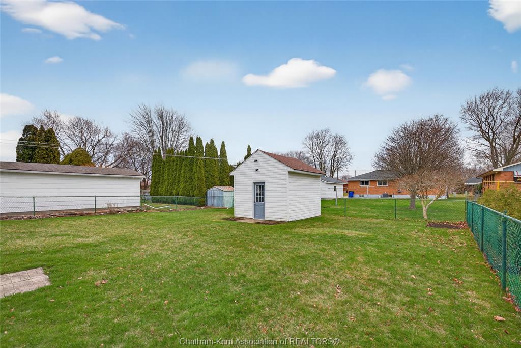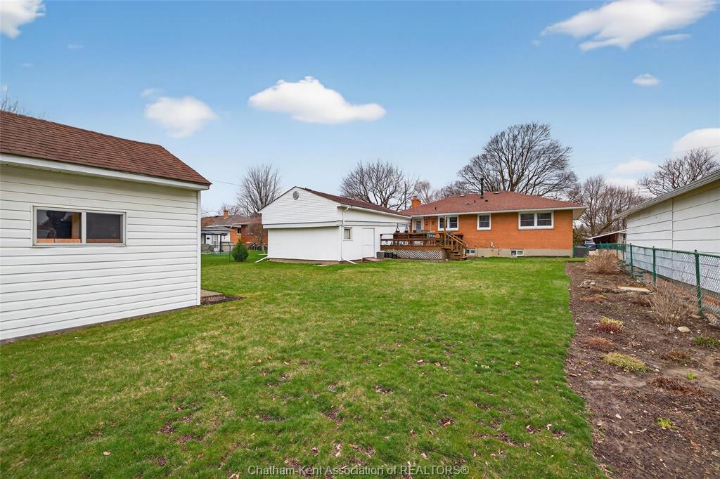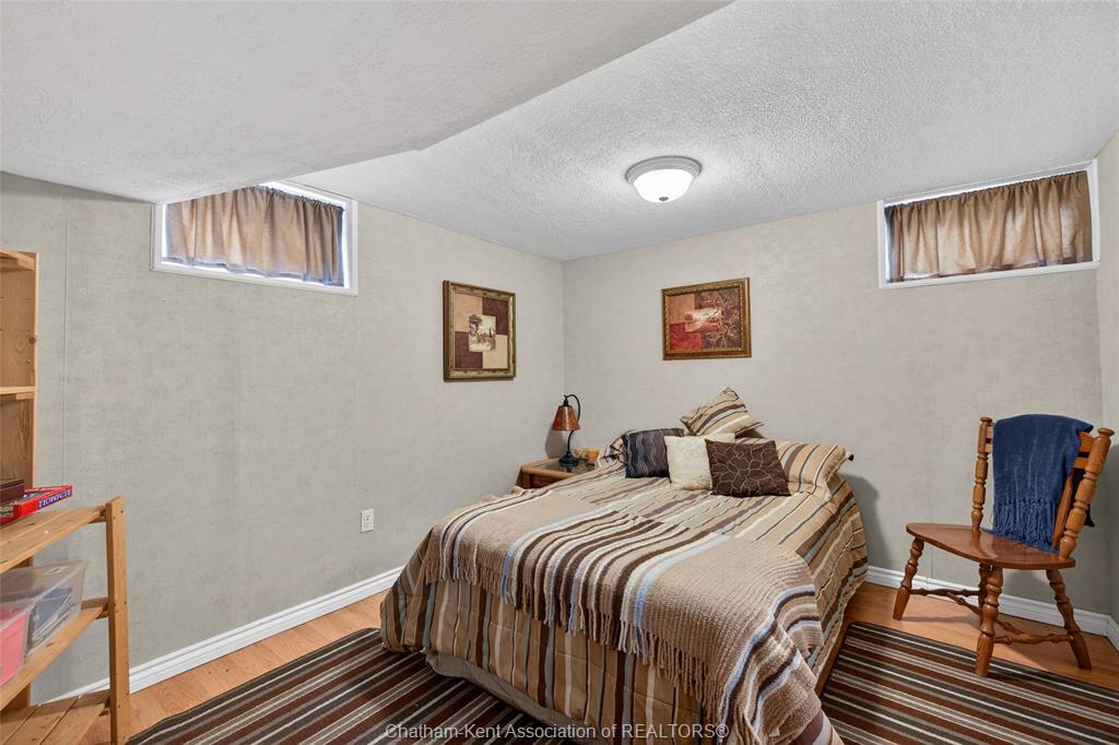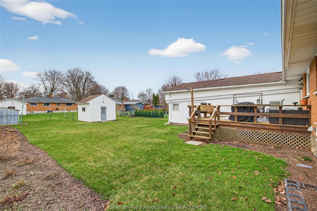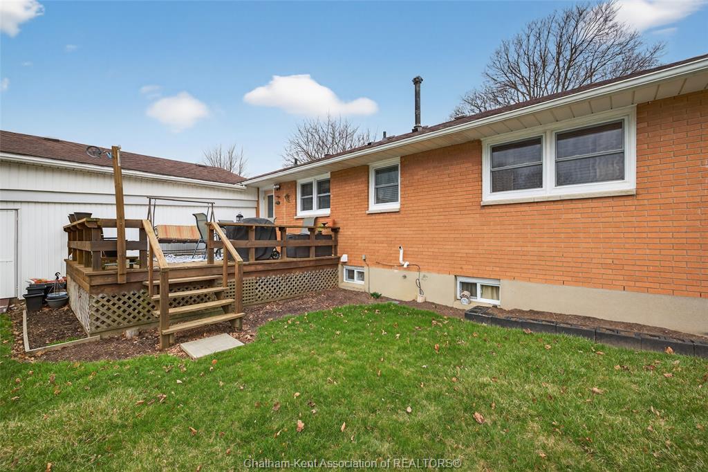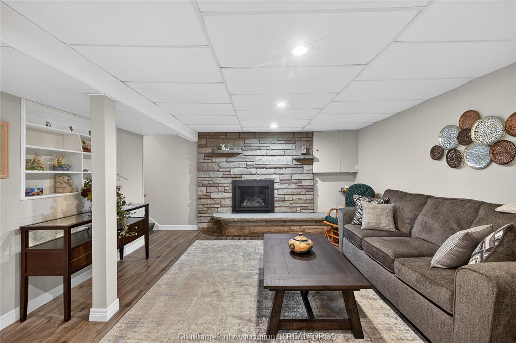 Pride of ownership shows throughout this solid brick bungalow in one of chatham's most established neighbourhoods — 2 main floor bedrooms, hardwood floors, bright living and dining area, and an updated kitchen with painted cabinetry, centre island, pendant lighting, and mudroom entry with patio doors leading to a rear deck overlooking a beautifully maintained backyard. The main floor 4-piece bath is complemented by a fully finished lower level that genuinely impresses — large rec room with stacked-stone gas fireplace, second living area, 2 additional bedrooms, and a 3-piece bath with glass shower. Four bedrooms total with a layout that suits growing families, multi-generational living, or anyone needing extra space. The oversized attached garage offers serious storage and workspace potential, a separate storage shed adds even more utility, and the wide concrete driveway ties together an outdoor package that's as functional as it is attractive.
