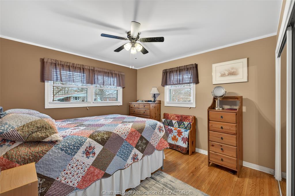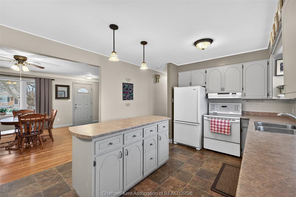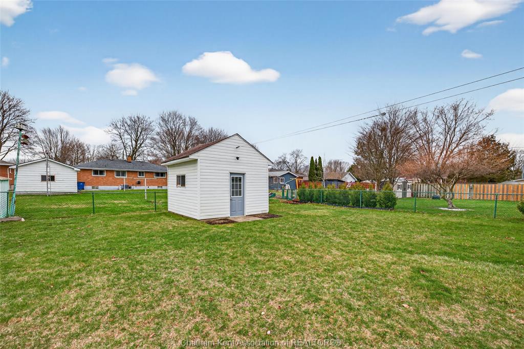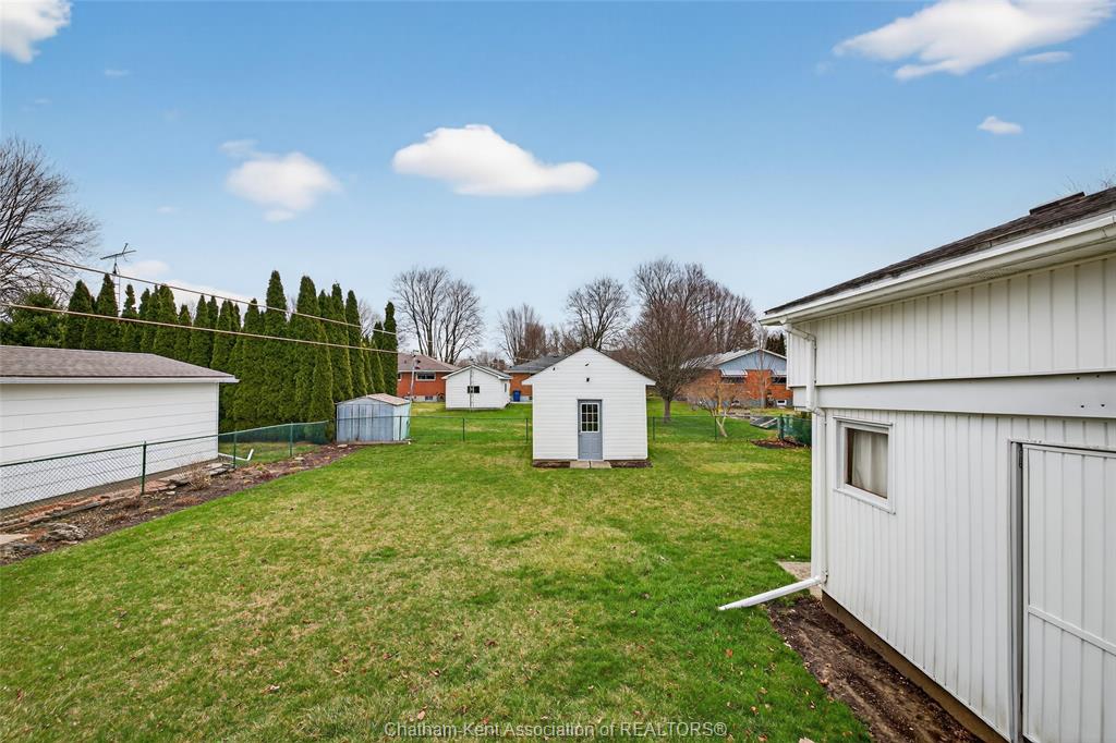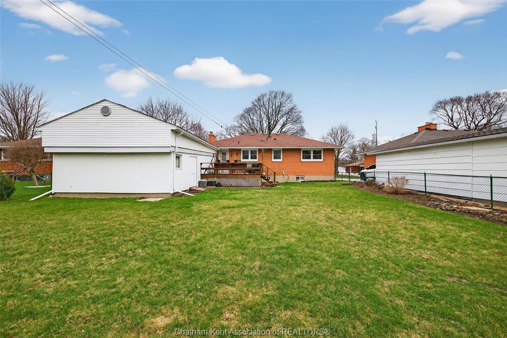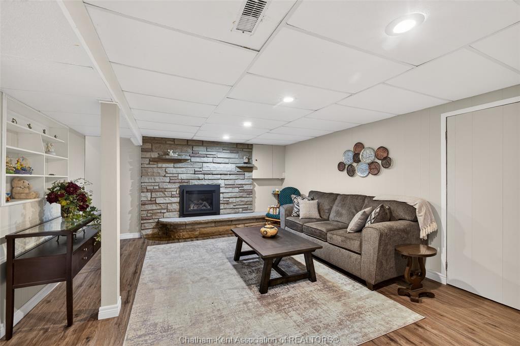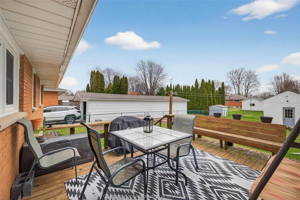 Pride of ownership shows throughout this solid brick bungalow in one of chatham's most established neighbourhoods — 2 main floor bedrooms, hardwood floors, bright living and dining area, and an updated kitchen with painted cabinetry, centre island, pendant lighting, and mudroom entry with patio doors leading to a rear deck overlooking a beautifully maintained backyard. The main floor 4-piece bath is complemented by a fully finished lower level that genuinely impresses — large rec room with stacked-stone gas fireplace, second living area, 2 additional bedrooms, and a 3-piece bath with glass shower. Four bedrooms total with a layout that suits growing families, multi-generational living, or anyone needing extra space. The oversized attached garage offers serious storage and workspace potential, a separate storage shed adds even more utility, and the wide concrete driveway ties together an outdoor package that's as functional as it is attractive.
