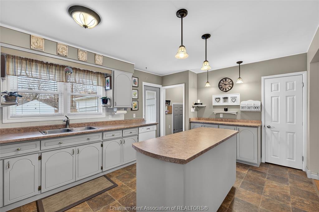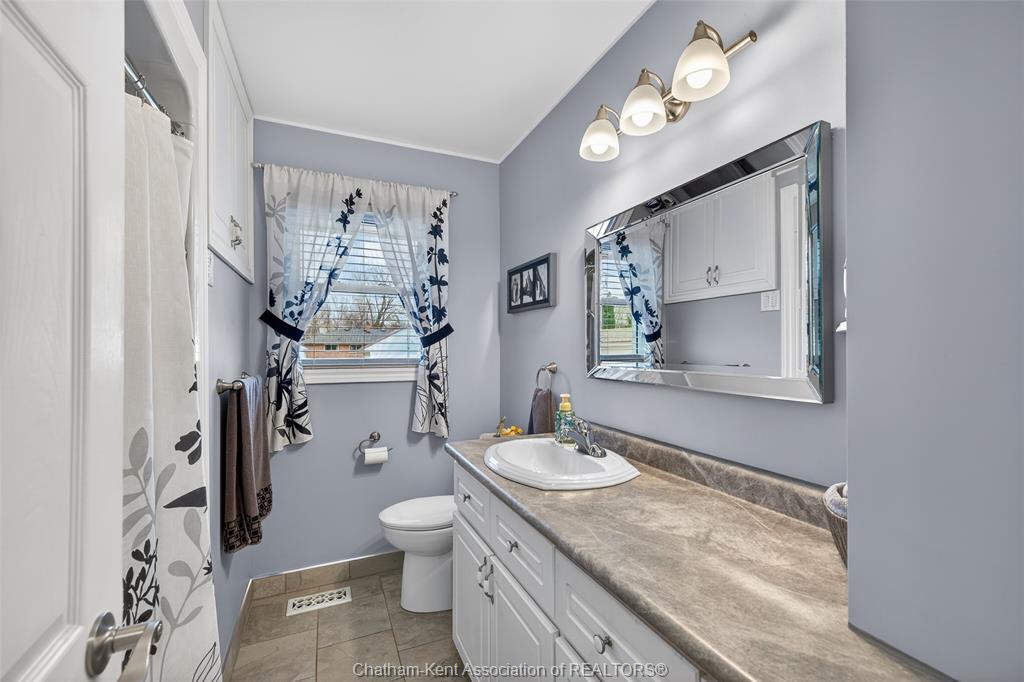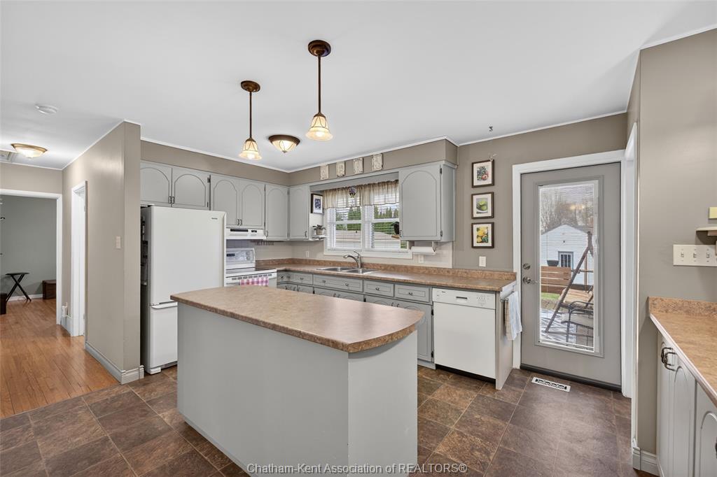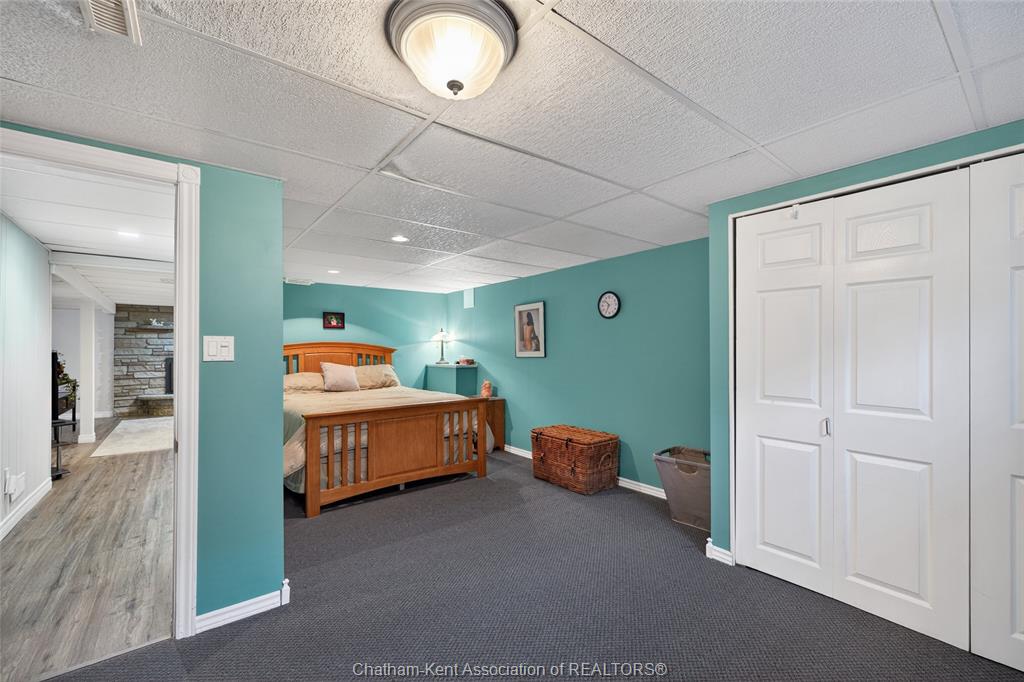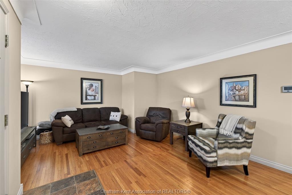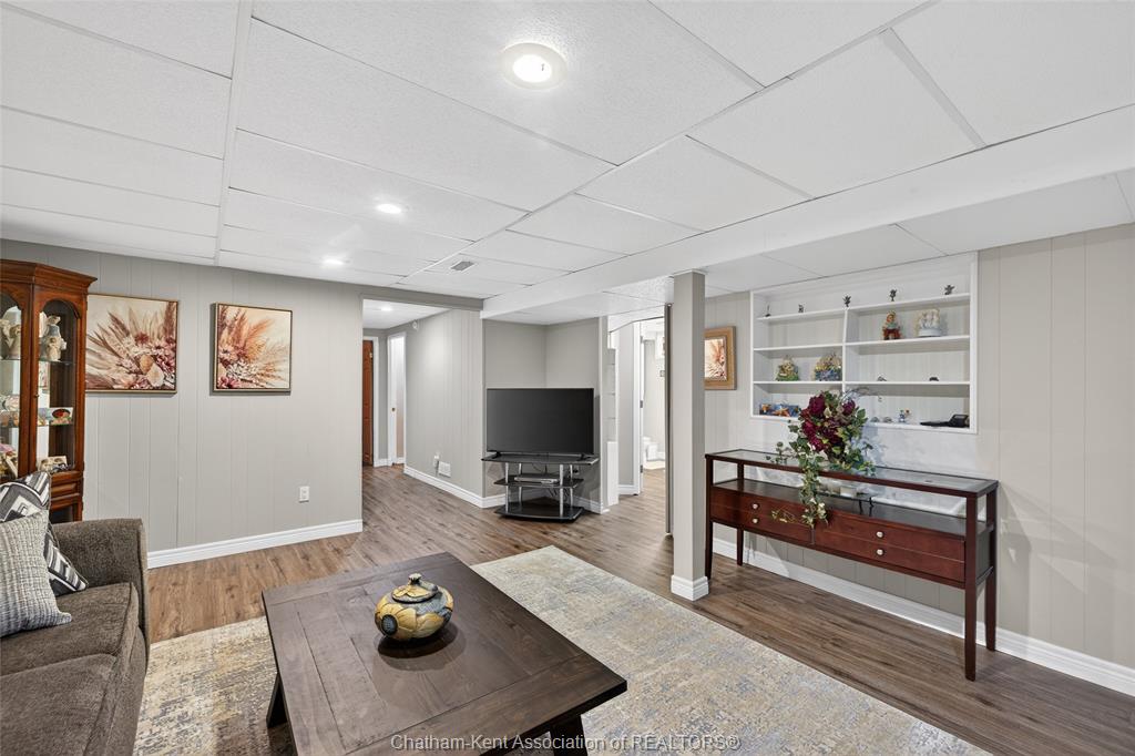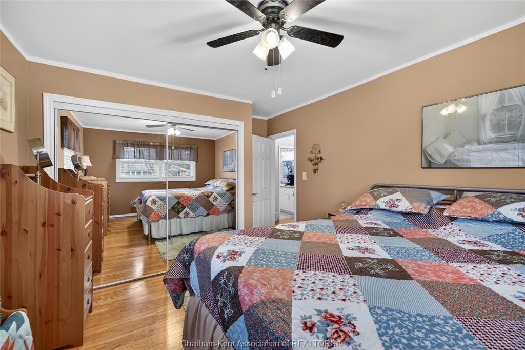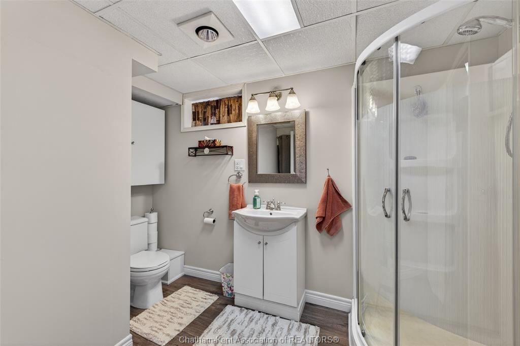 Pride of ownership shows throughout this solid brick bungalow in one of chatham's most established neighbourhoods — 2 main floor bedrooms, hardwood floors, bright living and dining area, and an updated kitchen with painted cabinetry, centre island, pendant lighting, and mudroom entry with patio doors leading to a rear deck overlooking a beautifully maintained backyard. The main floor 4-piece bath is complemented by a fully finished lower level that genuinely impresses — large rec room with stacked-stone gas fireplace, second living area, 2 additional bedrooms, and a 3-piece bath with glass shower. Four bedrooms total with a layout that suits growing families, multi-generational living, or anyone needing extra space. The oversized attached garage offers serious storage and workspace potential, a separate storage shed adds even more utility, and the wide concrete driveway ties together an outdoor package that's as functional as it is attractive.