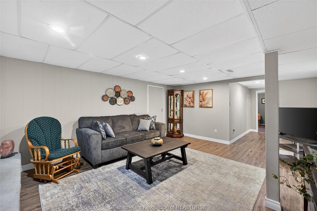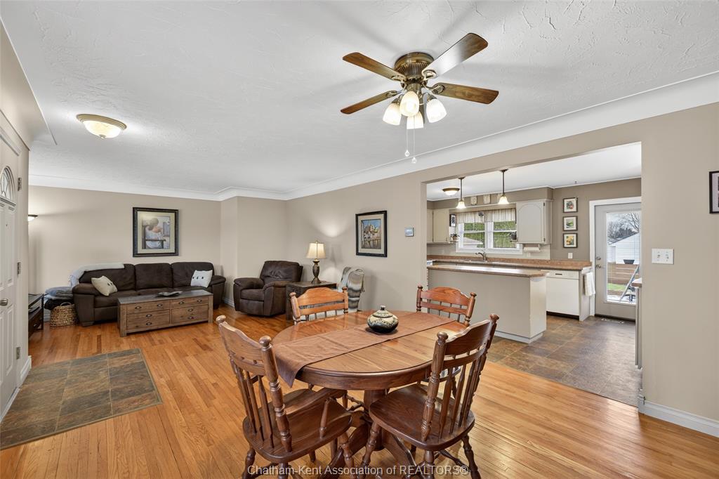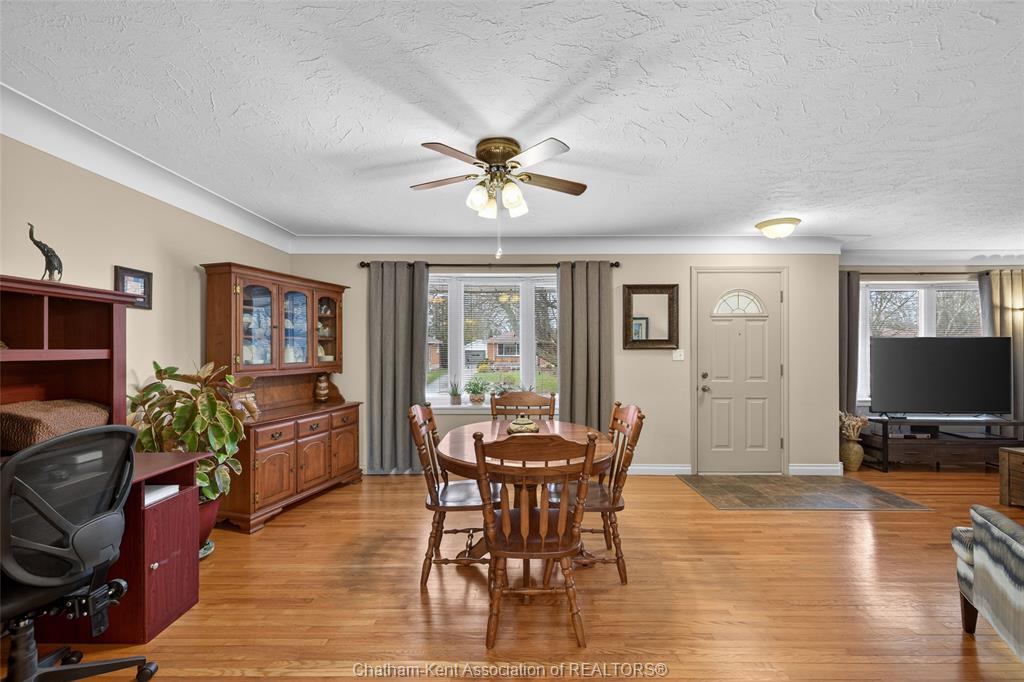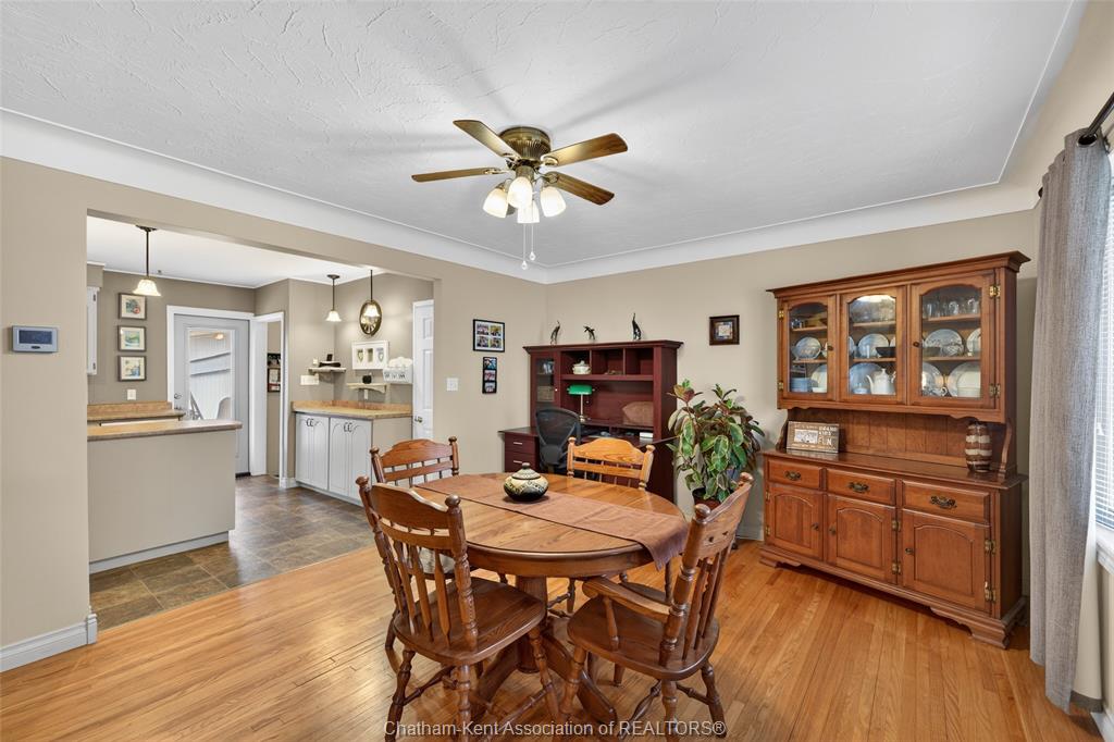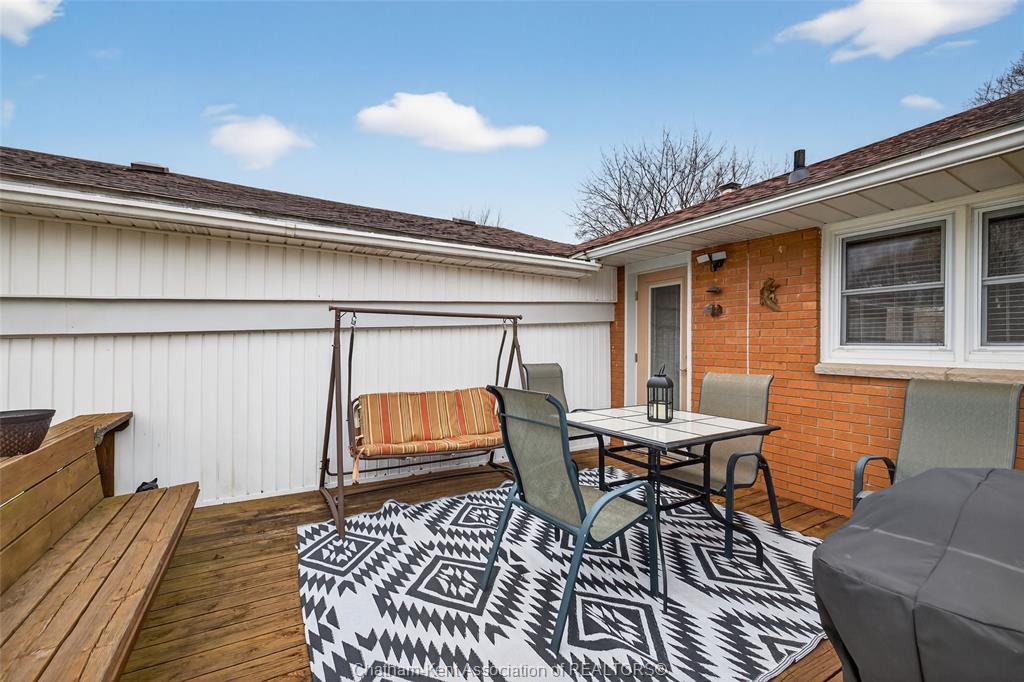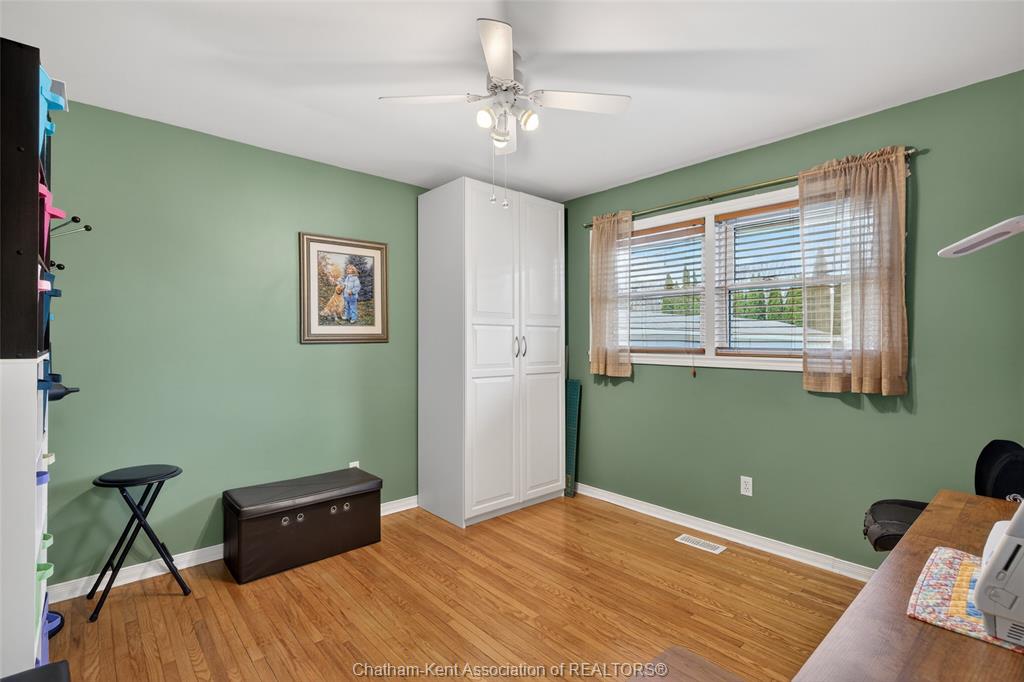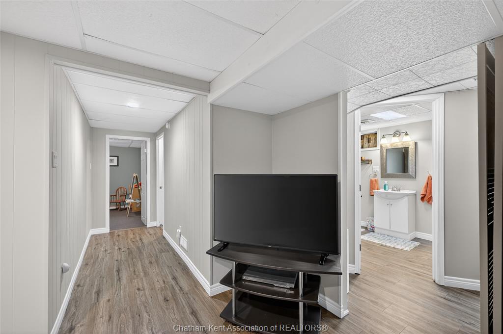 Pride of ownership shows throughout this solid brick bungalow in one of chatham's most established neighbourhoods — 2 main floor bedrooms, hardwood floors, bright living and dining area, and an updated kitchen with painted cabinetry, centre island, pendant lighting, and mudroom entry with patio doors leading to a rear deck overlooking a beautifully maintained backyard. The main floor 4-piece bath is complemented by a fully finished lower level that genuinely impresses — large rec room with stacked-stone gas fireplace, second living area, 2 additional bedrooms, and a 3-piece bath with glass shower. Four bedrooms total with a layout that suits growing families, multi-generational living, or anyone needing extra space. The oversized attached garage offers serious storage and workspace potential, a separate storage shed adds even more utility, and the wide concrete driveway ties together an outdoor package that's as functional as it is attractive.