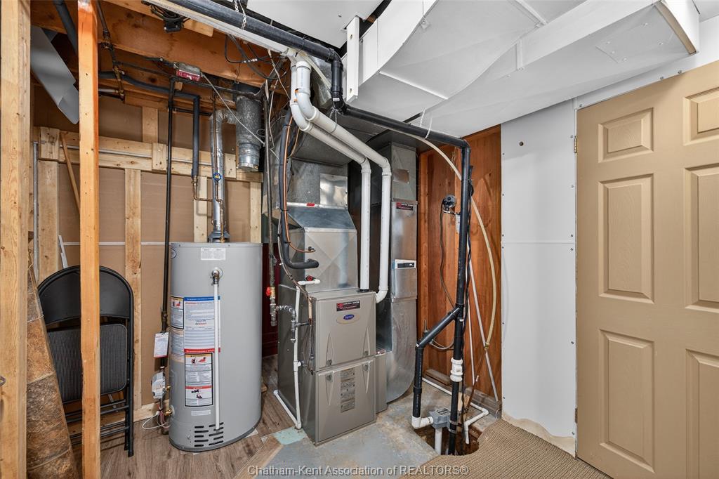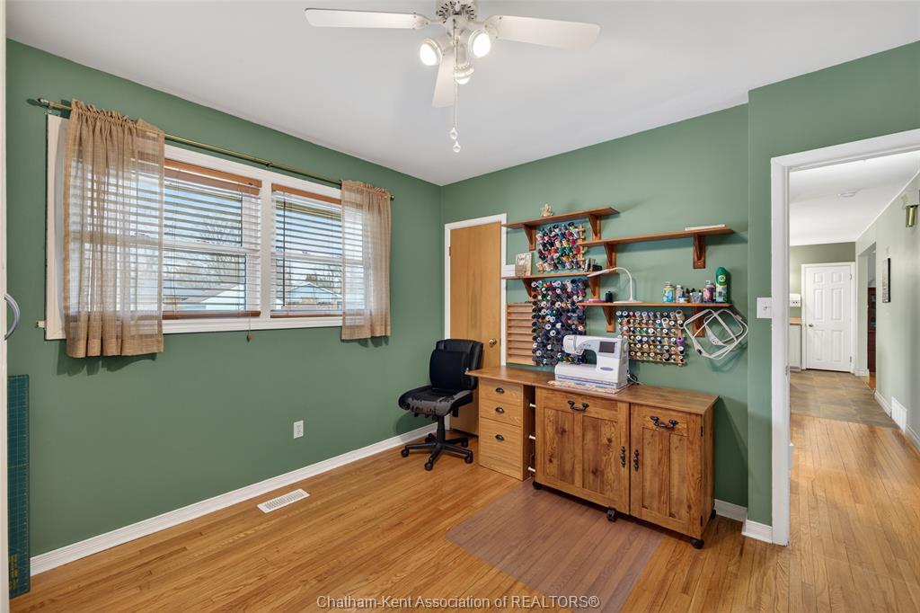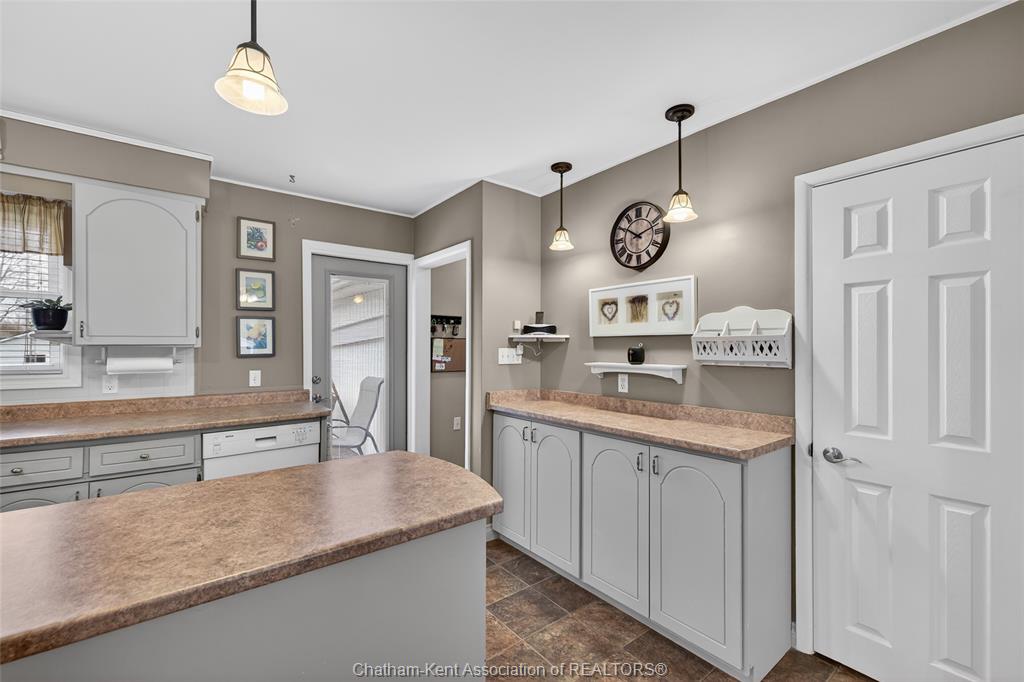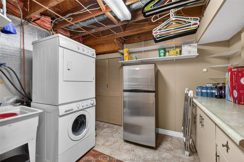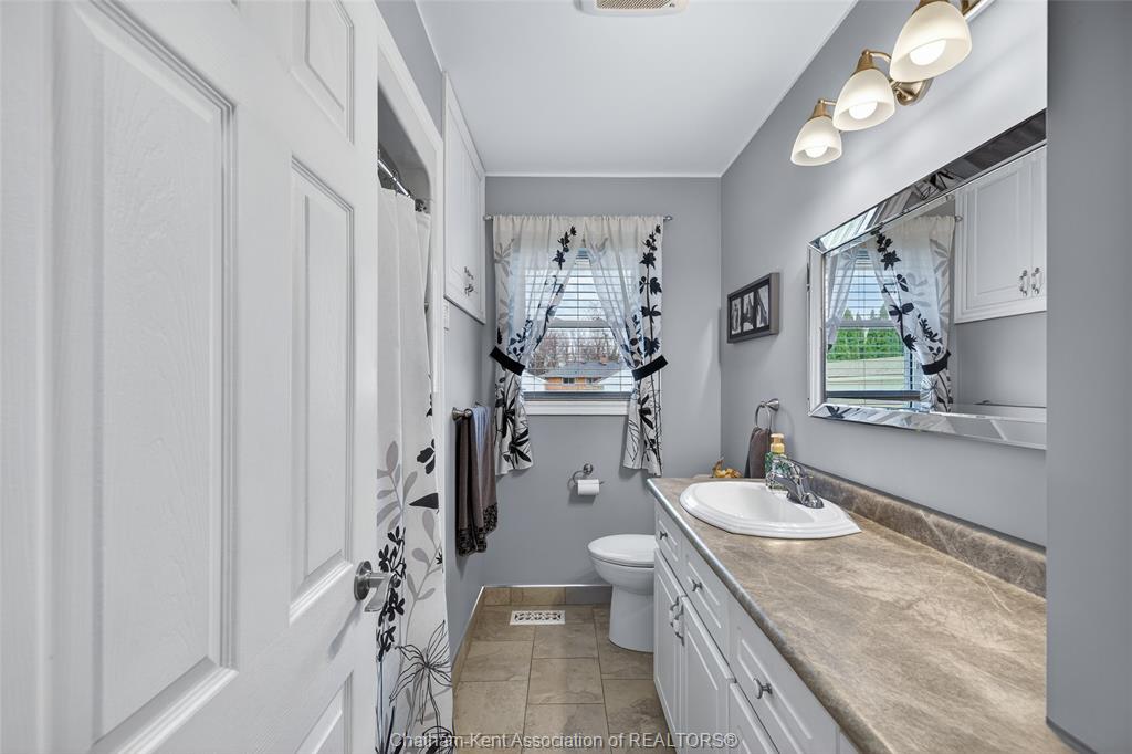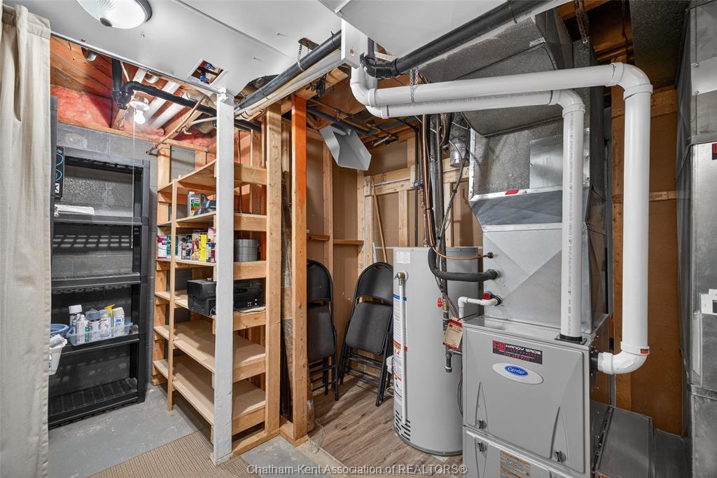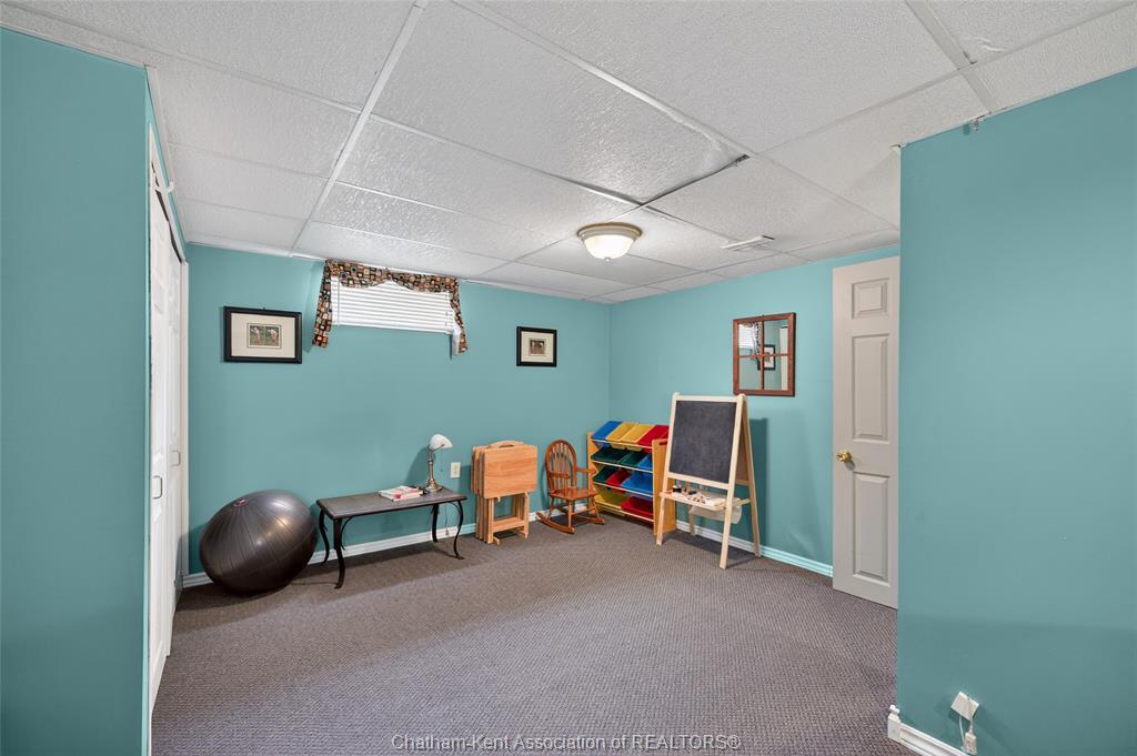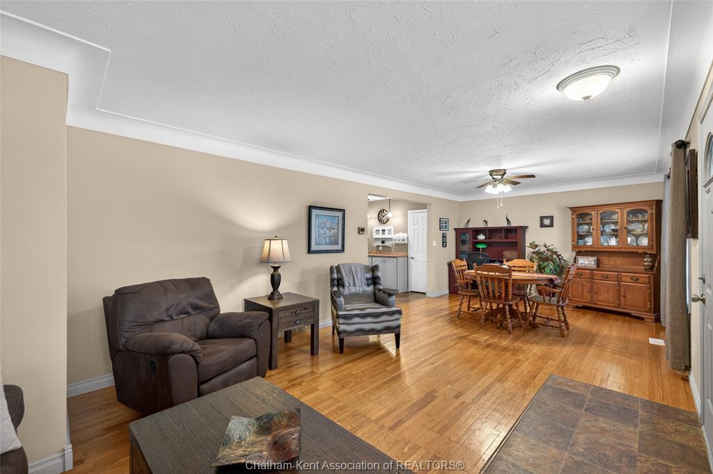 Pride of ownership shows throughout this solid brick bungalow in one of chatham's most established neighbourhoods — 2 main floor bedrooms, hardwood floors, bright living and dining area, and an updated kitchen with painted cabinetry, centre island, pendant lighting, and mudroom entry with patio doors leading to a rear deck overlooking a beautifully maintained backyard. The main floor 4-piece bath is complemented by a fully finished lower level that genuinely impresses — large rec room with stacked-stone gas fireplace, second living area, 2 additional bedrooms, and a 3-piece bath with glass shower. Four bedrooms total with a layout that suits growing families, multi-generational living, or anyone needing extra space. The oversized attached garage offers serious storage and workspace potential, a separate storage shed adds even more utility, and the wide concrete driveway ties together an outdoor package that's as functional as it is attractive.