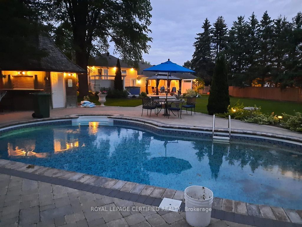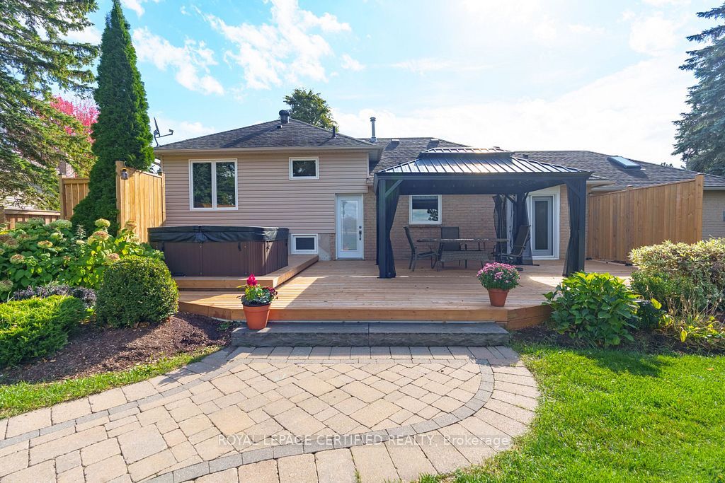 Welcome home to this cozy 3 bedroom family gem . The upper level offers 3 spacious bedrooms, a 4-pc bath with heated floor. Primary br with double closets. The main floor flows beautifully with ceramic tile from the entrance through the bright, updated kitchen and hardwood floors in the cozy living and dining rooms. Living room with gas fireplace and skylight. Step outside to a brand-new 2-level deck (2025) with hot tub perfect for family fun. The private backyard oasis features a heated inground kidney-shaped pool, change house and garden shed with no homes behind. A separate entrance leads to the lower level with family room, office, gas fireplace, 3-pc bath with heated floor, and large windows. The basement adds a rec room, 5th bedroom, heated floors and laundry. The 2-car garage is converted to a 6. 1 x 5. 49 metre nanny suite with gas fireplace and 3-pc bath and kitchen (kitchen needs stove pug outlet). Interlocking stone (2020) and 200-amp service complete this wonderful home. Listing brokerage or seller does not warrant the retrofit status of garage nanny suite.